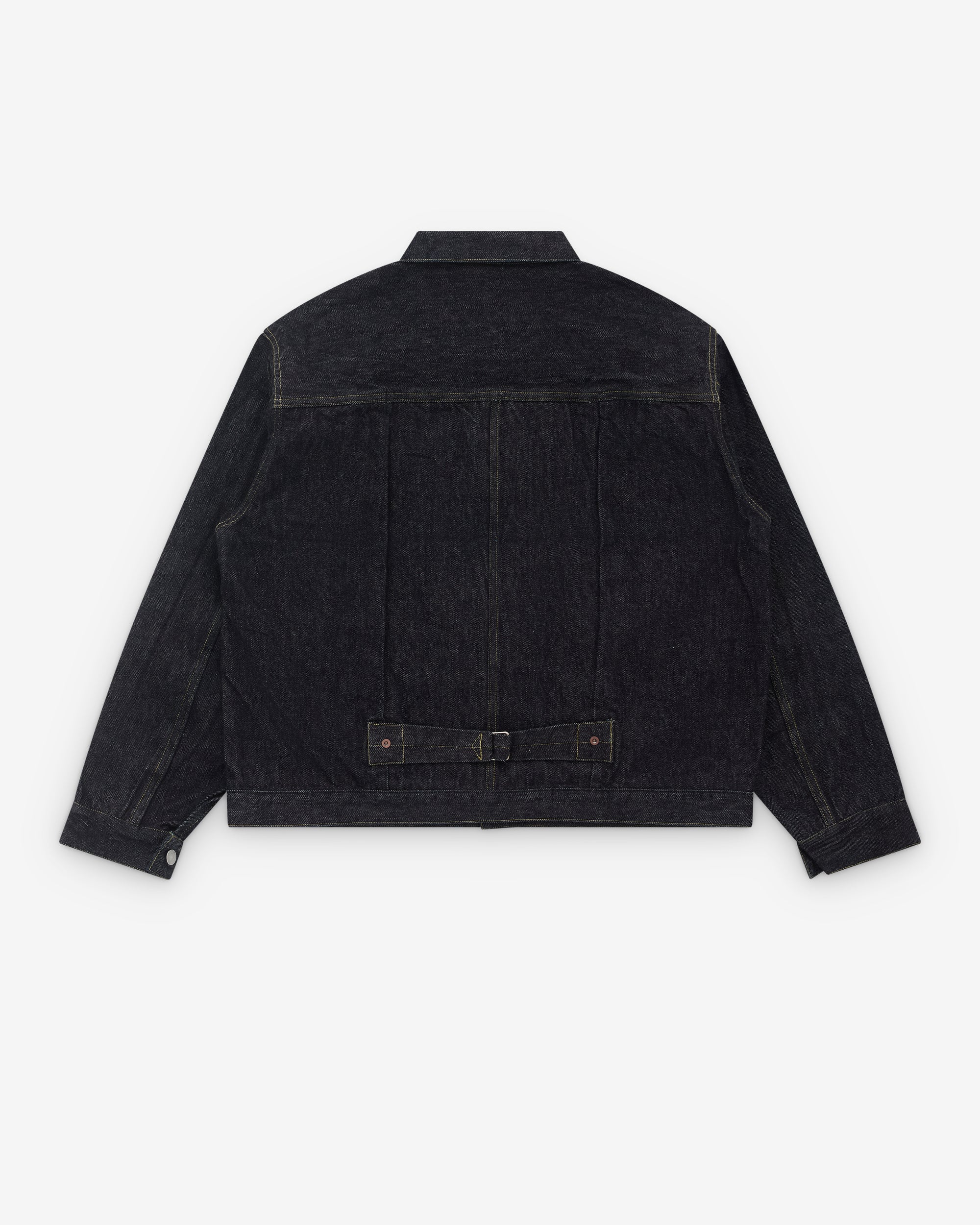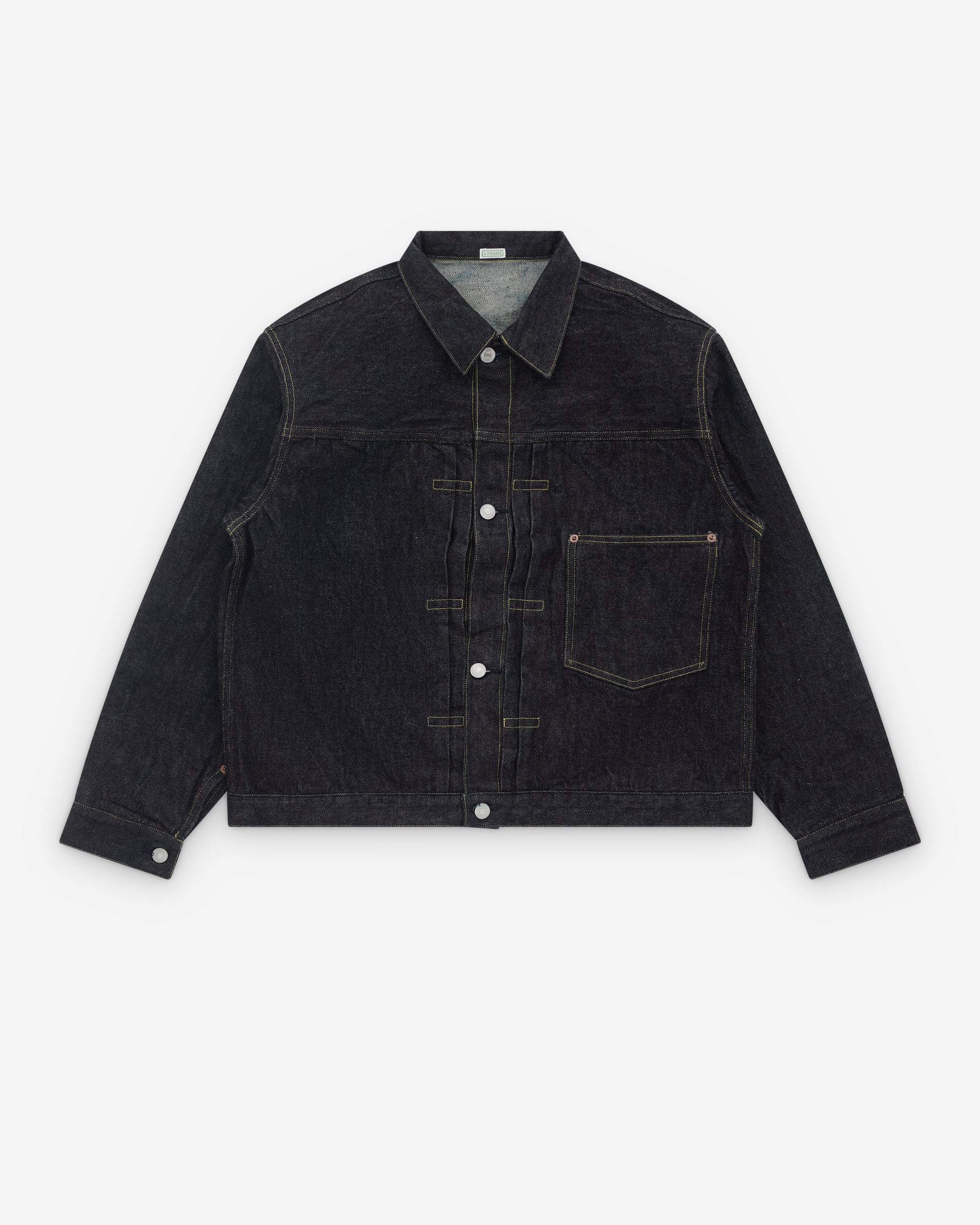 13.5z Kibata denimClassic collarFront metal button closureSingle chest pocketType 1 denim jacket silhouetteProduced with raw denim