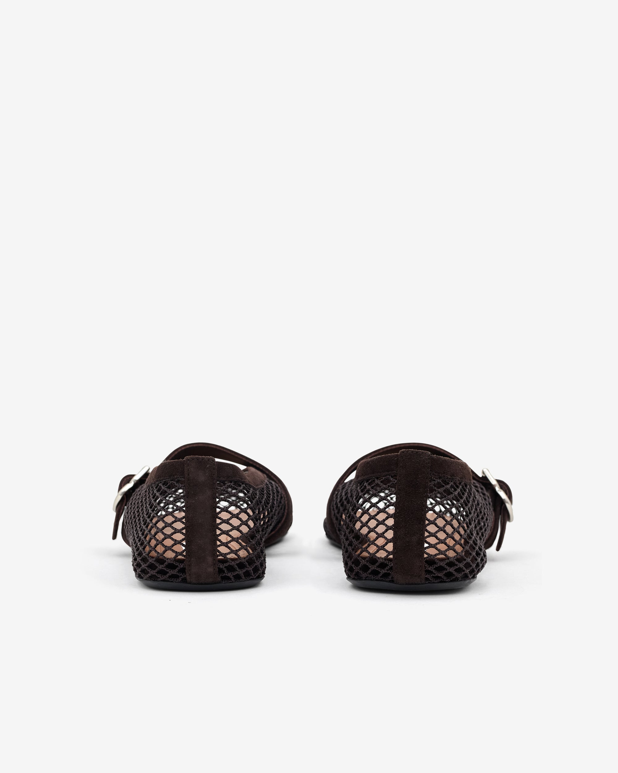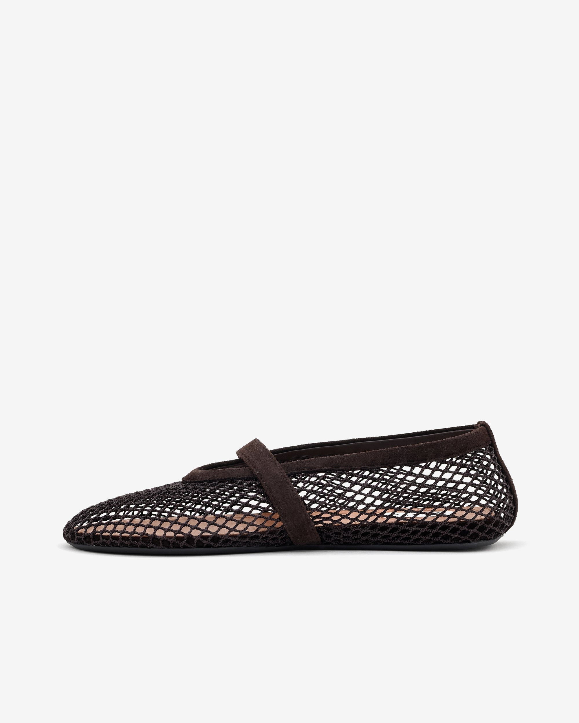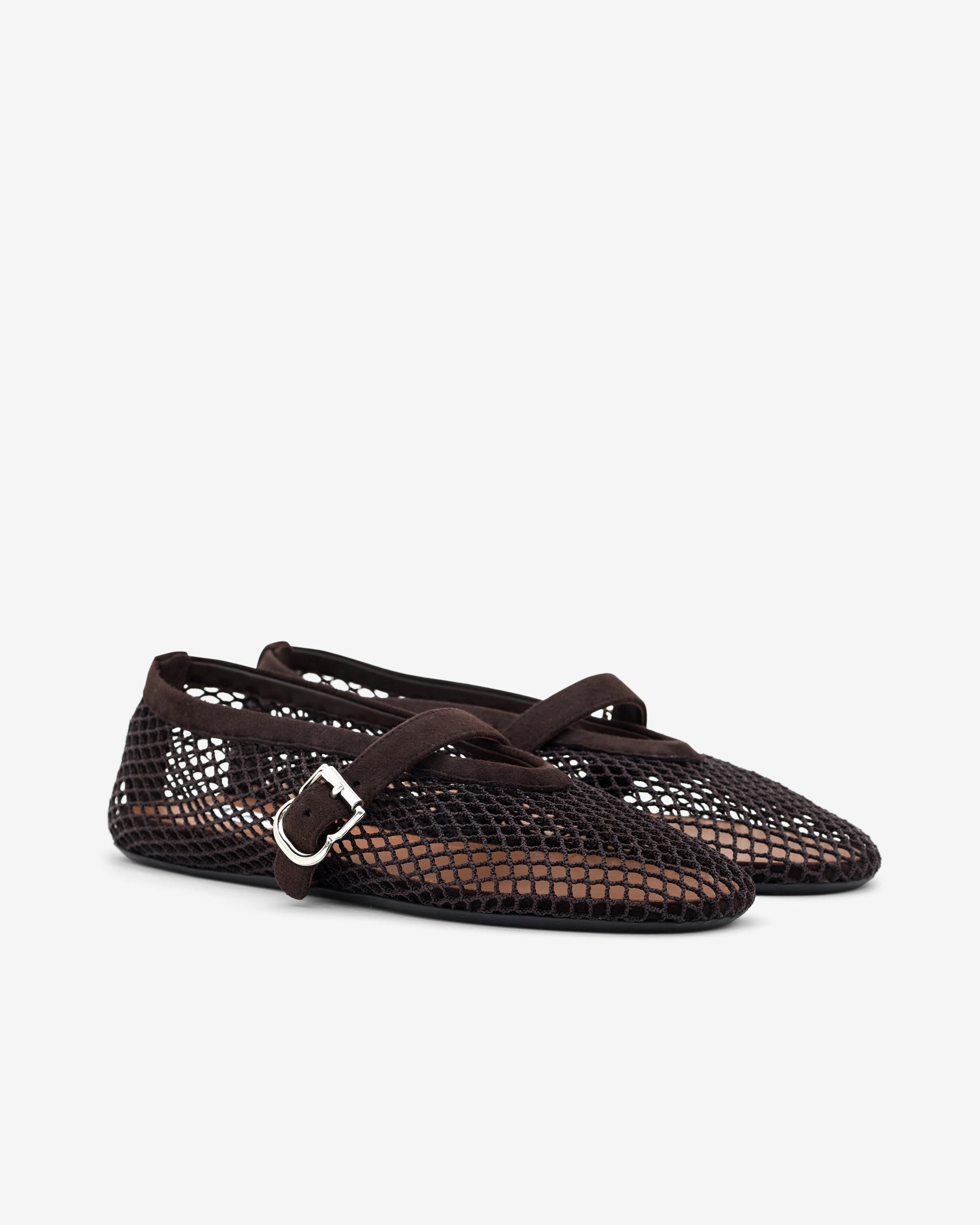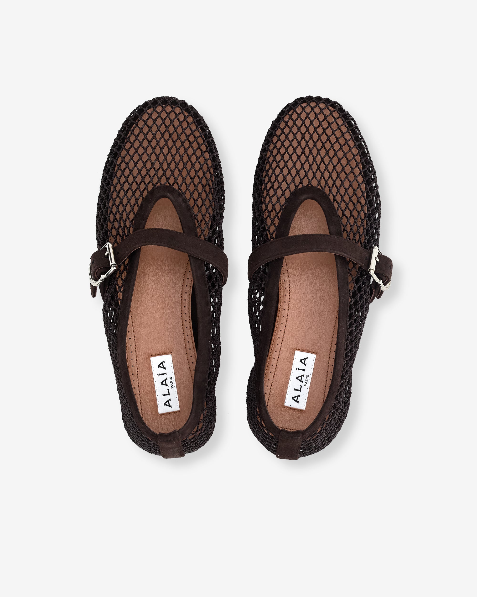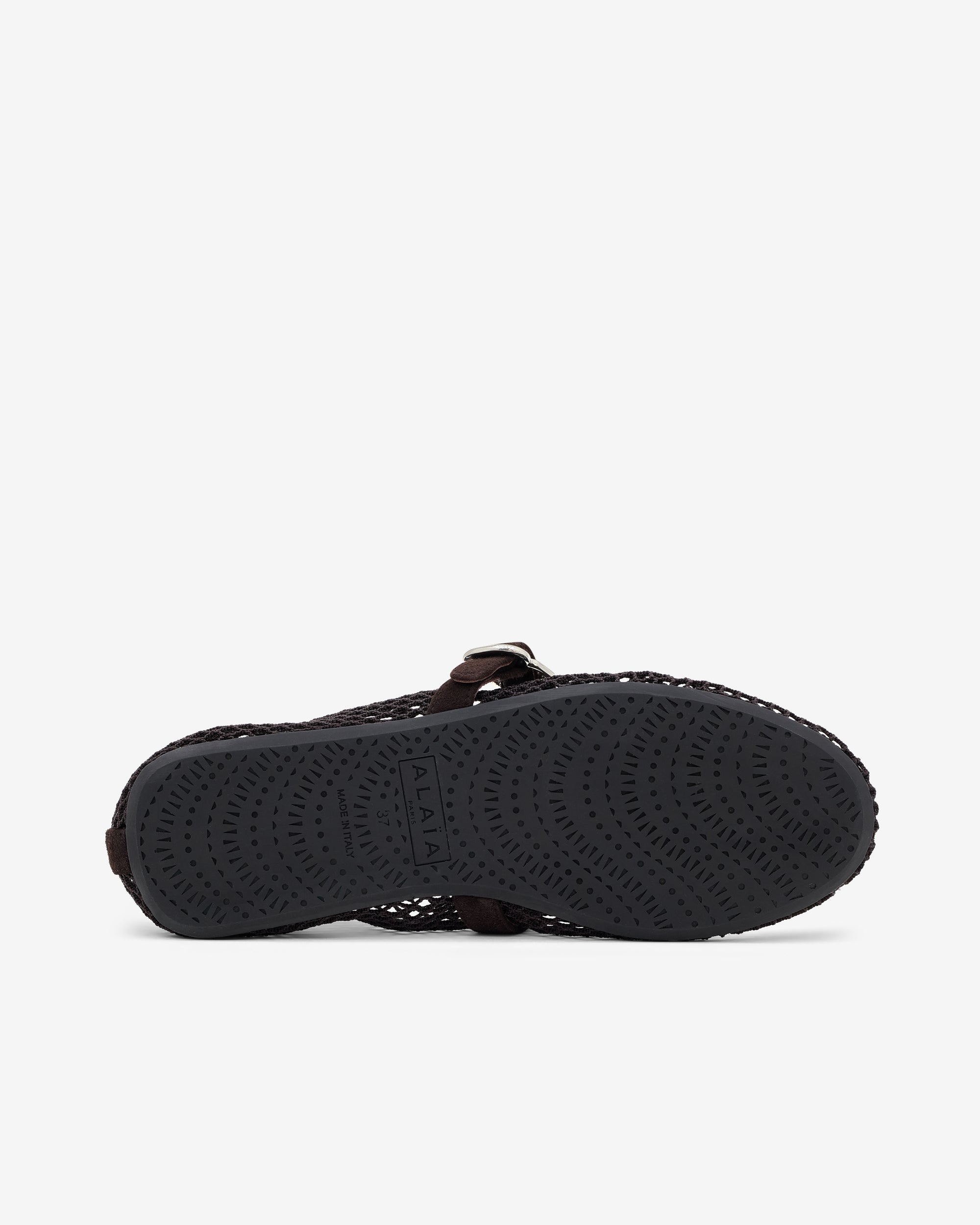 Signature Alaïa ballet flats inspired by classical Japanese shoesBuckle strap on top, round toes, rubber soleFishnet textile & suede goatskin leather