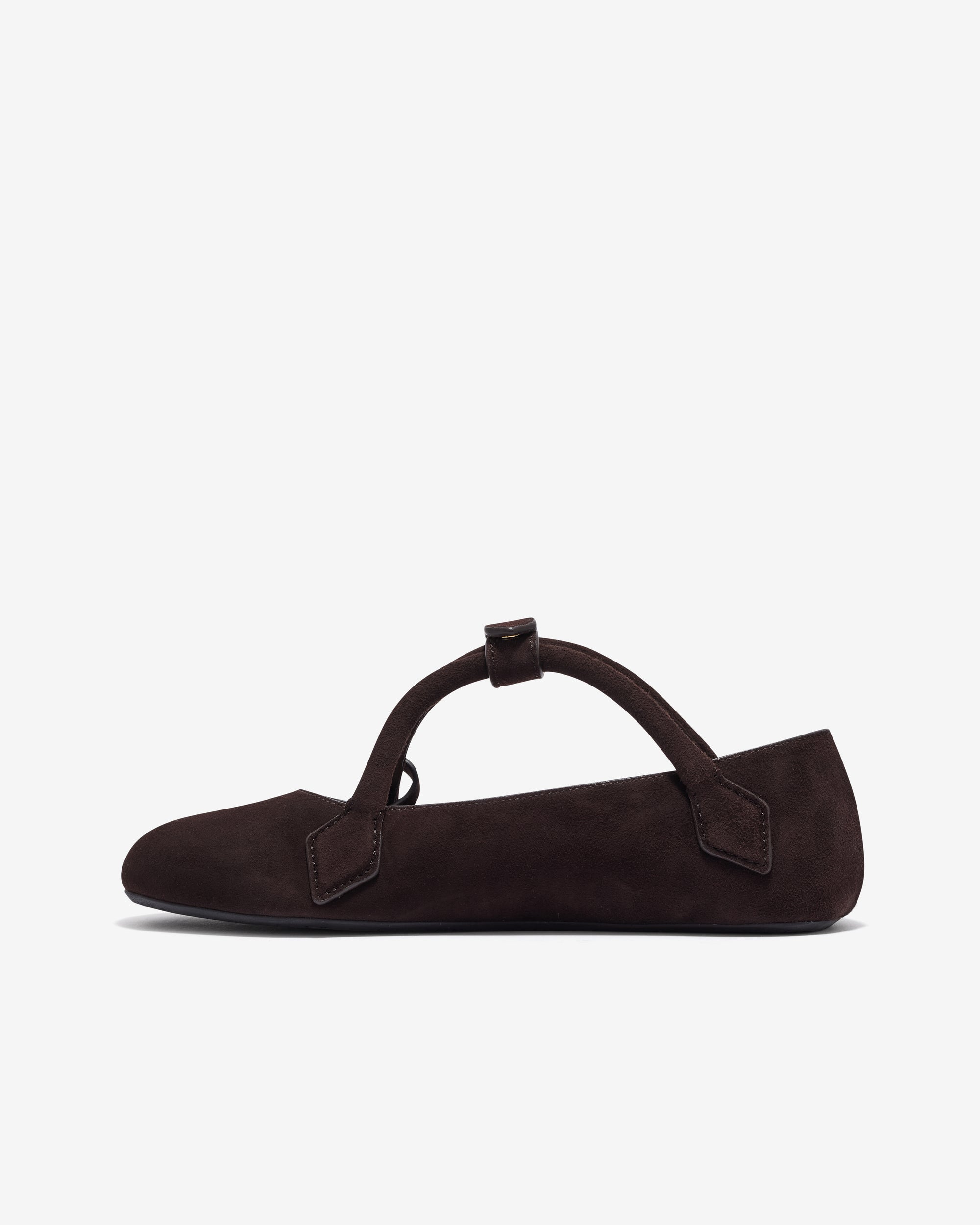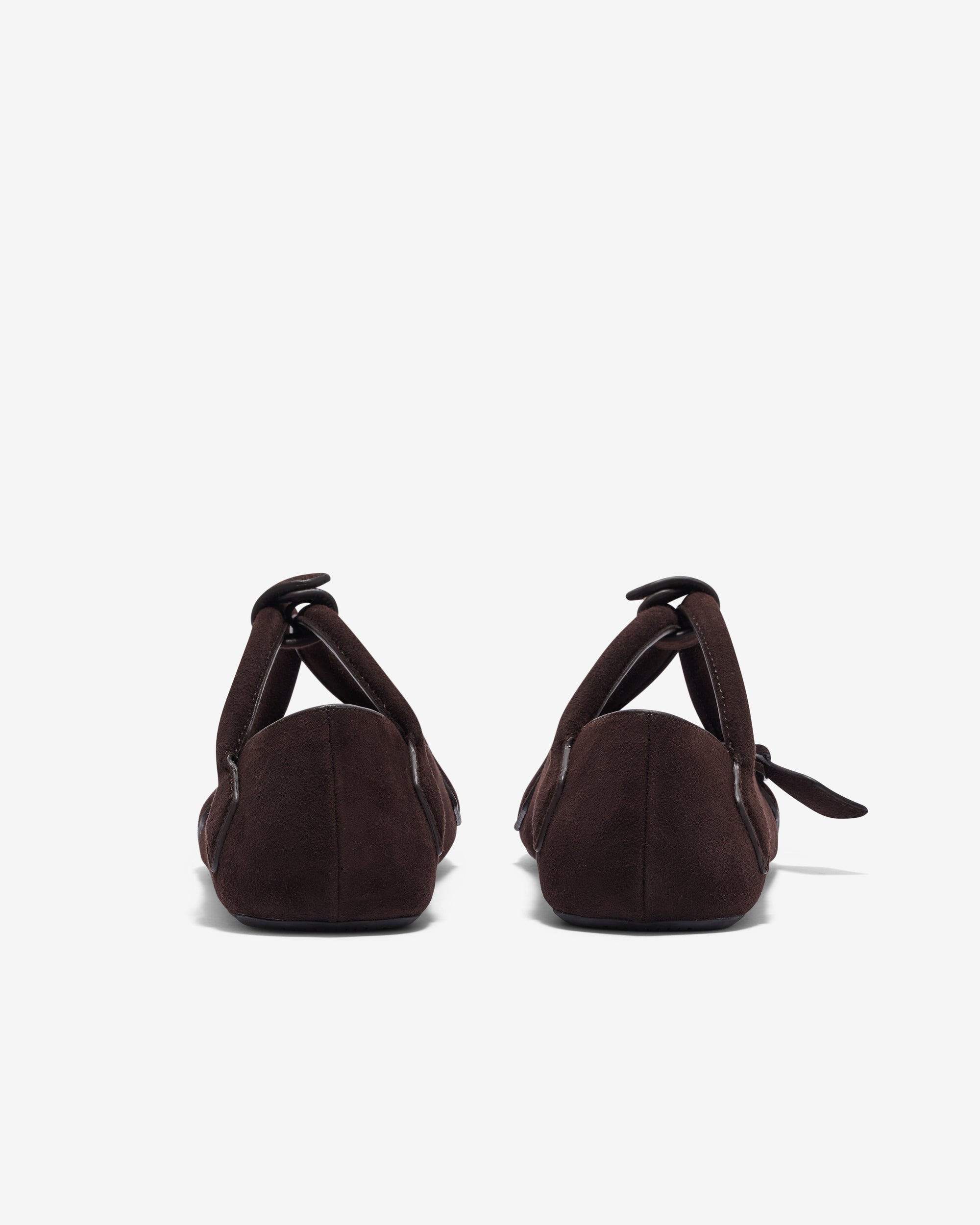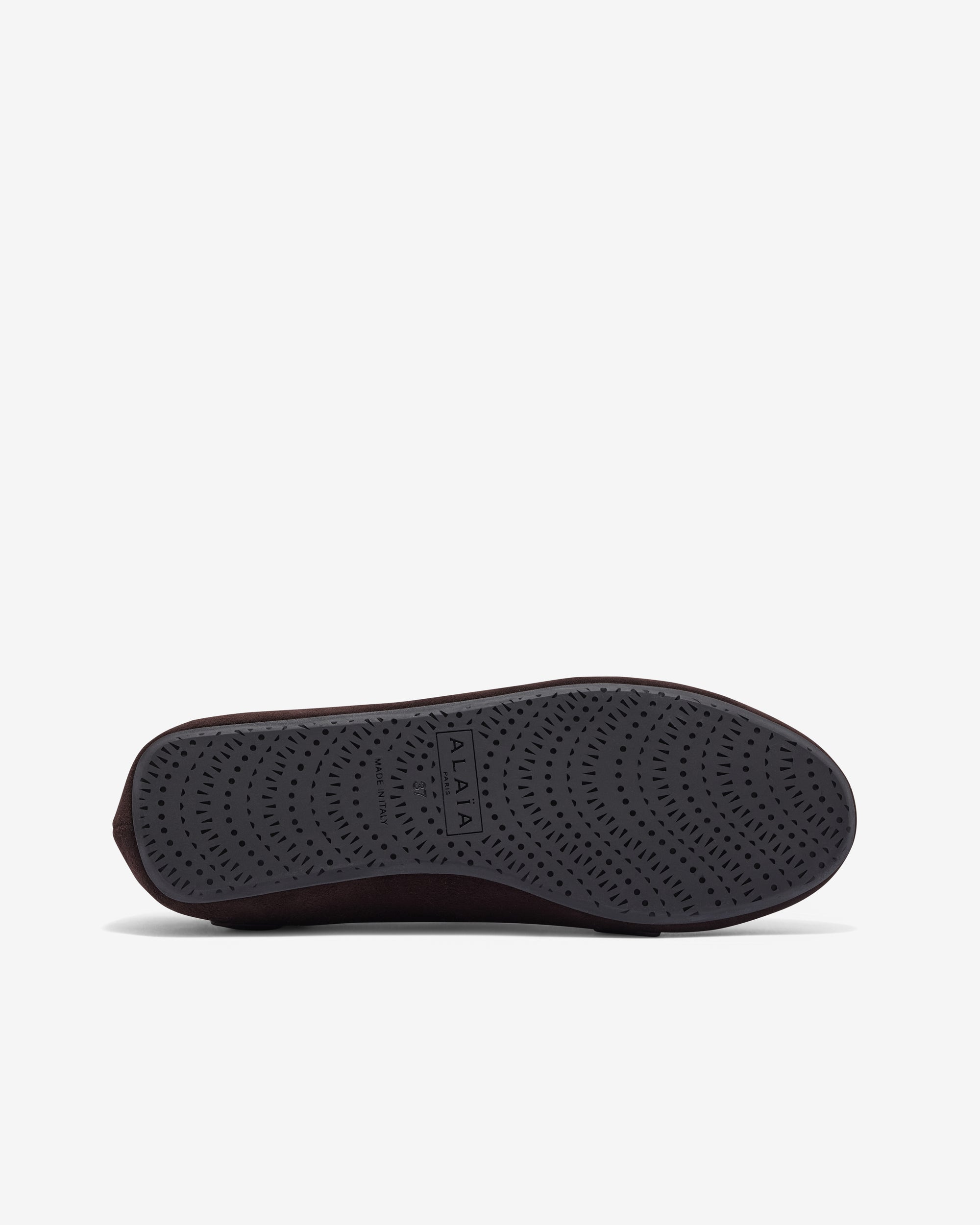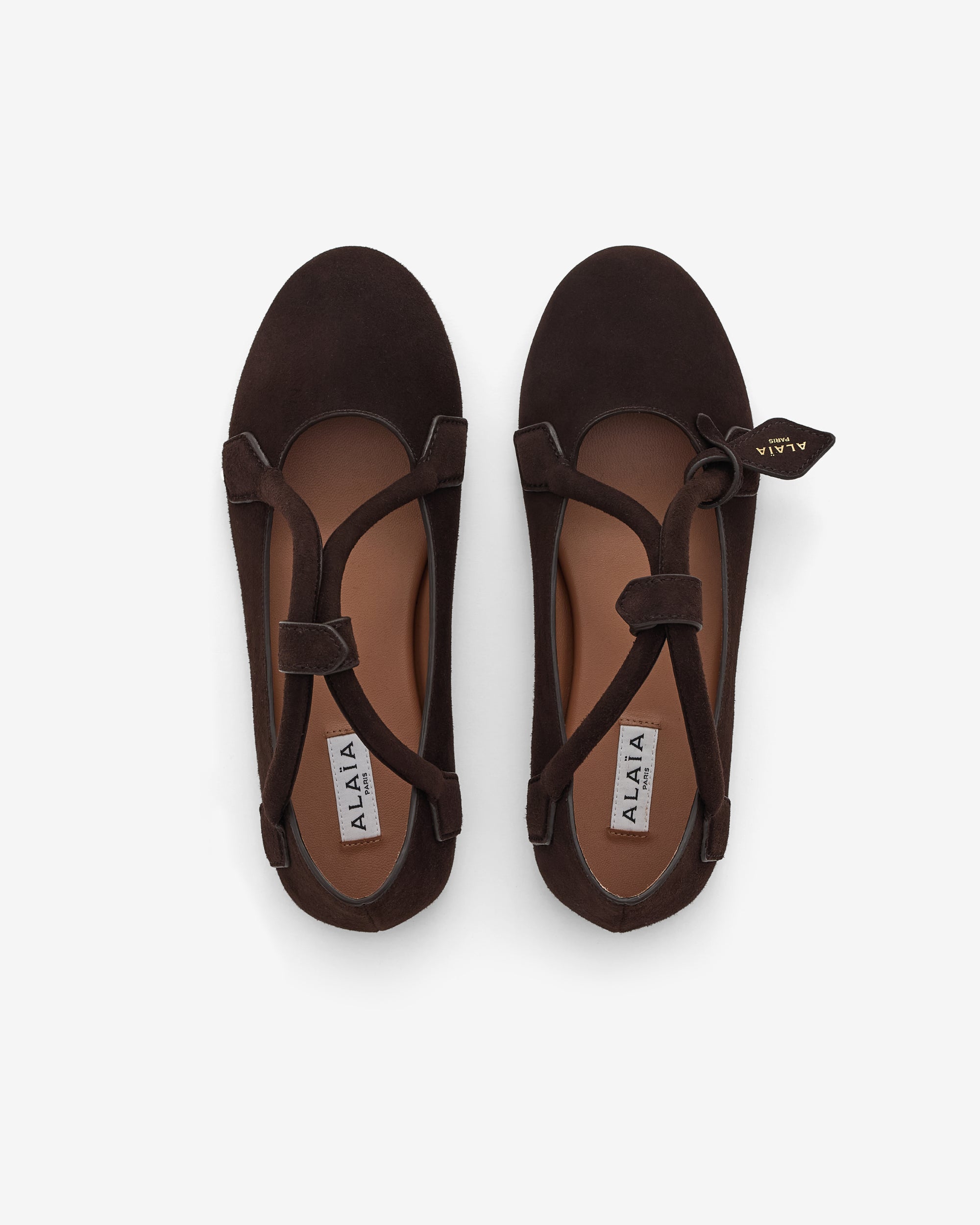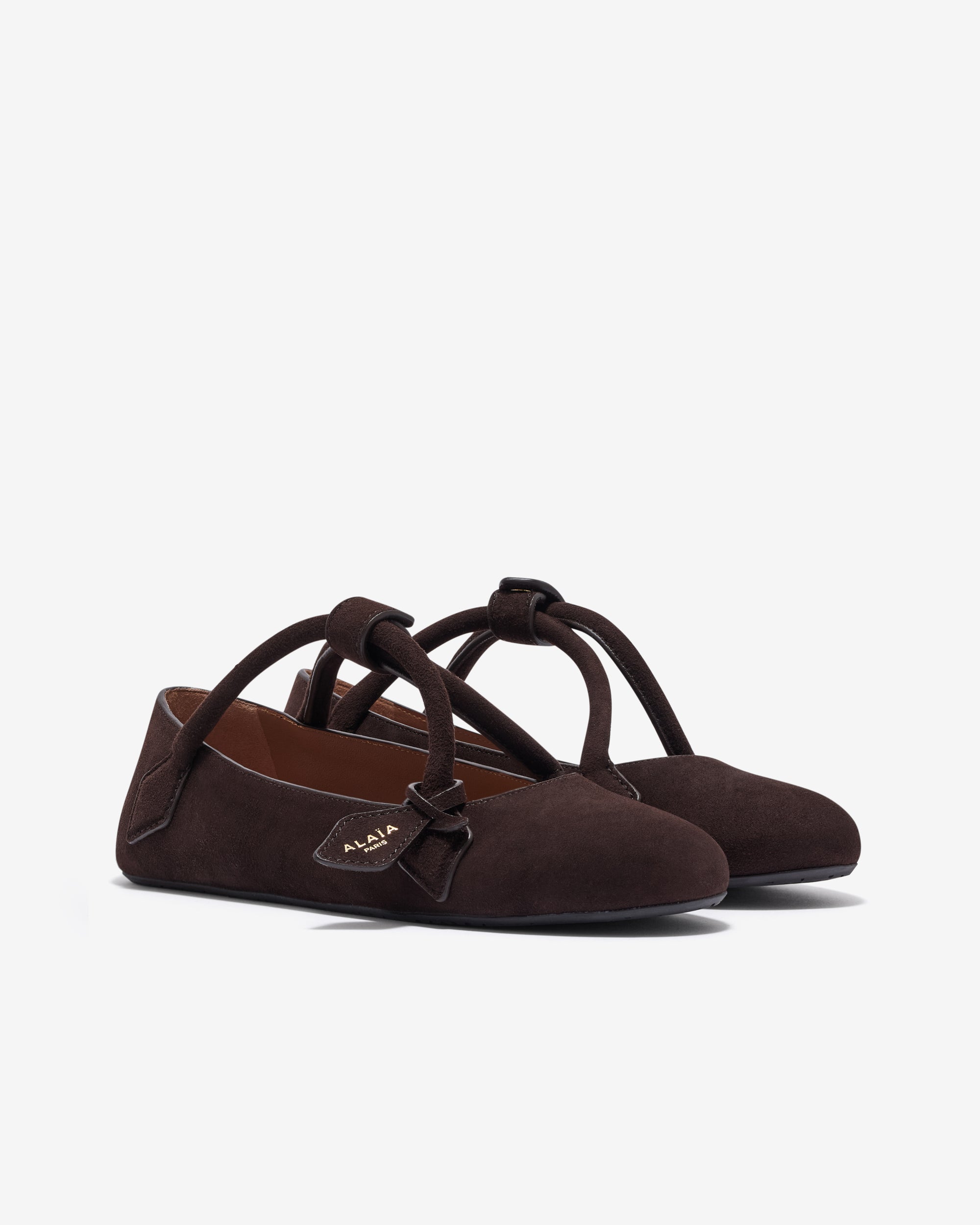 Round toe ballet flats playing with the signature details of Le Teckel bagElongated straps accross the top of the shoe and Alaïa tagRubber soleSuede goatskin leather