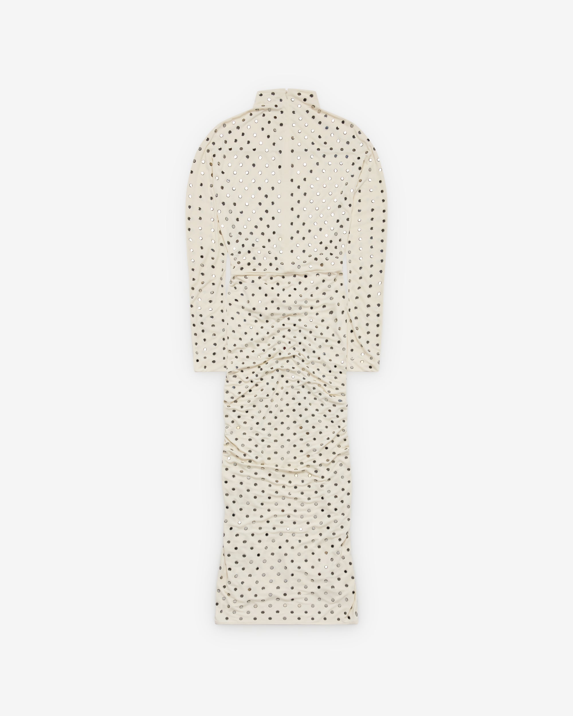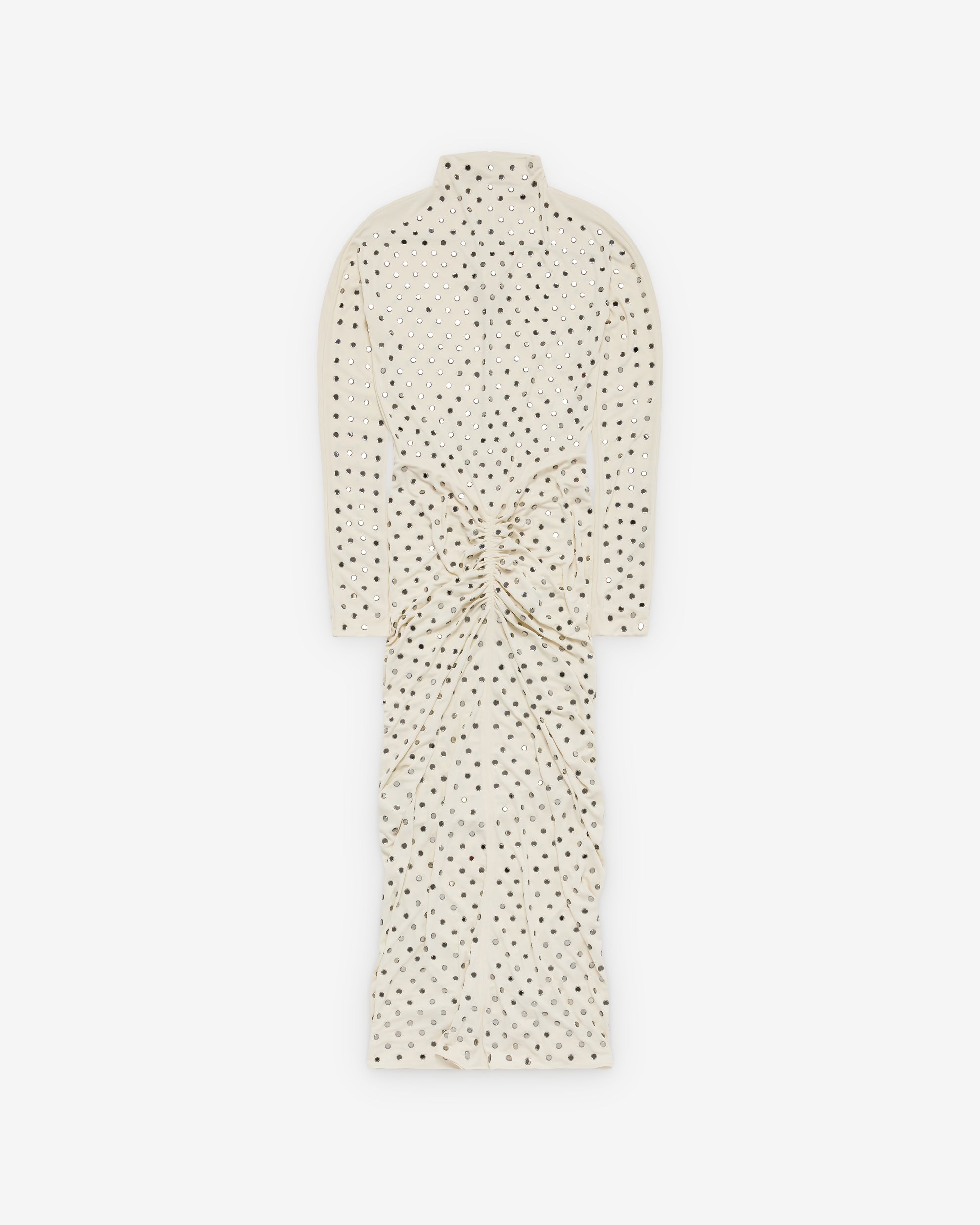 Draped long sleeve dress in fluid strass jerseyMaxi length, high neck, long sleeves, column silhouetteBodycon fit cinched at the waistInvisible side zip closure, unlined