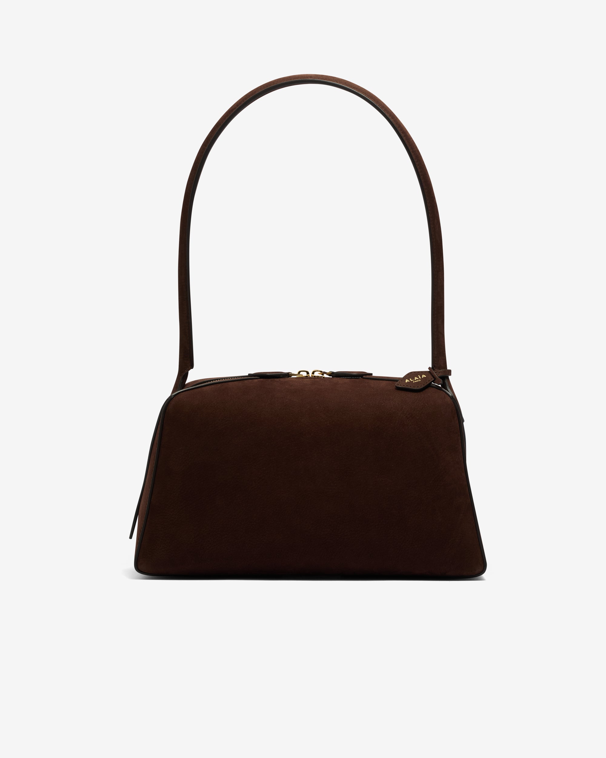 Bowling shoulder bagDiagonal tubular handle with decorative tiesDouble zip closureSoft feel nubuck calfskin leatherDimensions (cm): L 32 x H 17 x D 15