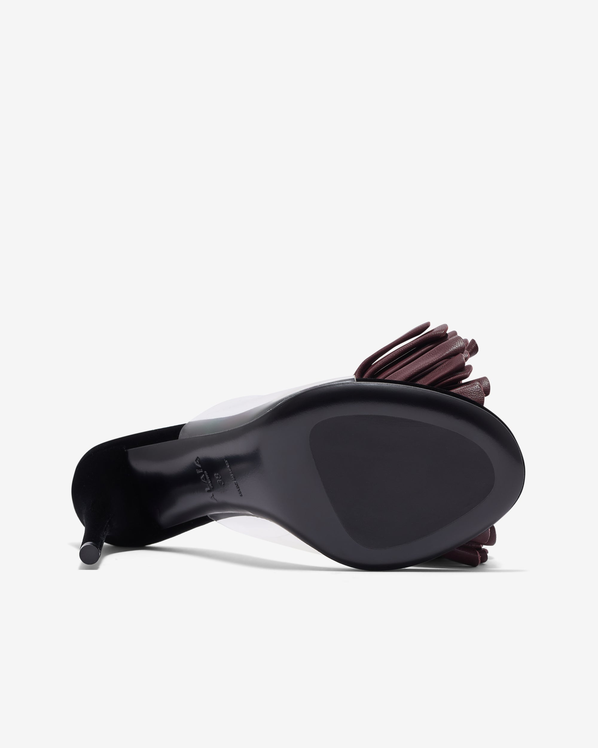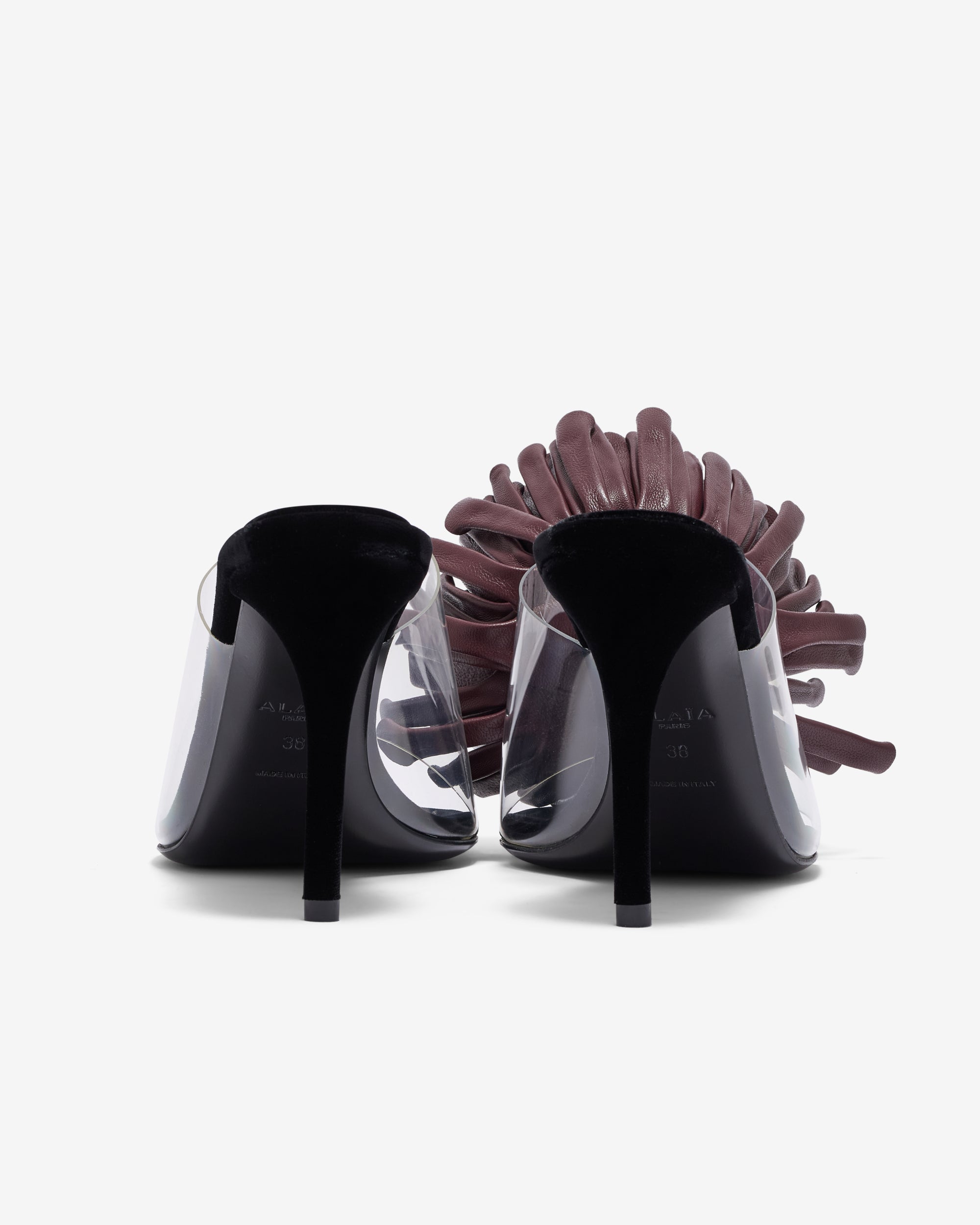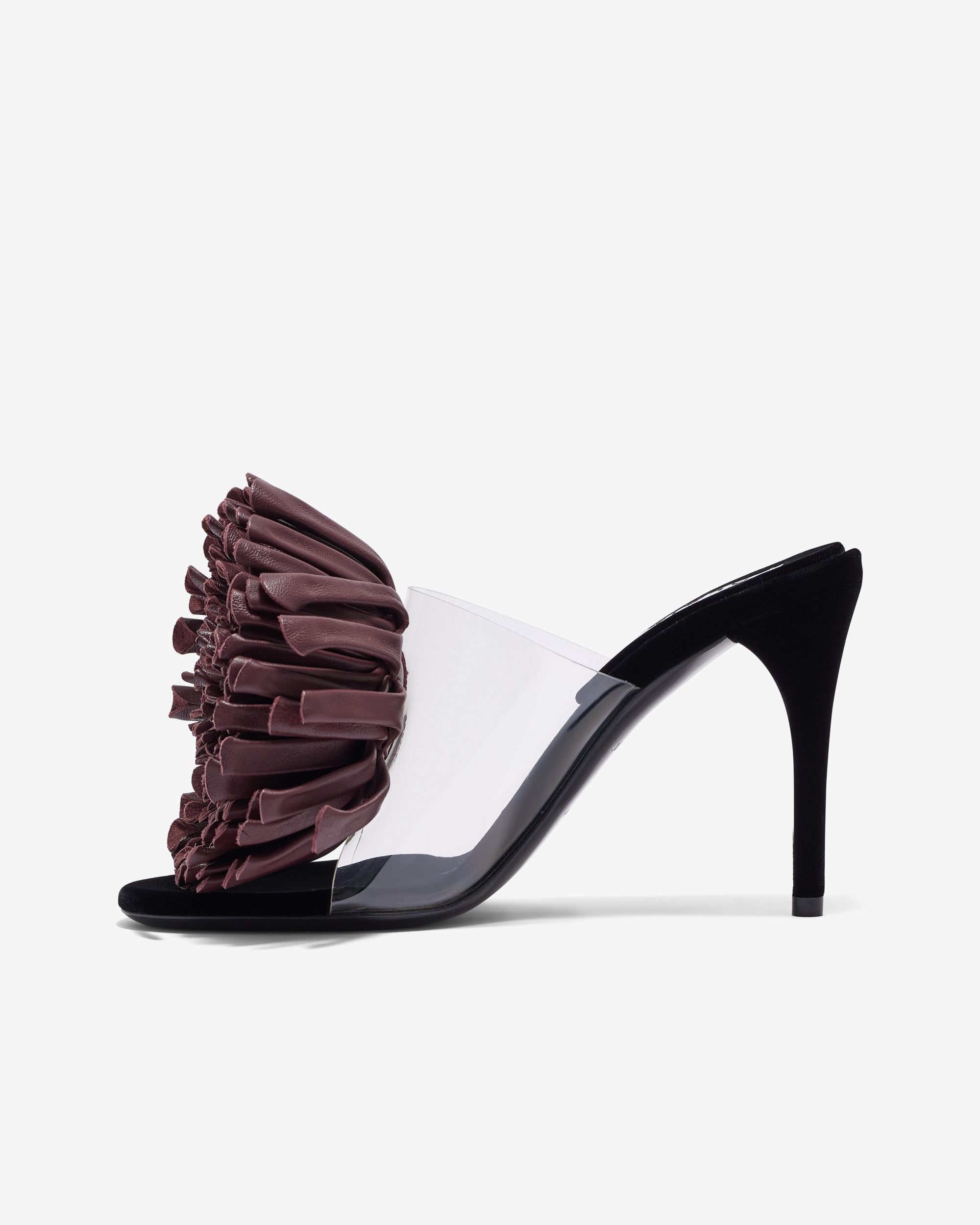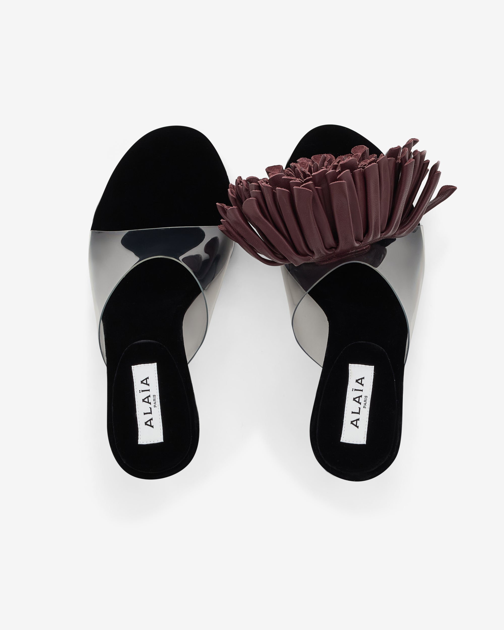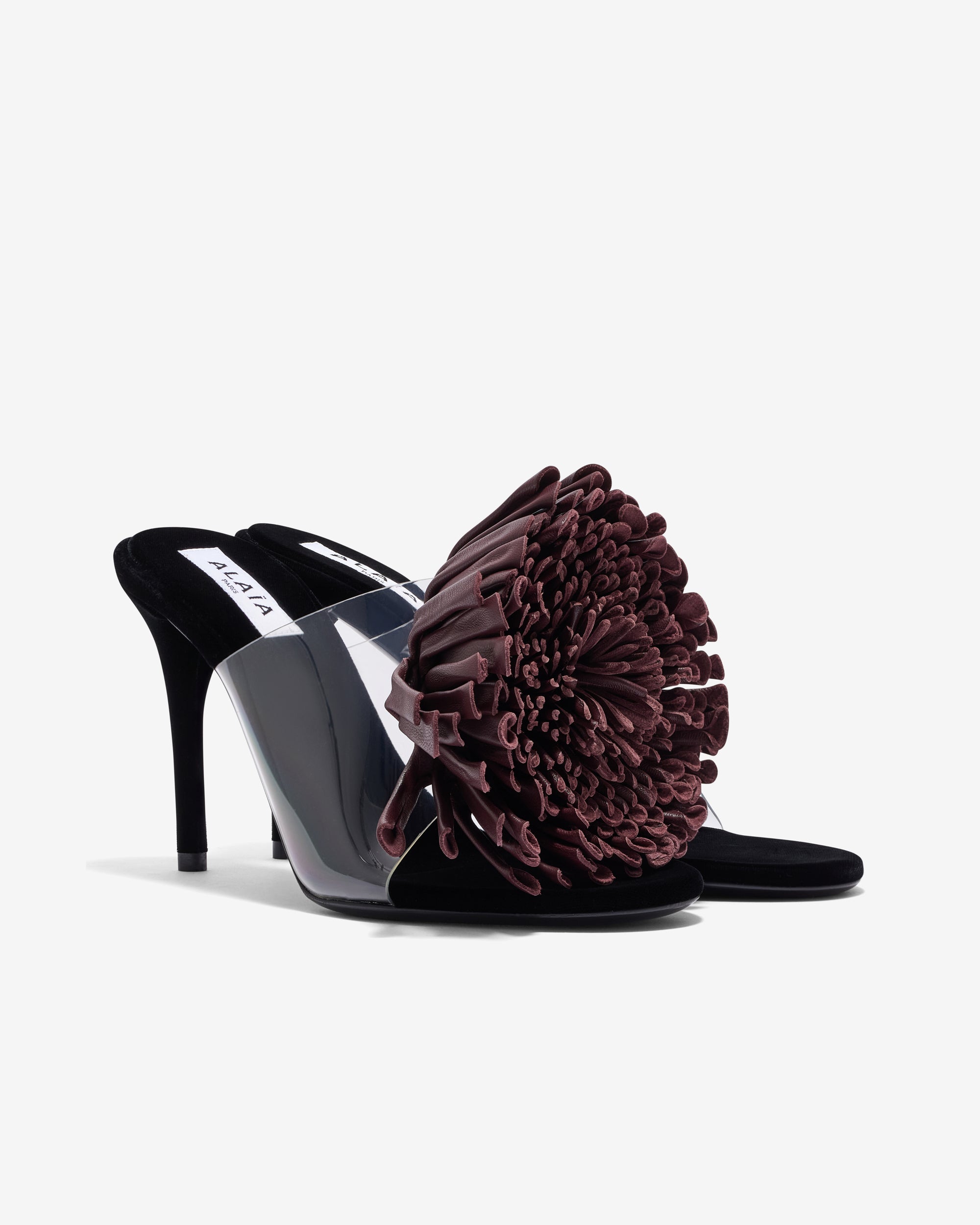 Asymetric siletto heel sandalsLarge 3-D leather flower assembled by hand on the right feetNappa lambskin leather and polyuretane90 mm heel