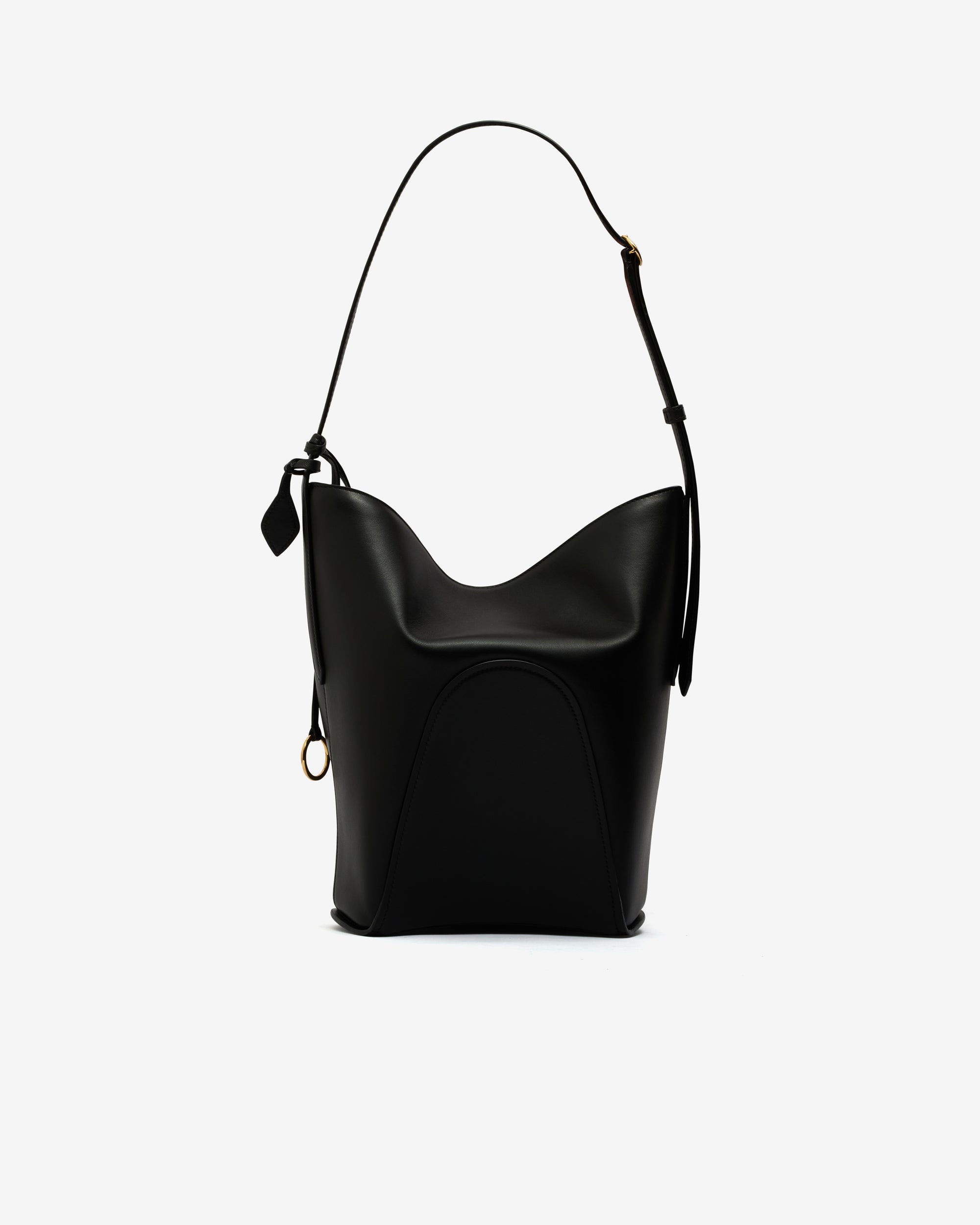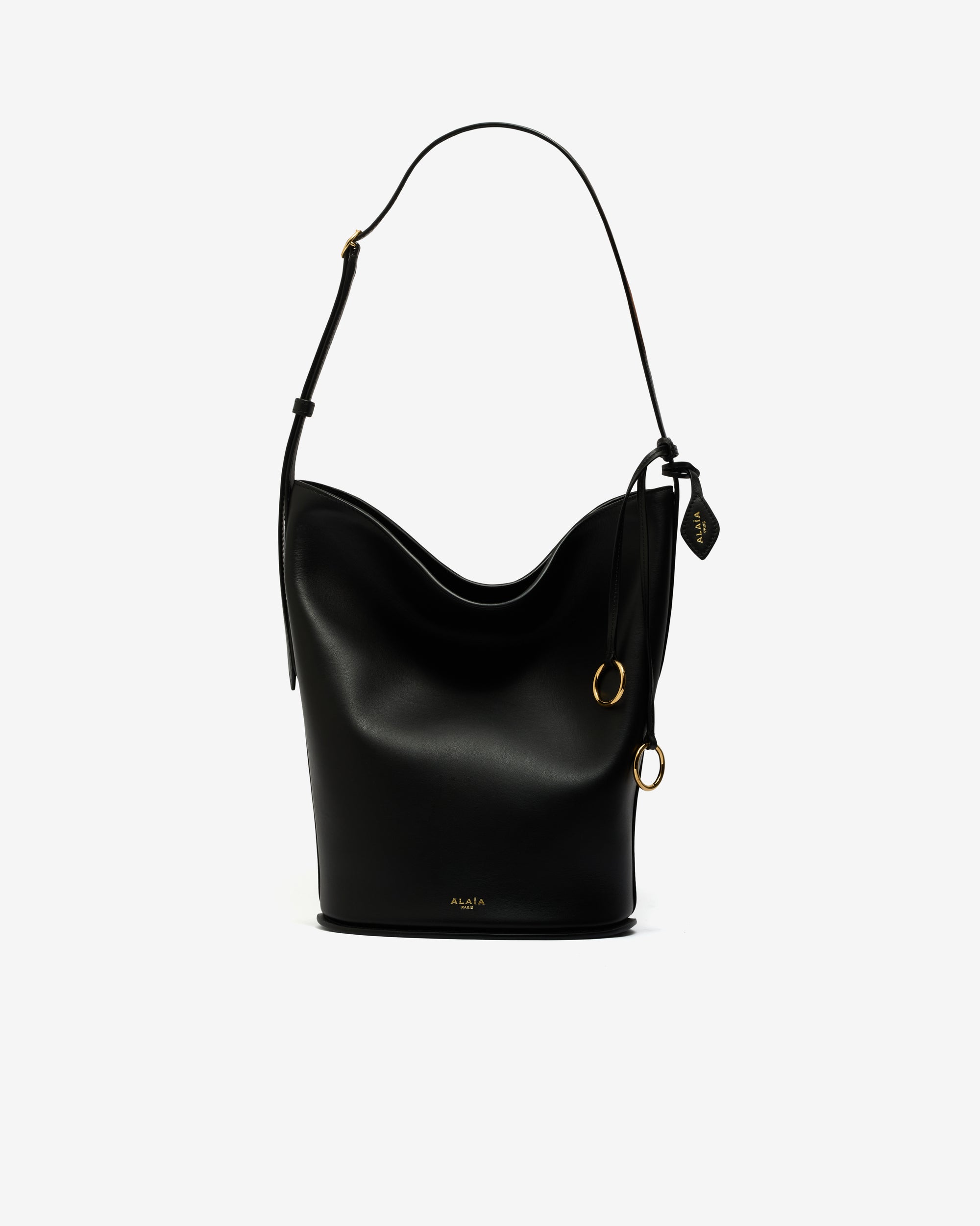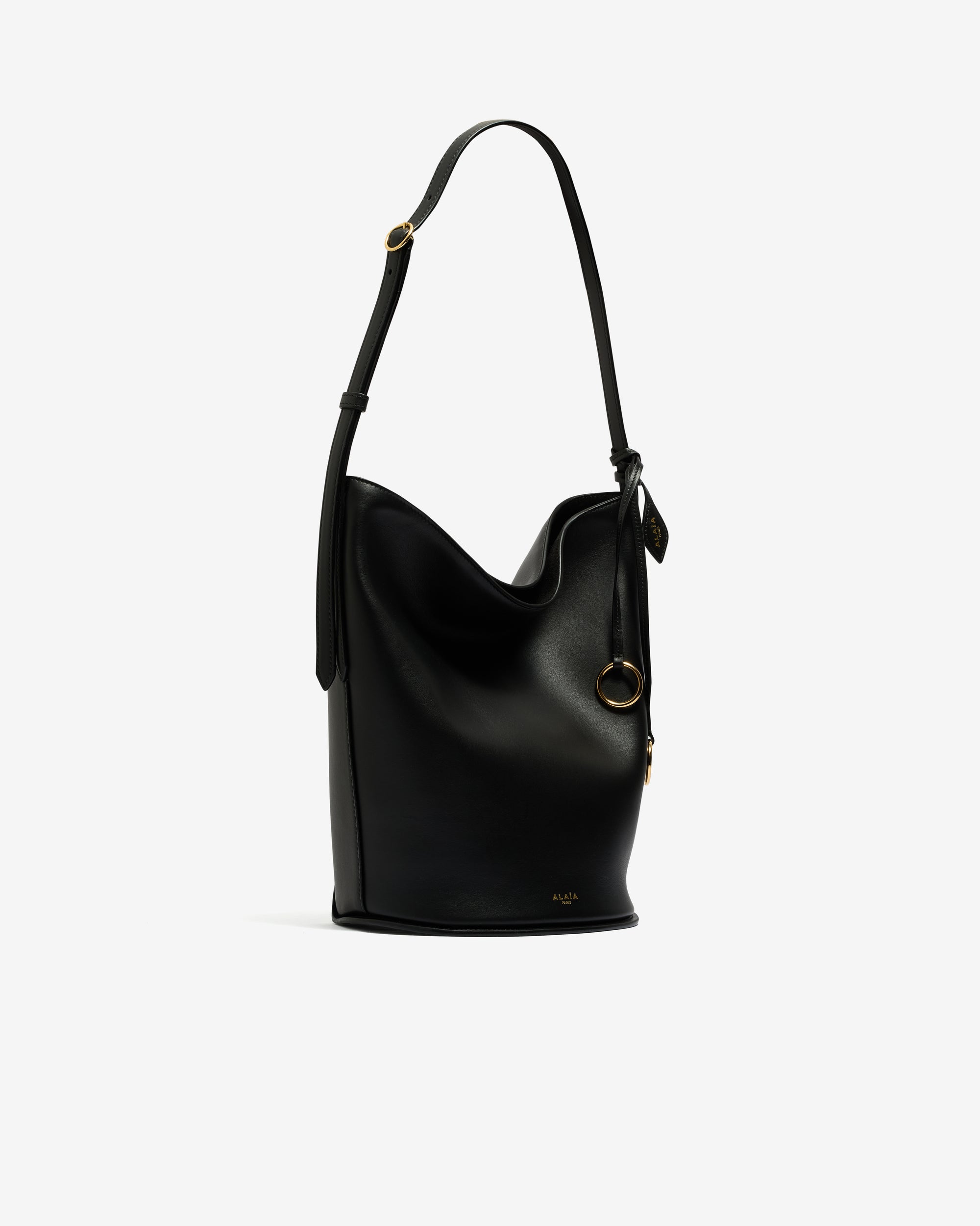 Small bucket bagAdjustable strapRing metal charms with ALAÏA tagSignature anatomical curved shape of the molded baseSmooth calfskin leatherDimensions (cm): L 20 X H 29 X D 11