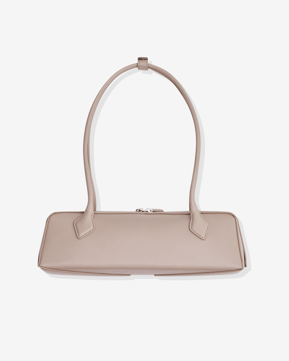 Long tubular handles with decorative ties, double zip closure, small removable mirror on the inside pocket