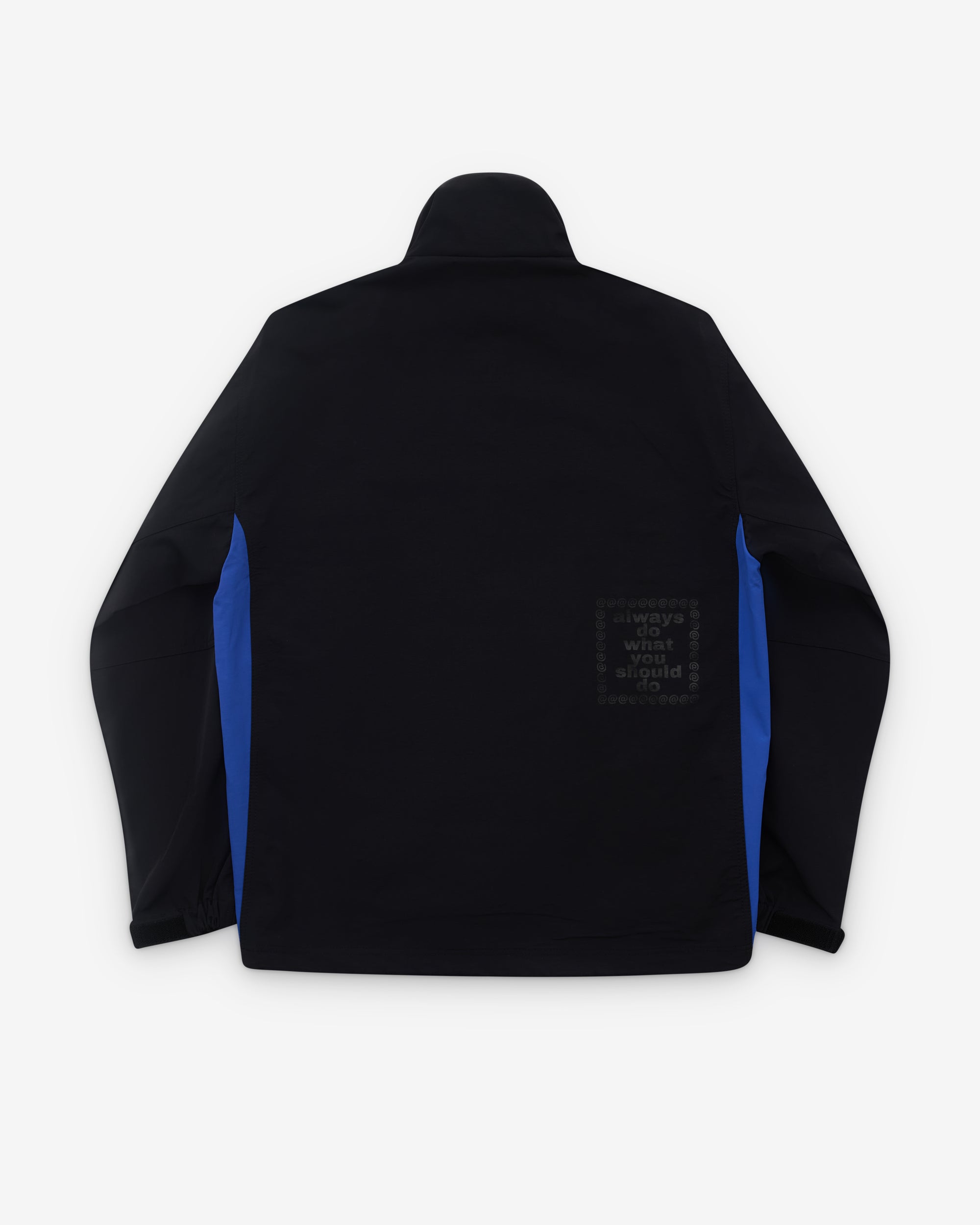 Water proof coated nylonInternal stash pockets with taped internal seamsContrast panelling with hidden pocketsScreen printed logosZip closureFunnel collar