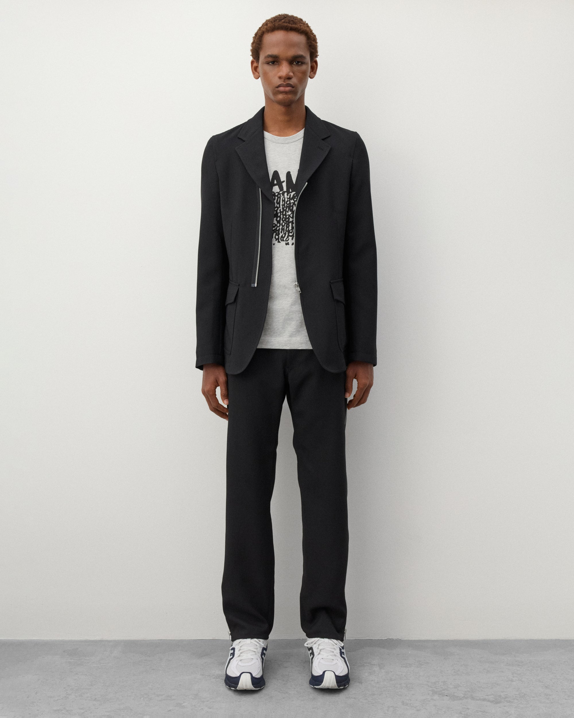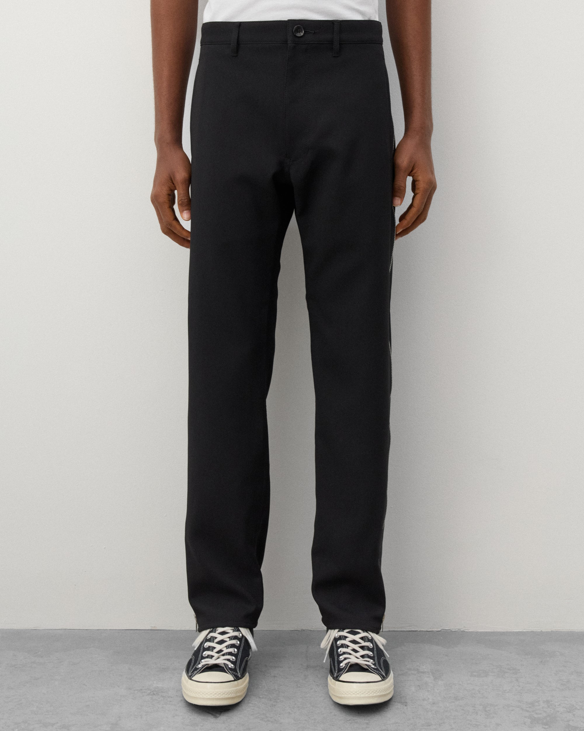 Button waist, zip flyFront slash pocketsAdjustable zippers at side legStraight cutTwo rear pockets