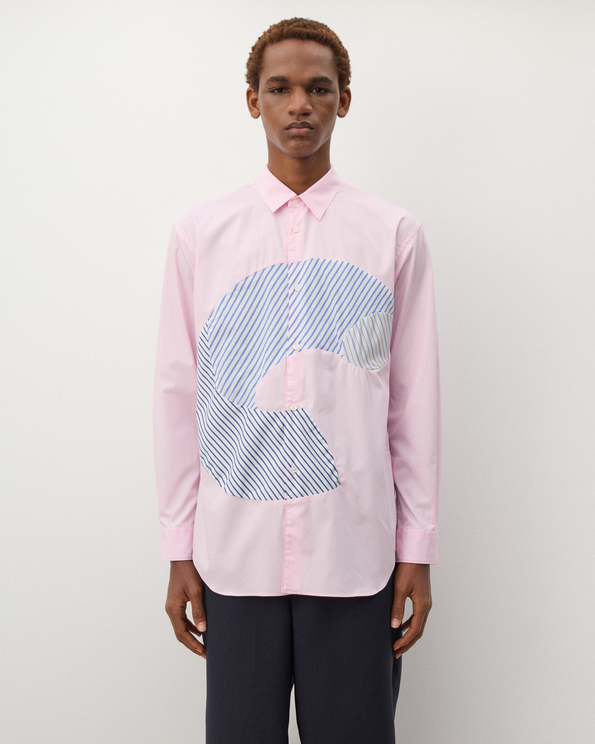 Classic point collarFront mother of pearl button placketShirttail curved hemButton close cuffsContrast stripe geometric pattern