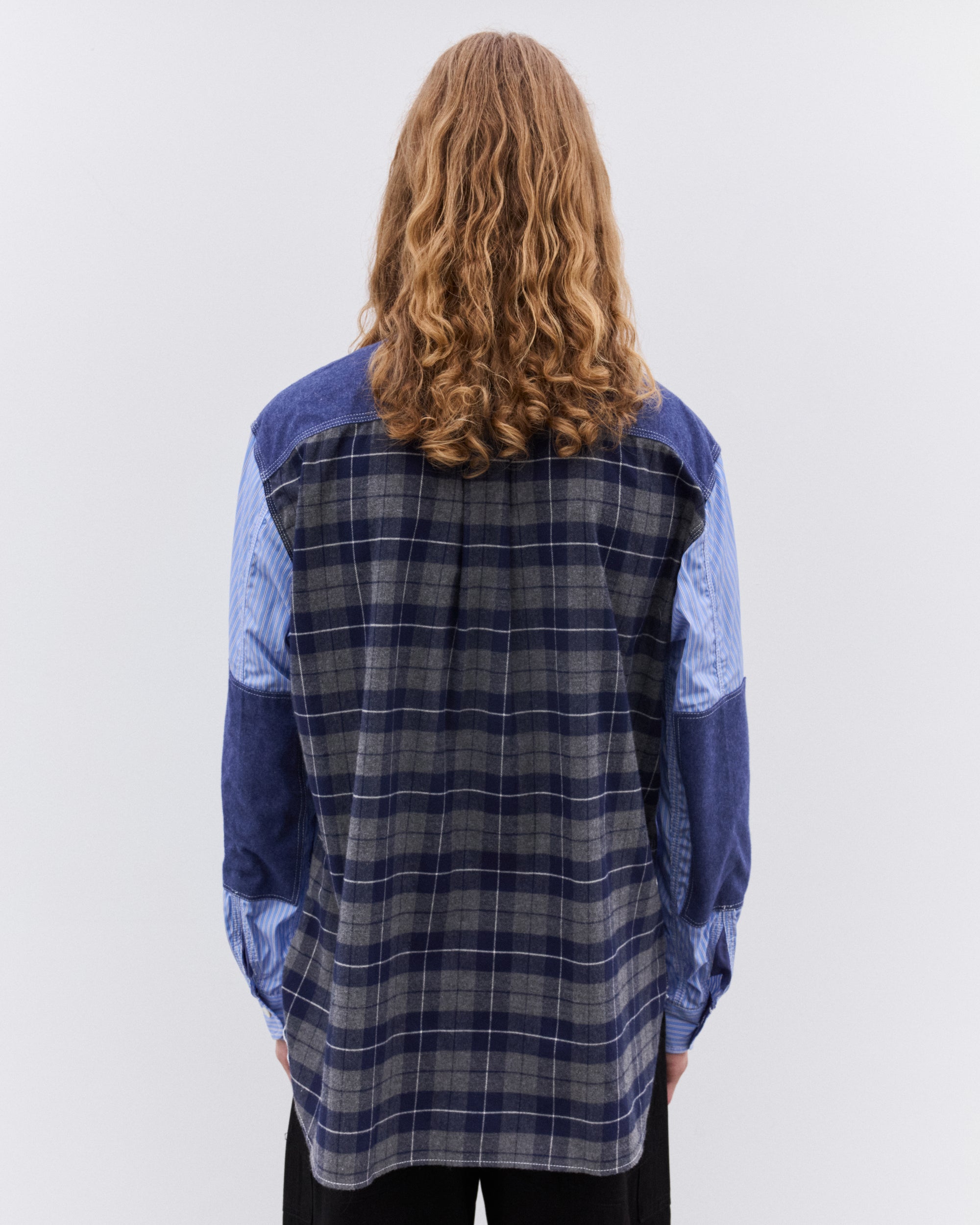 Classic point collarButton fastening frontChest pocketCheck back panelDenim elbow patchesCurved hemContrast stitching throughoutButton close cuffs