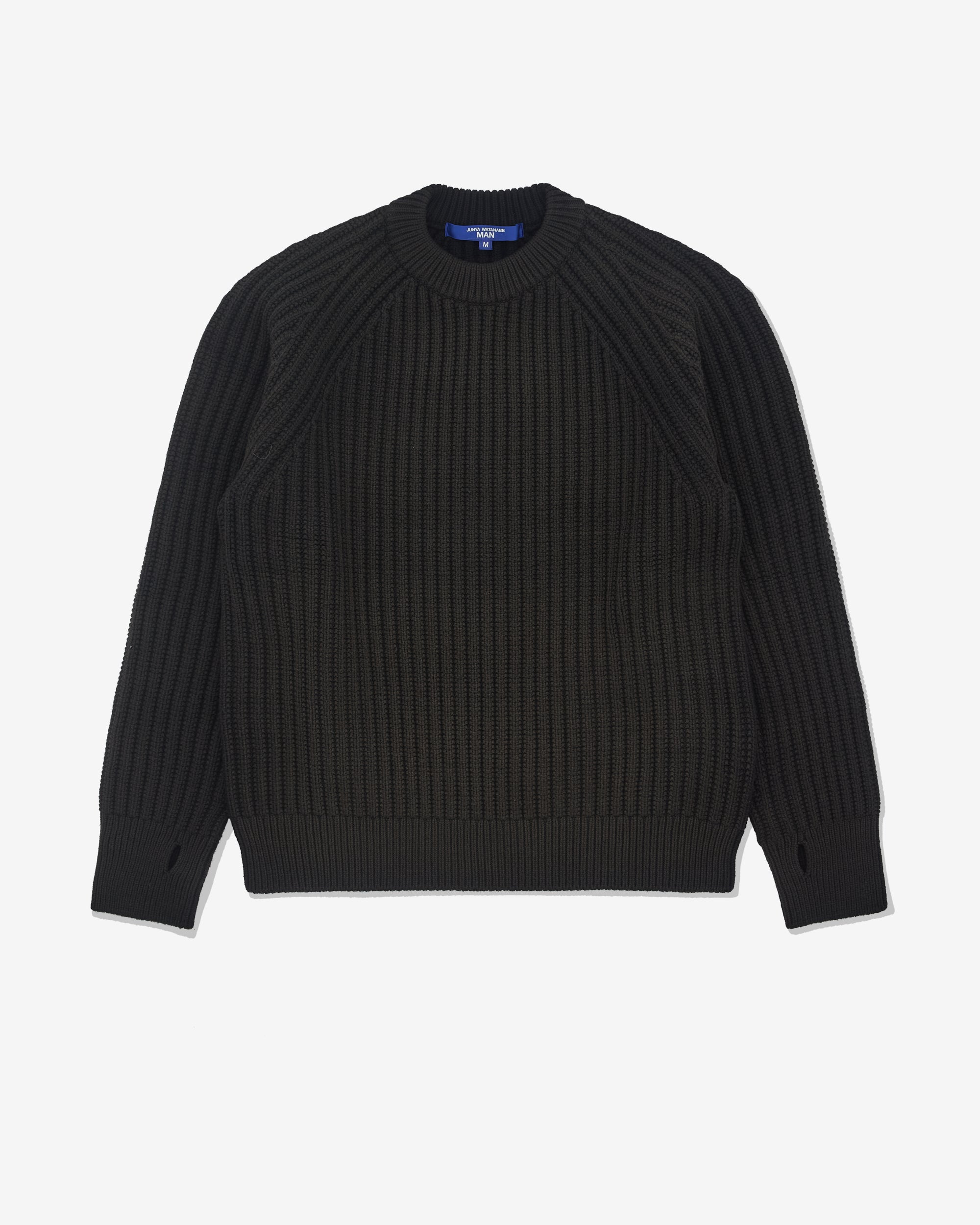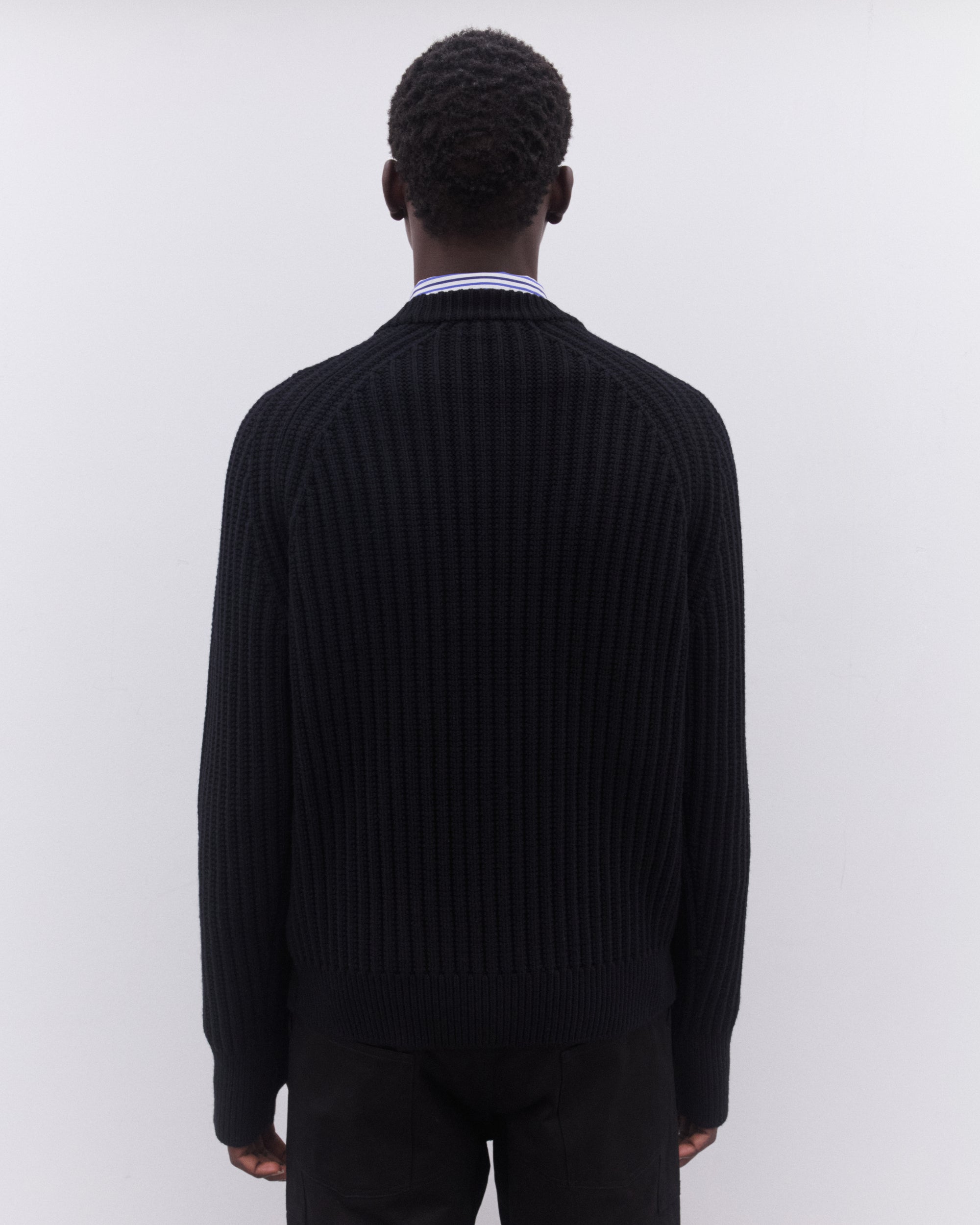 Crew neckHeavy rib knitRaglan sleevesGathered cuffs and hem100% WoolMade in Japan
