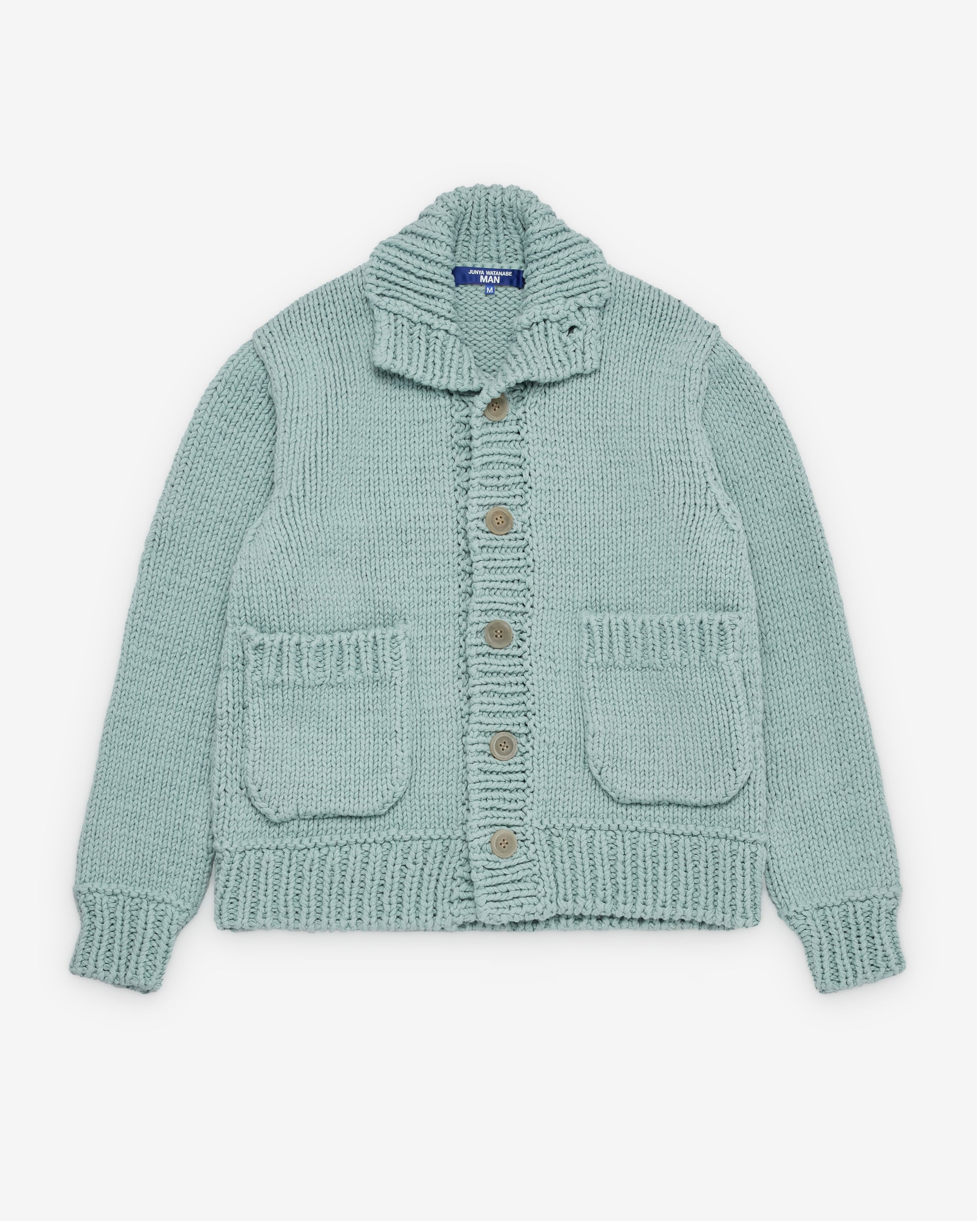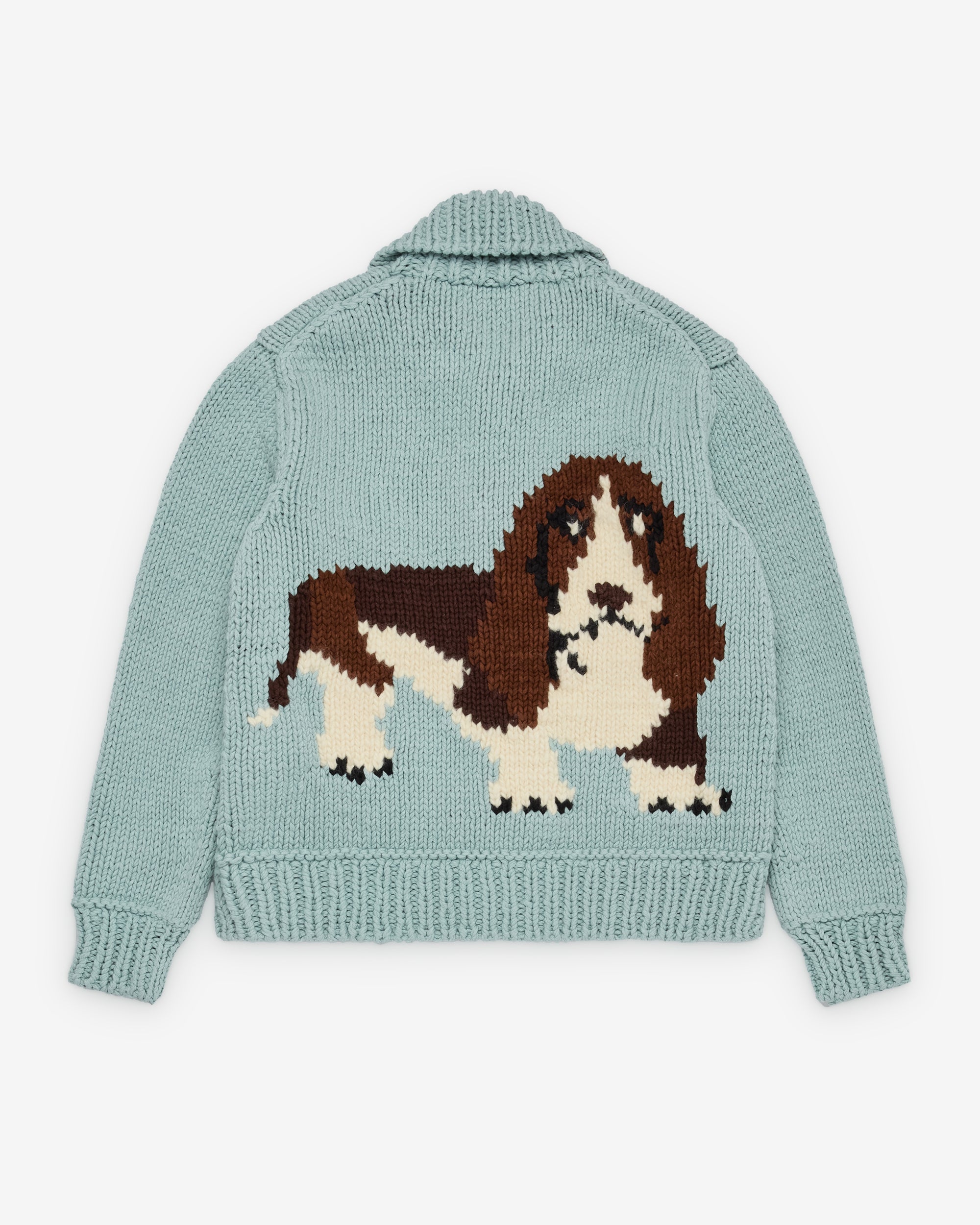 Heavy guage cotton knit fabricIntarsia graphics at backFront patch pocketsFront button closureRibbed knit trims