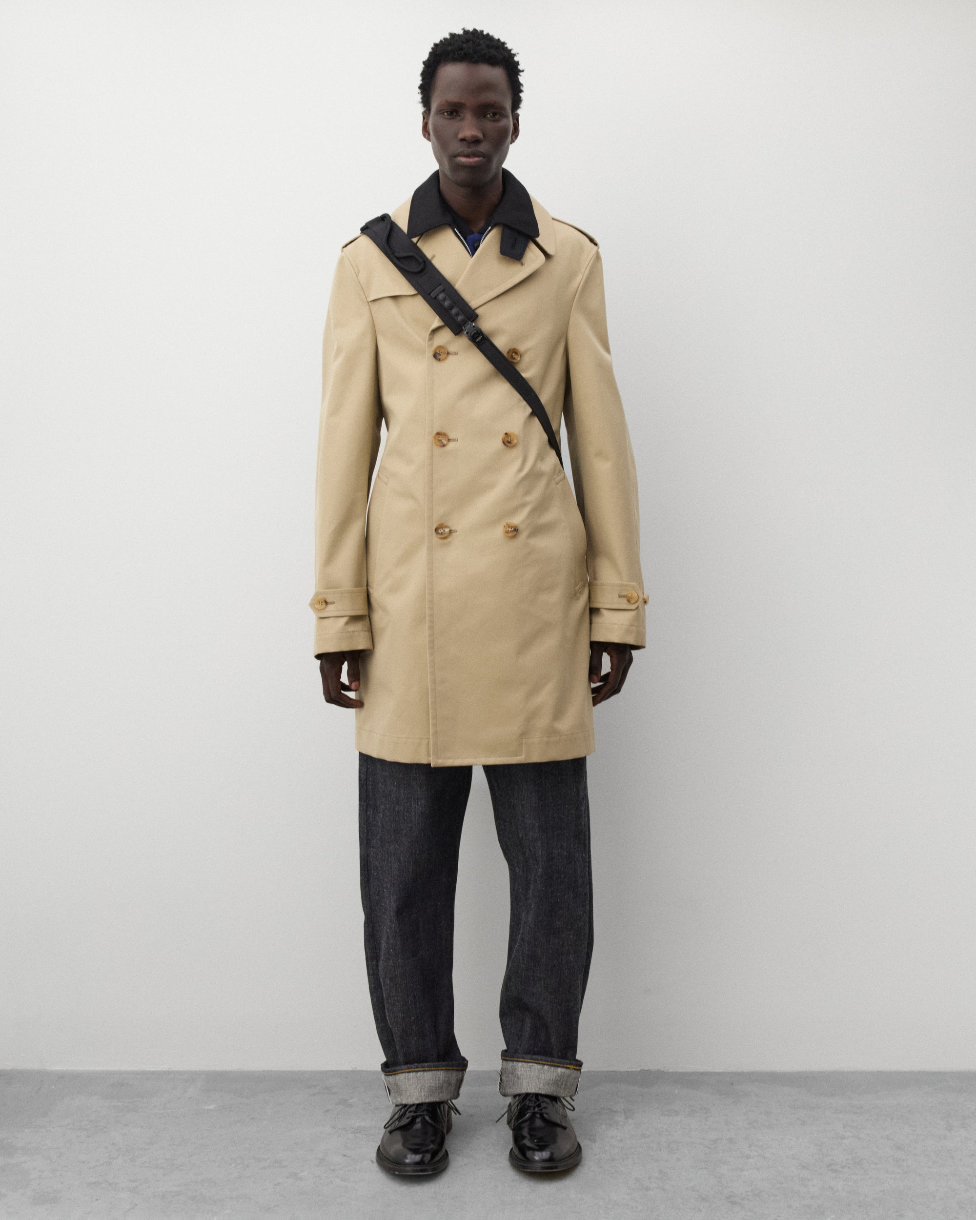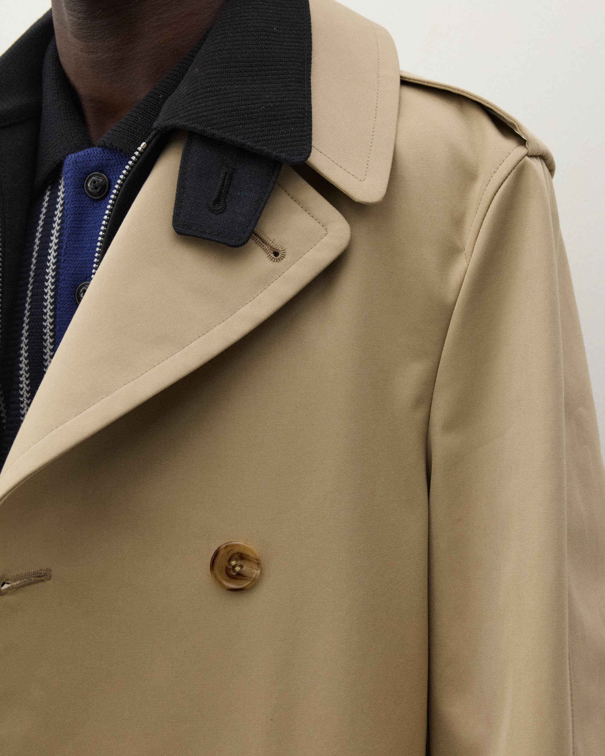 Double breasted front Button and zip closureKnee length Oversized fitAdjustable belted waistSplit rear ventInternal layered jacket