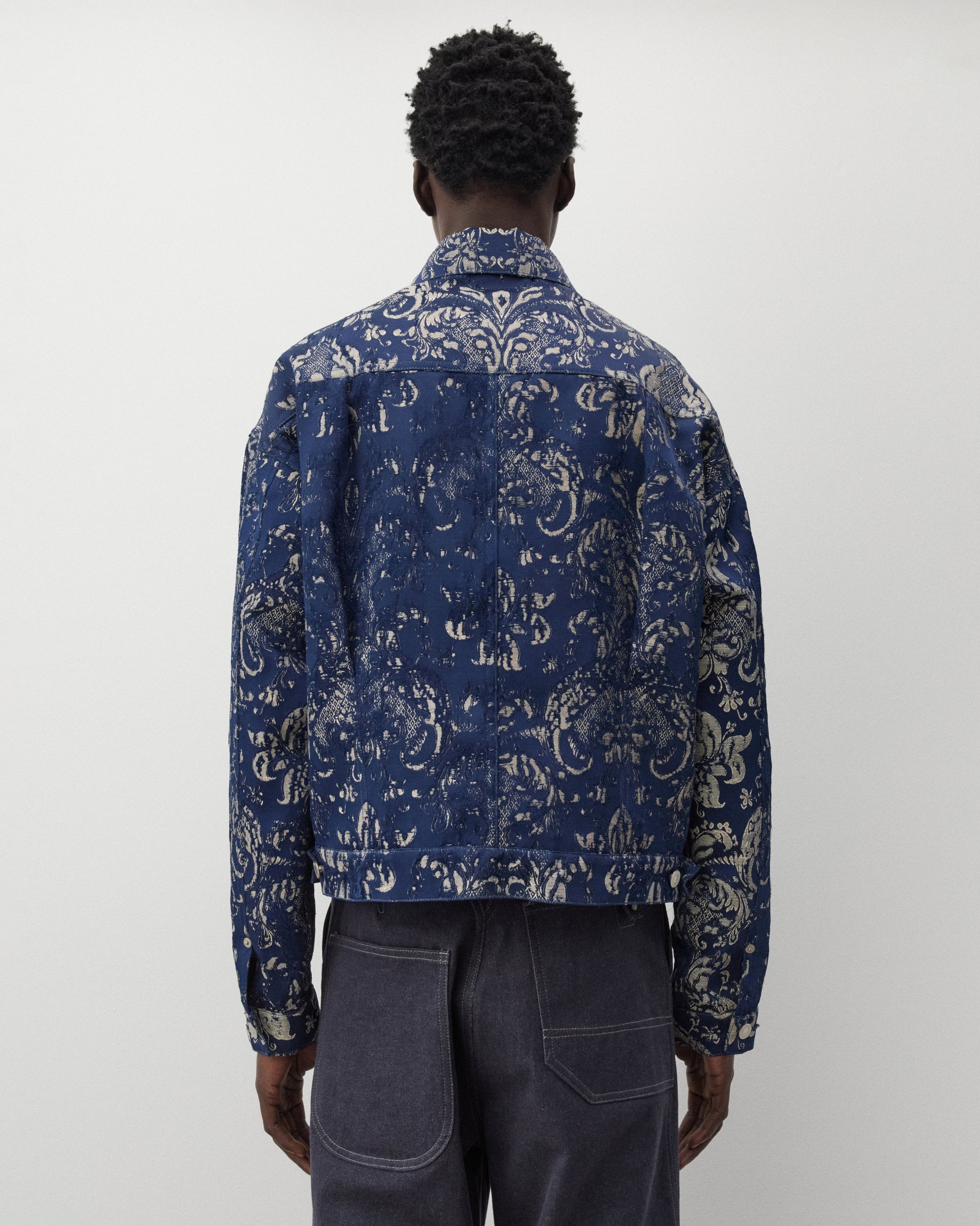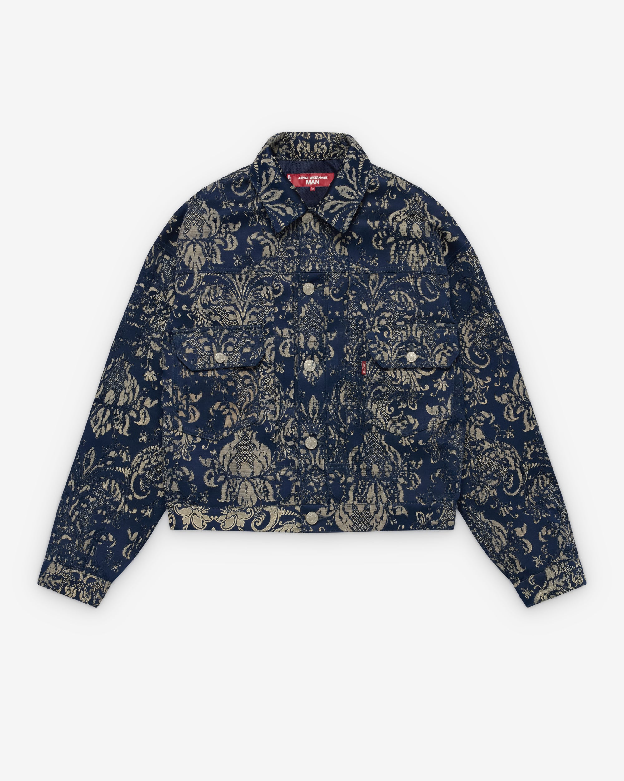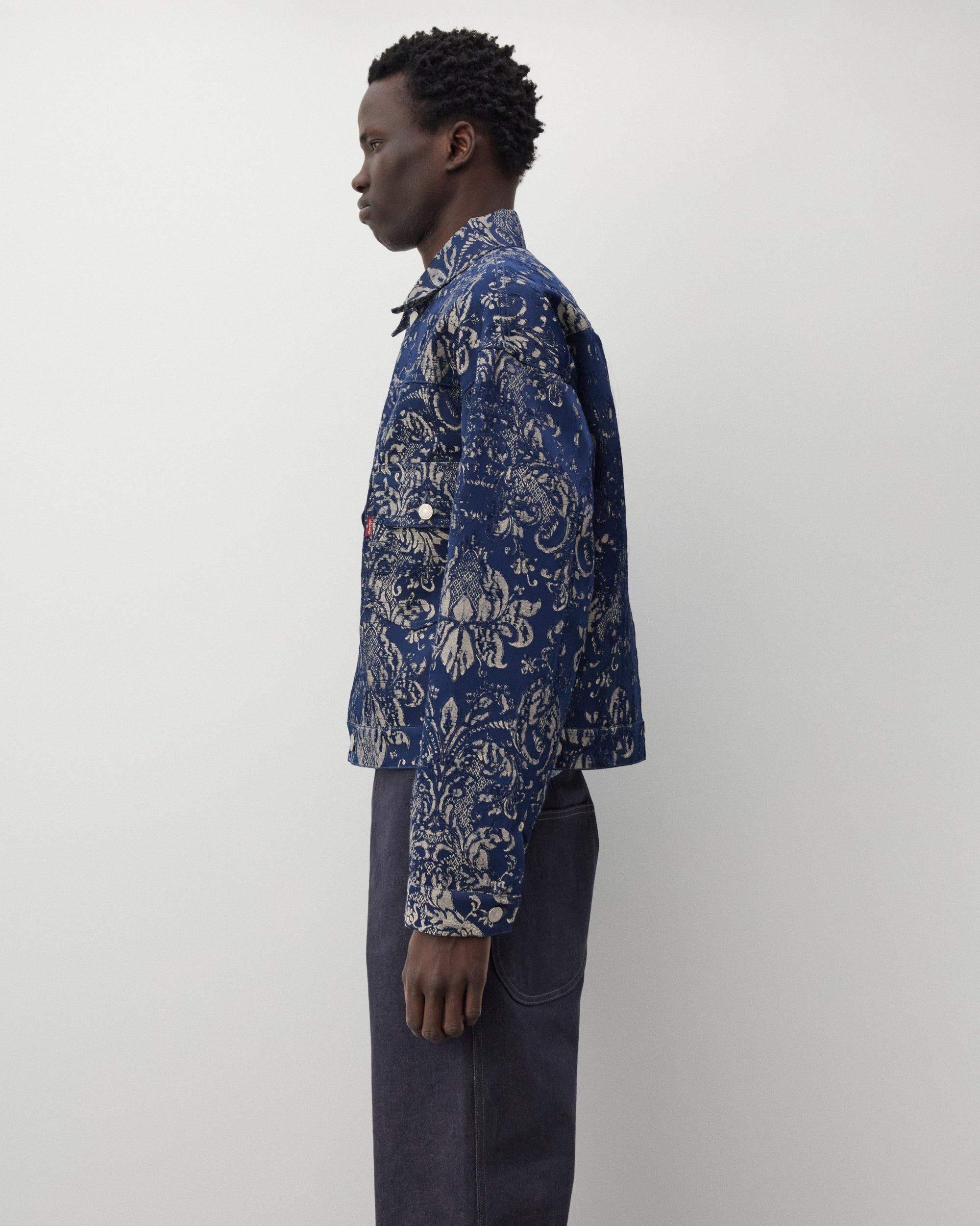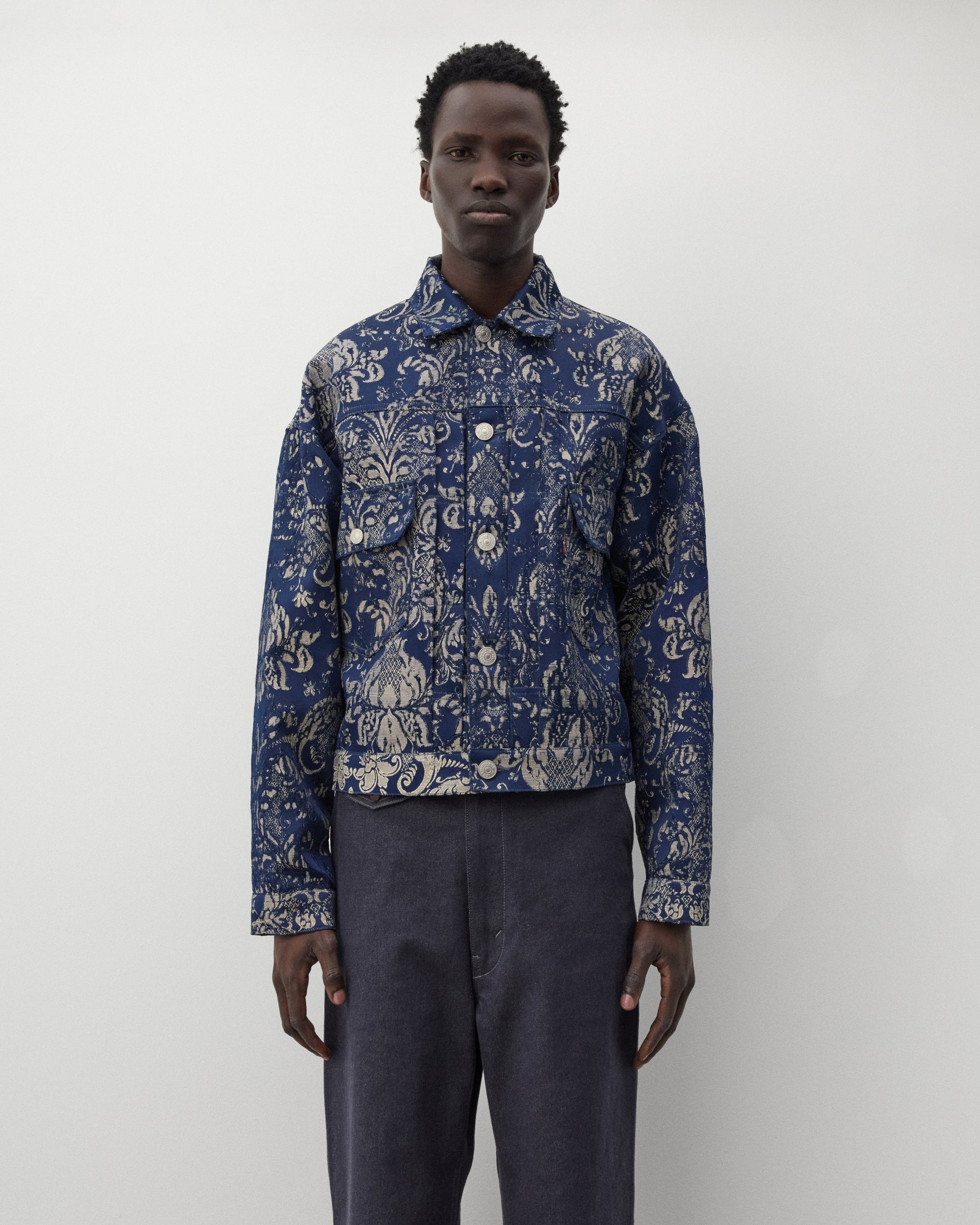 Classic spread collarJacquard Damask fabricFront button closureTwo chest pocketsLevi's tab at pocketButton tabs at waist