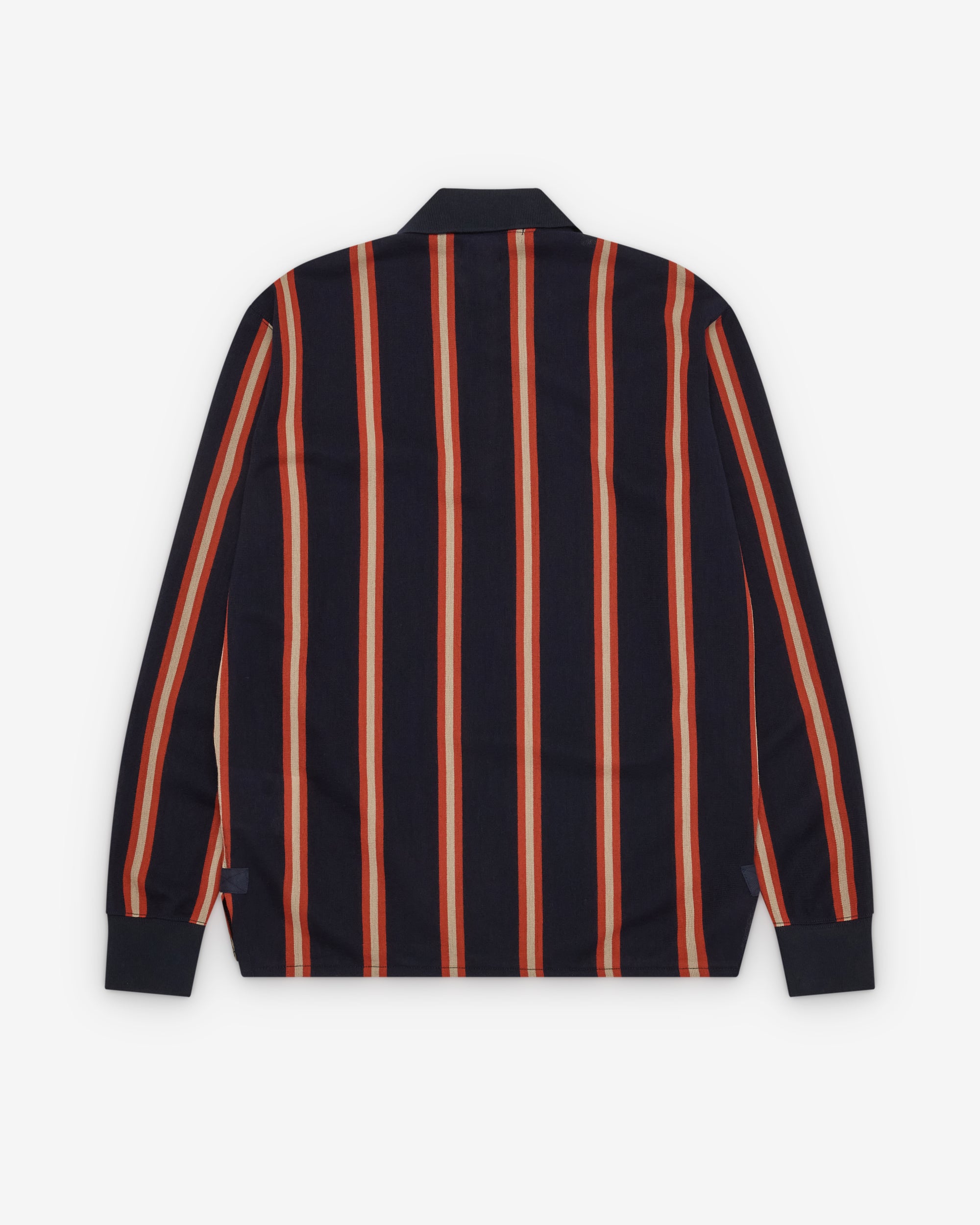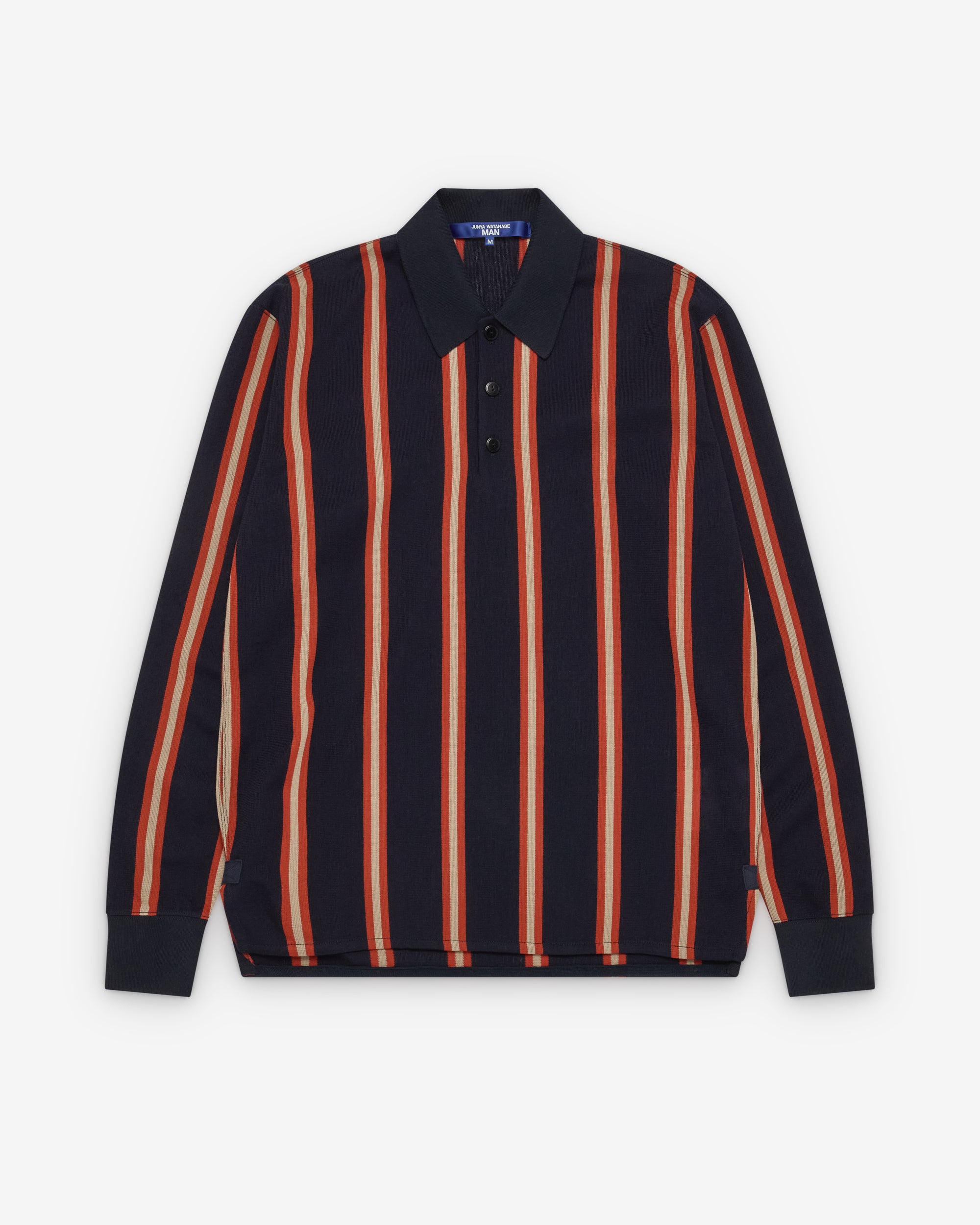 Polo collarThree button placketLong sleevesSplit side seamStriped woven knit fabricRibbed cuffs and collar