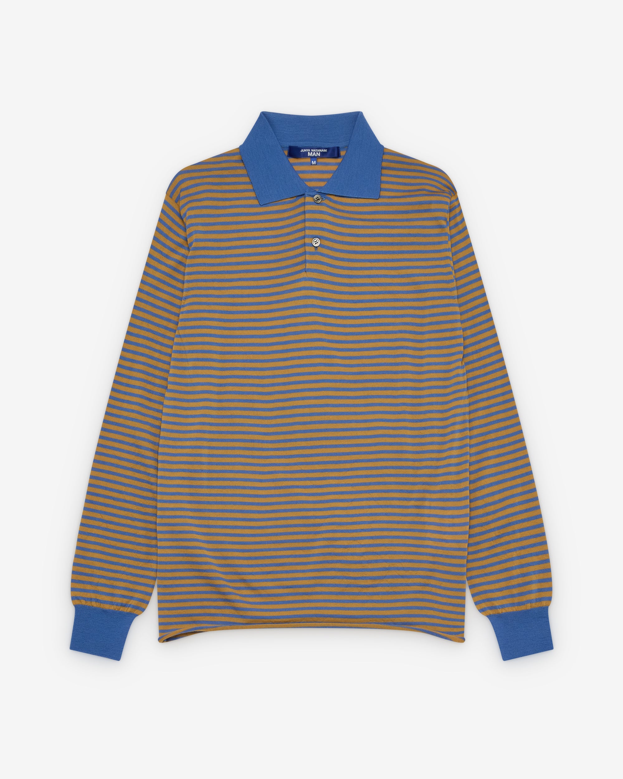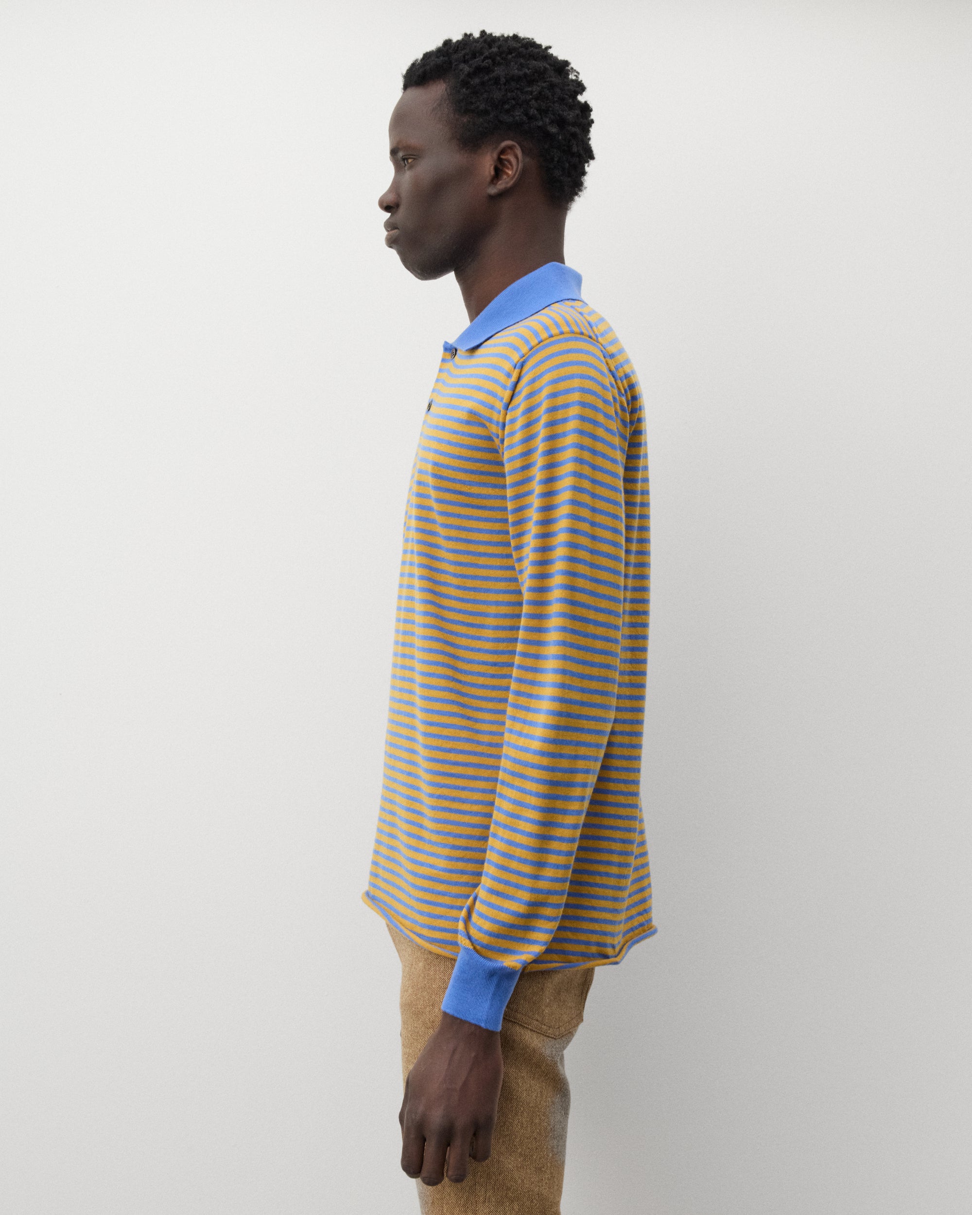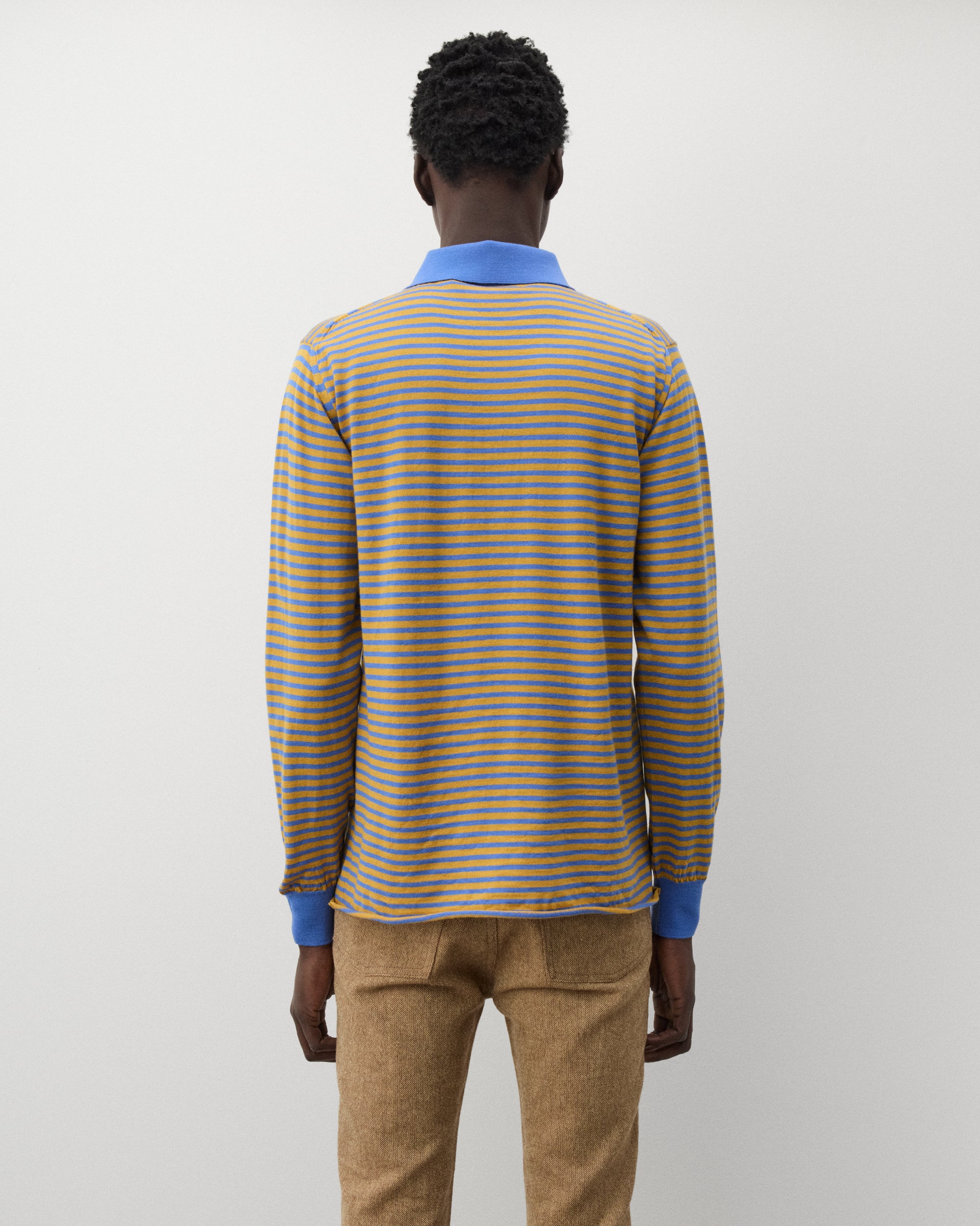 Fine wool striped knitContrast spread collarButton placketRibbed cuffs