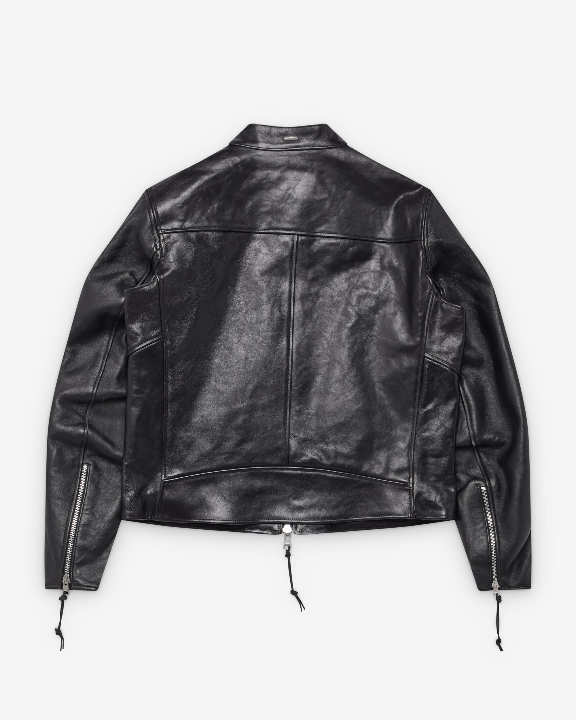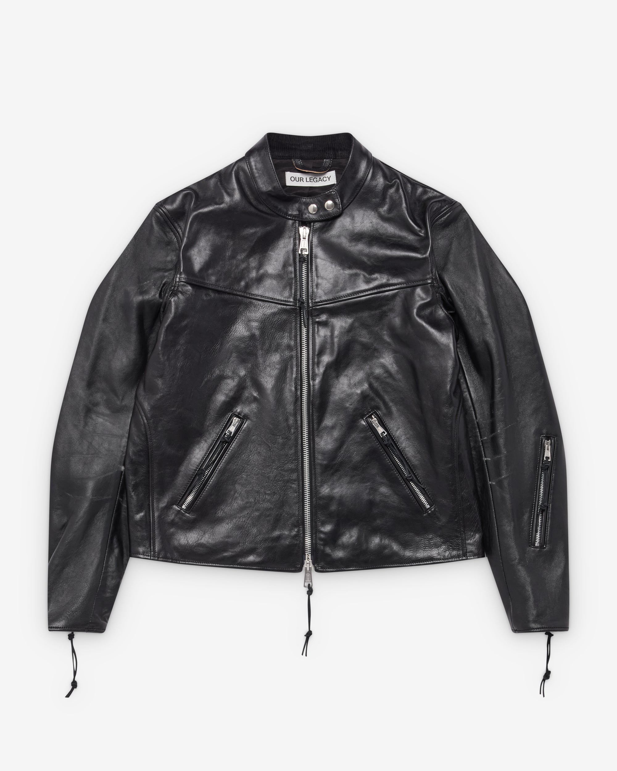 Buffed finish Stand up collar with snap button closure Under collar in cord Zip guard along front Double jet pockets with zip closure Leather cord zip pullers Metal Our Legacy rivet Shaped fit with biker-shaped sleeves
