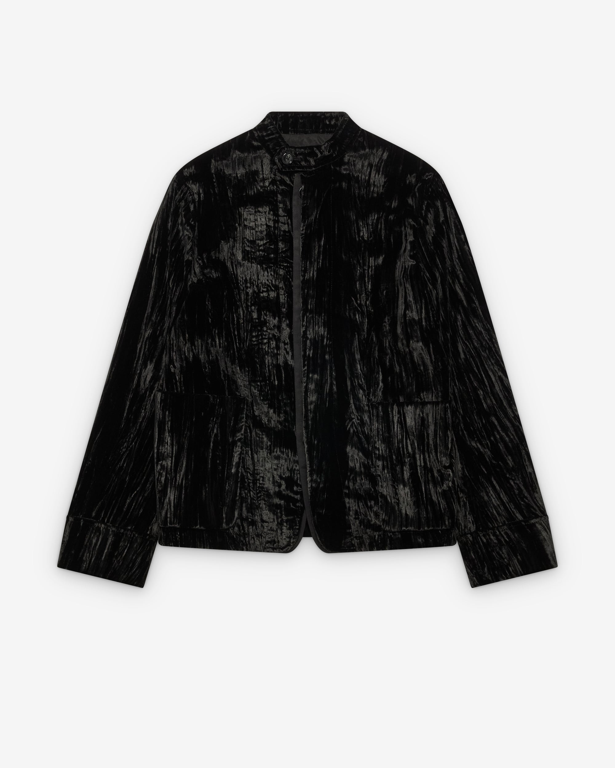 Stand collarFront patch pocketsConcealed button closureFluid fabric