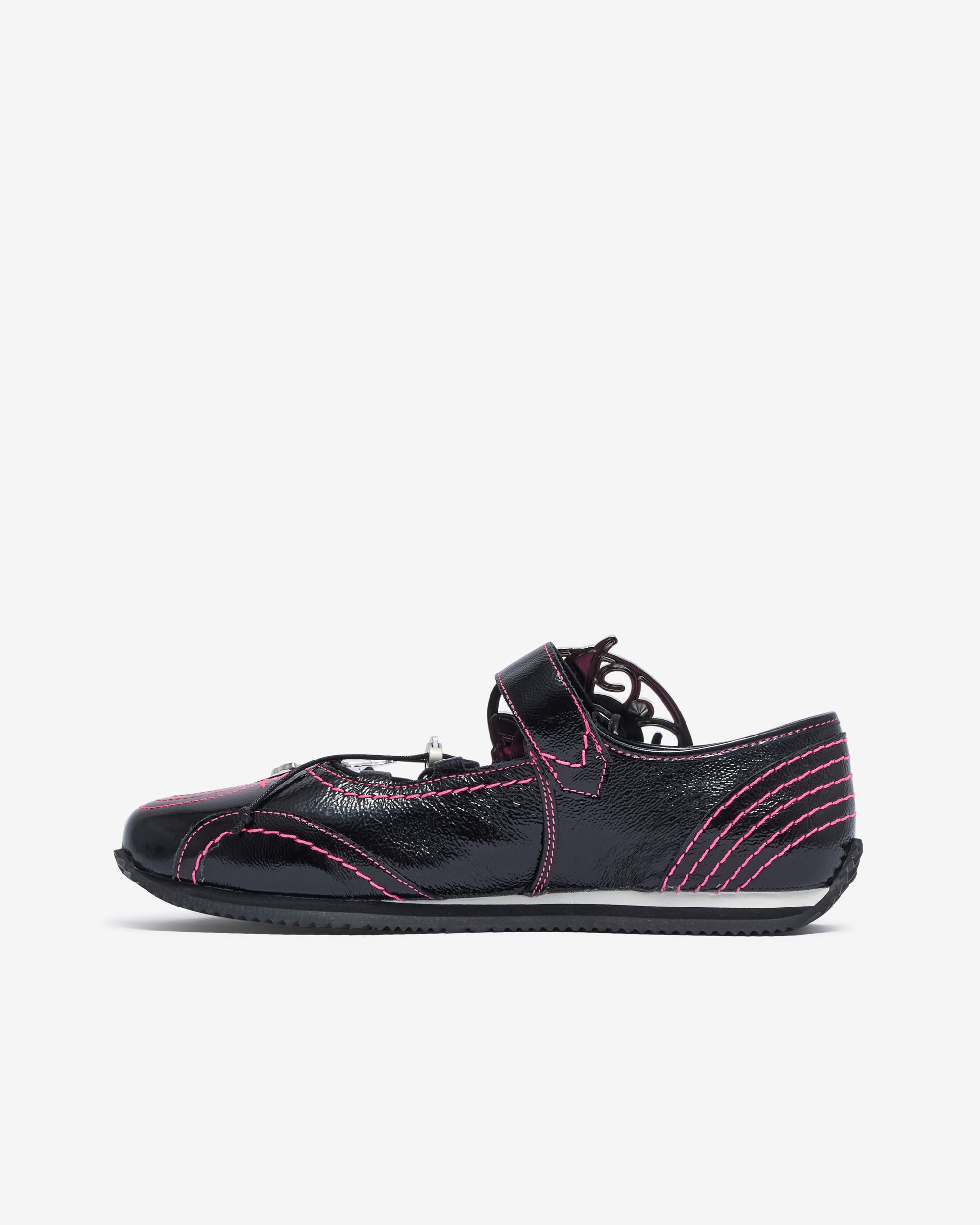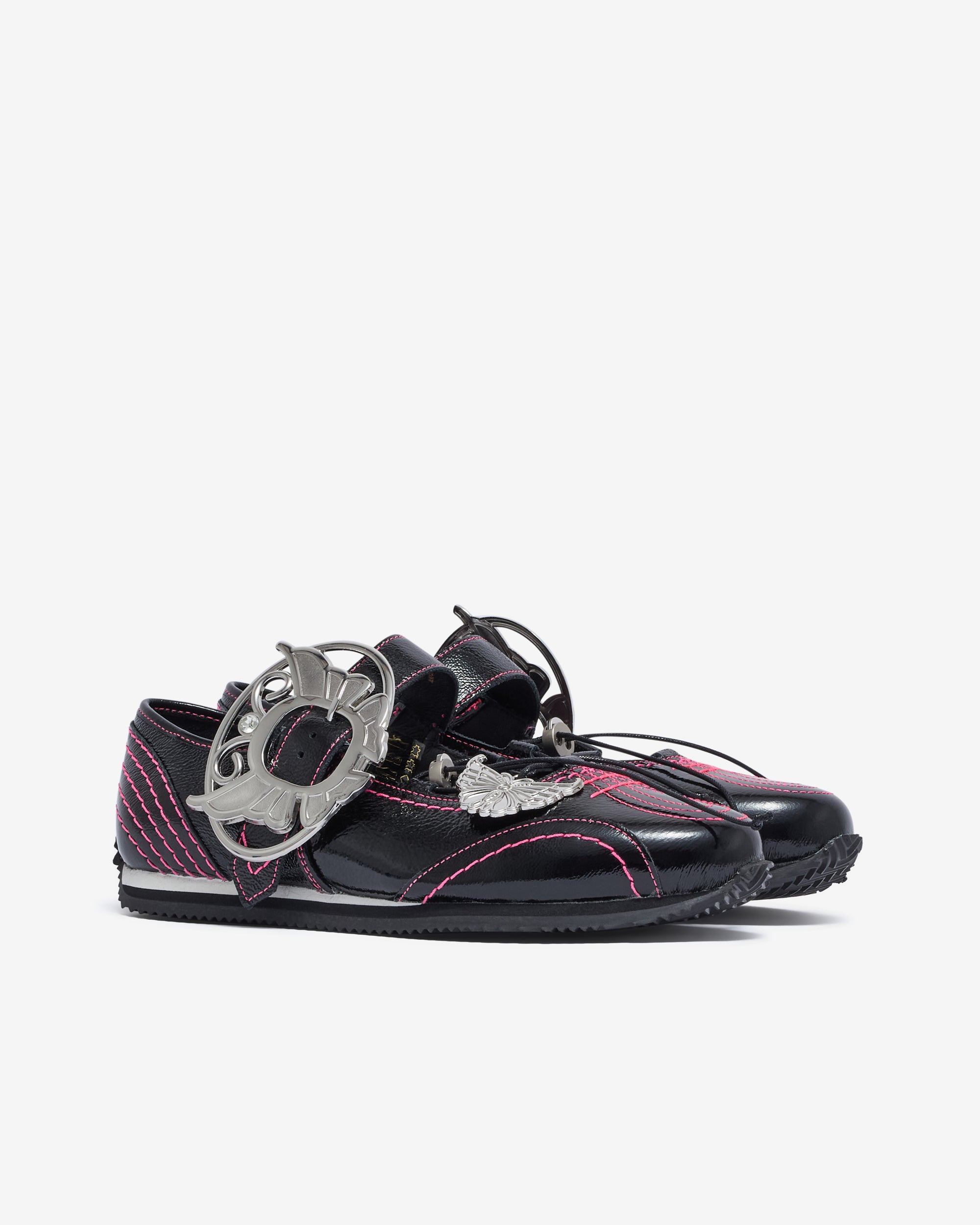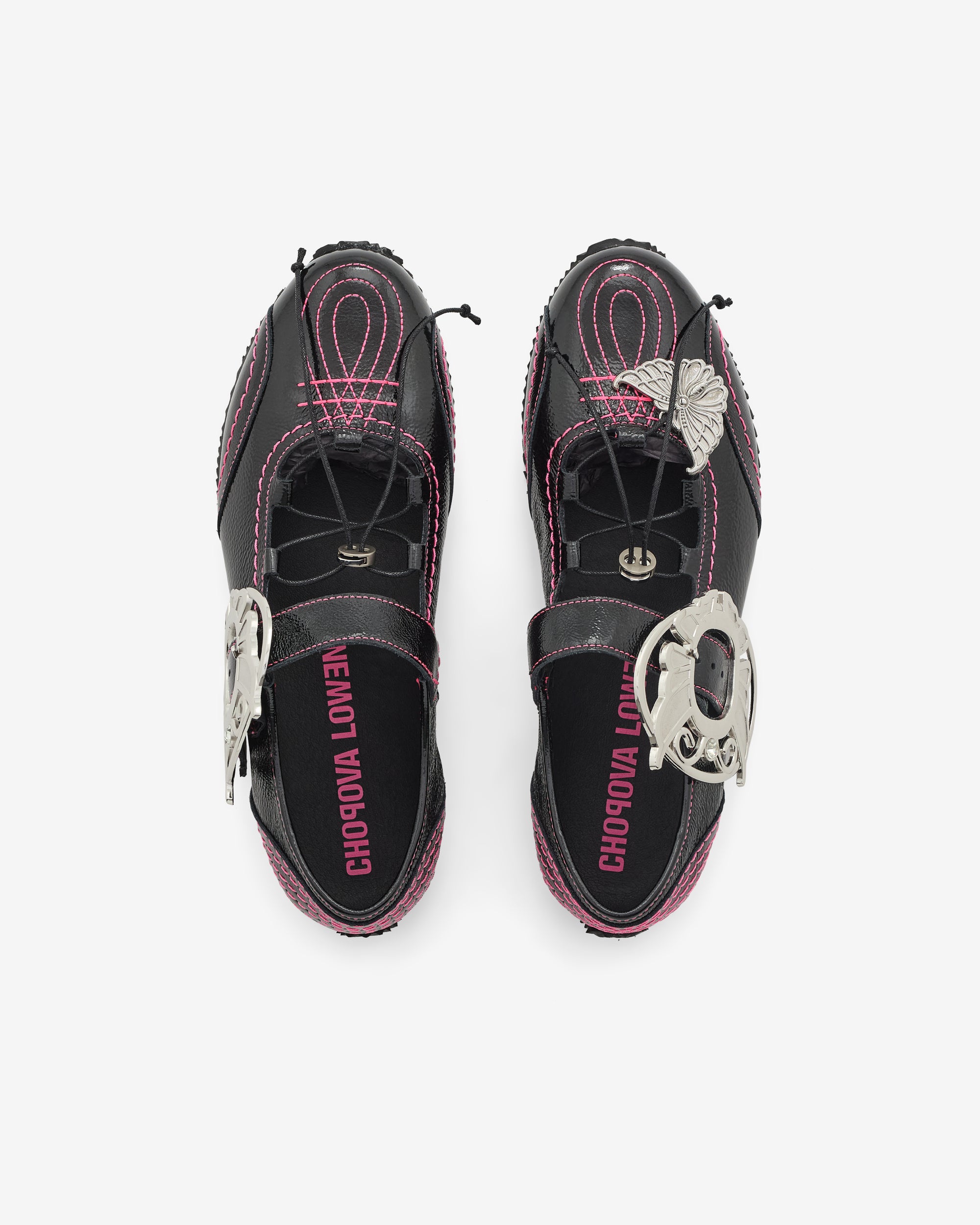 Contrast pink stitchingAdjustable butterfly buckleLace up detailing Butterfly charm