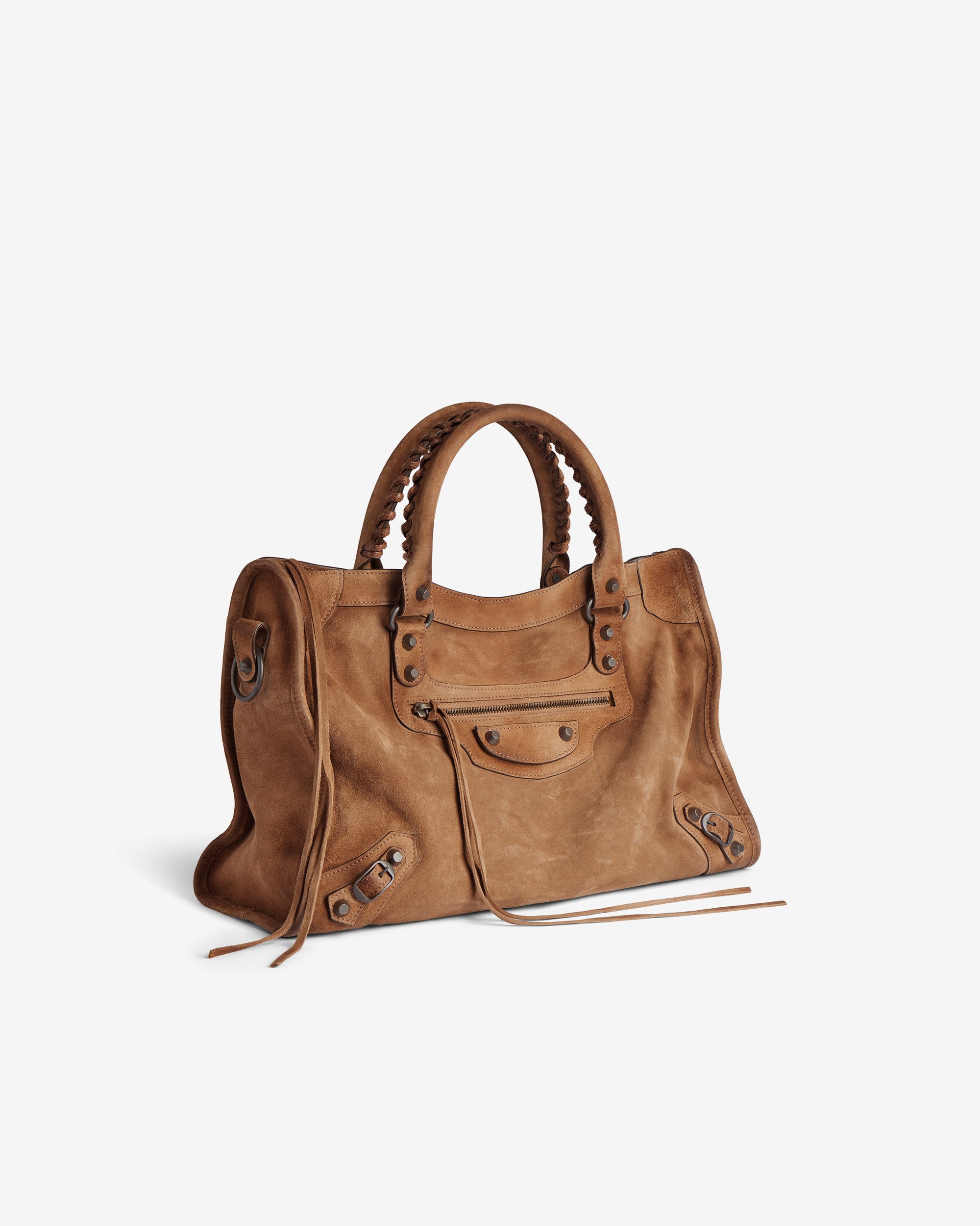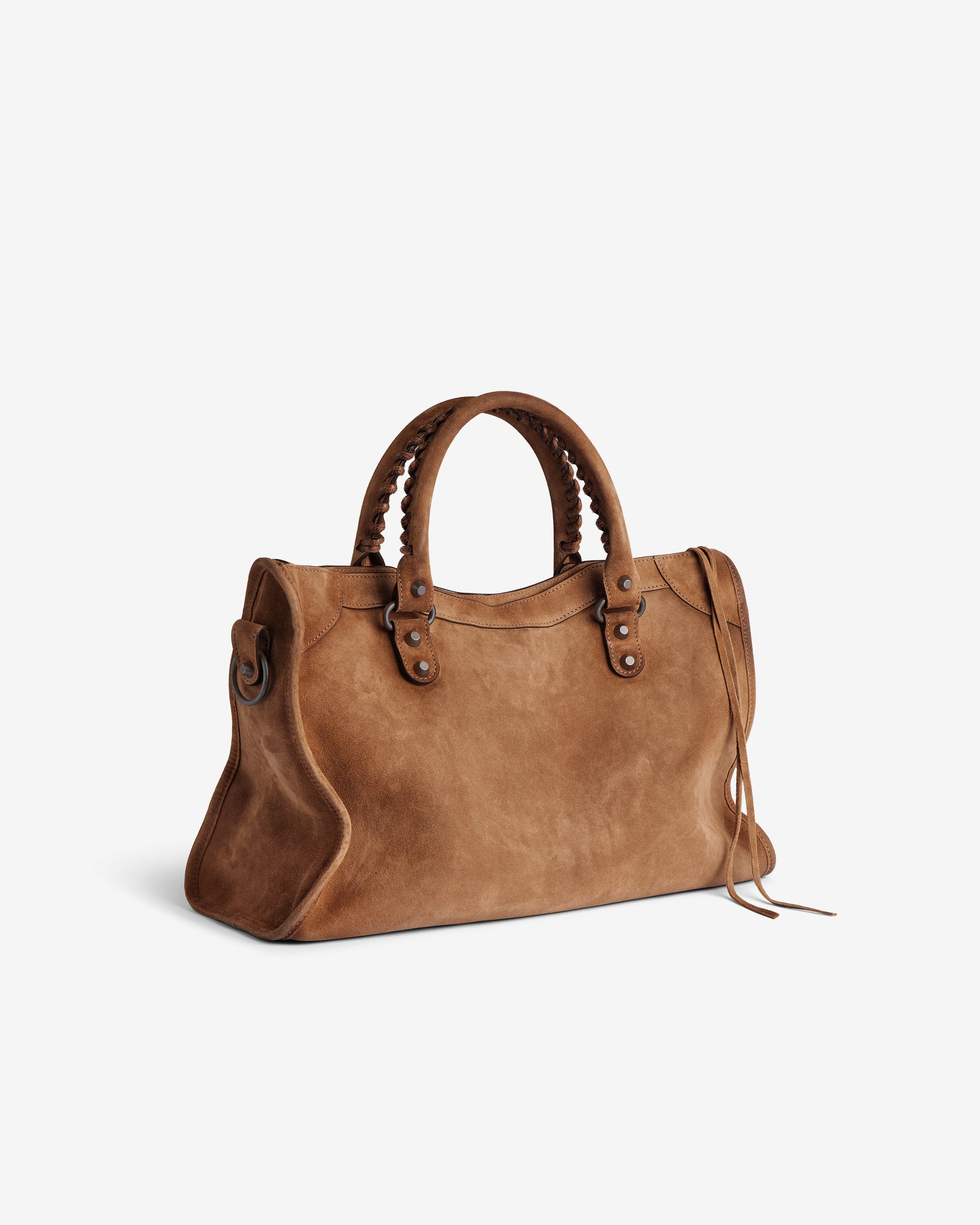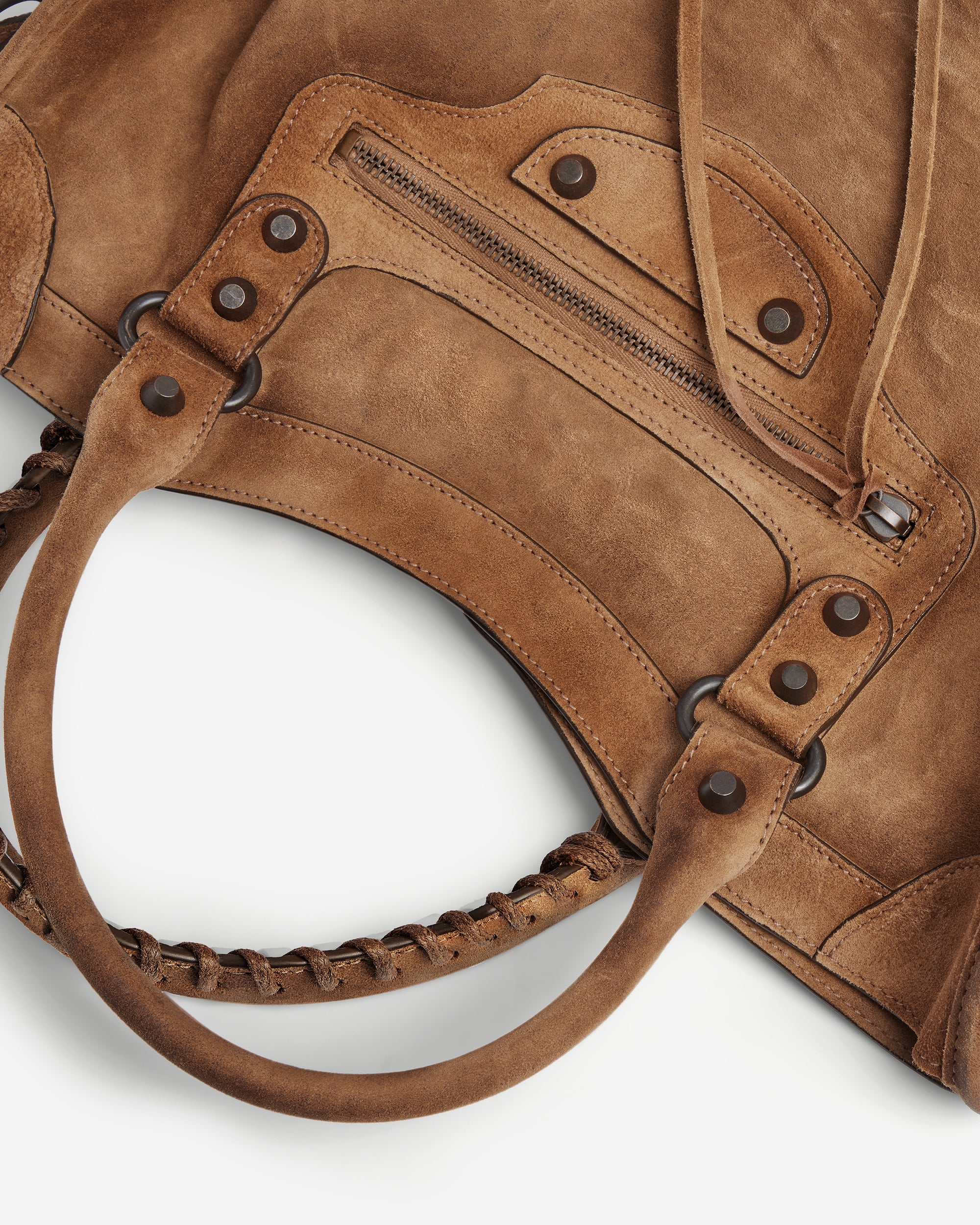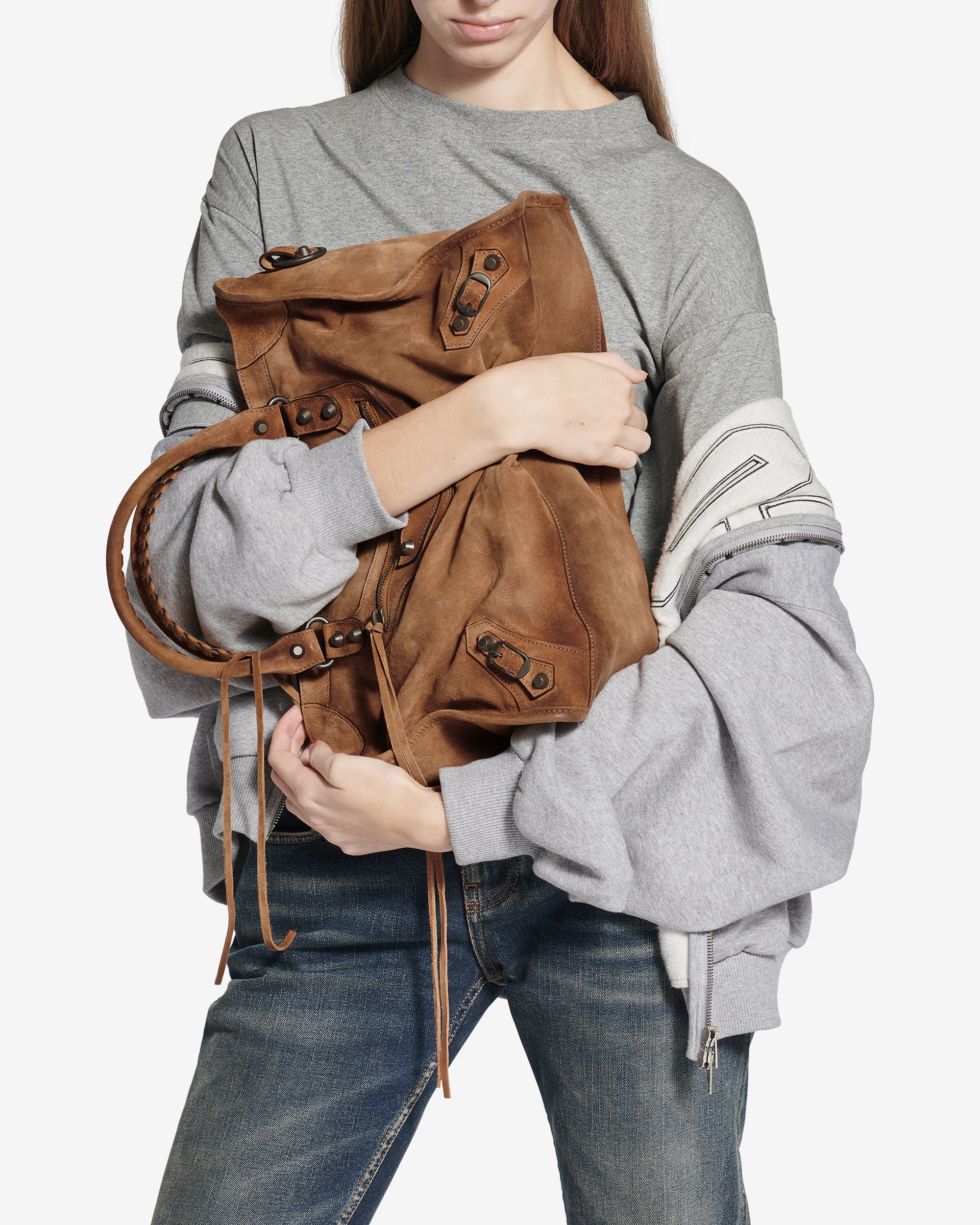 Le City Bag Medium in camel suede calfskin, brass hardware.