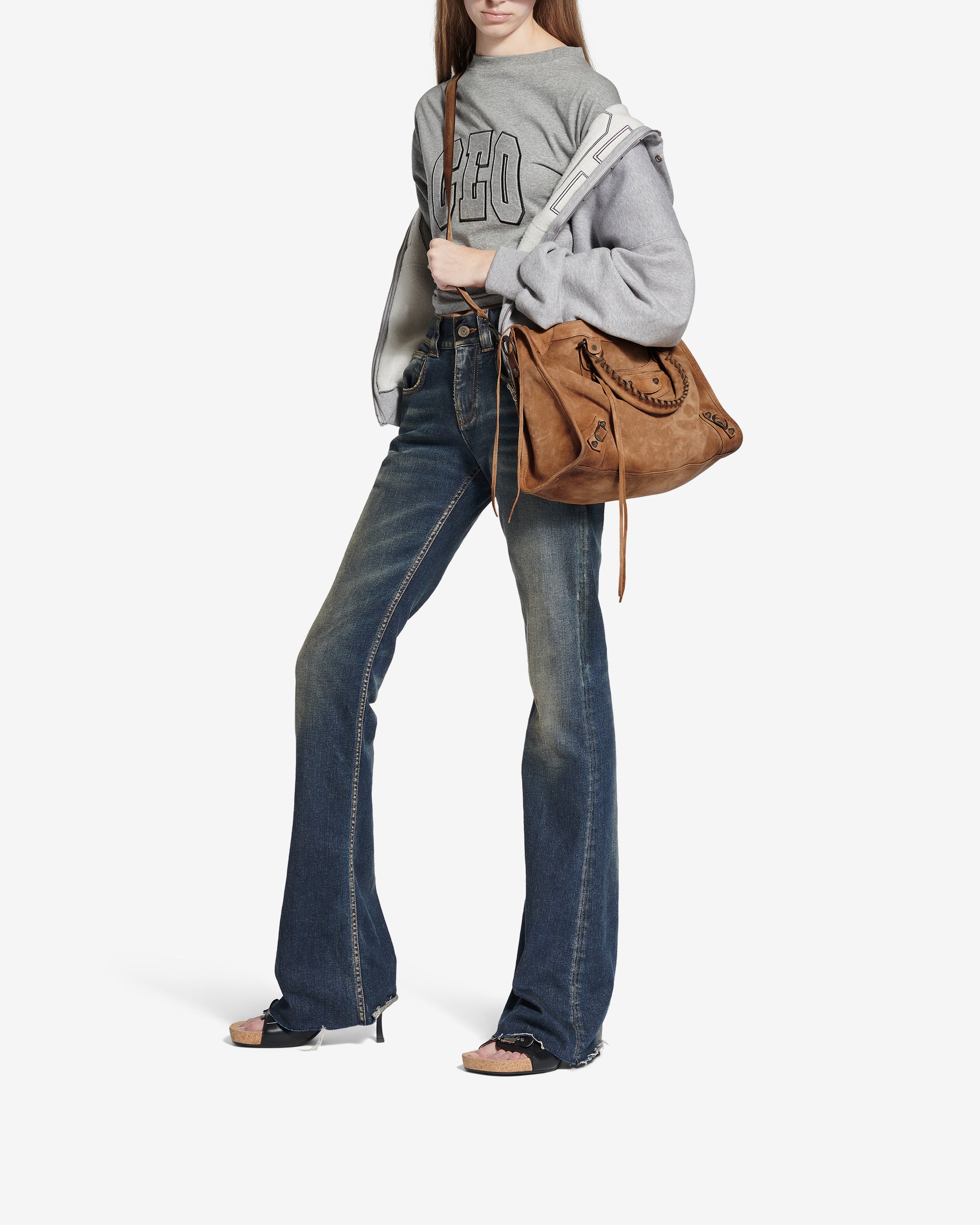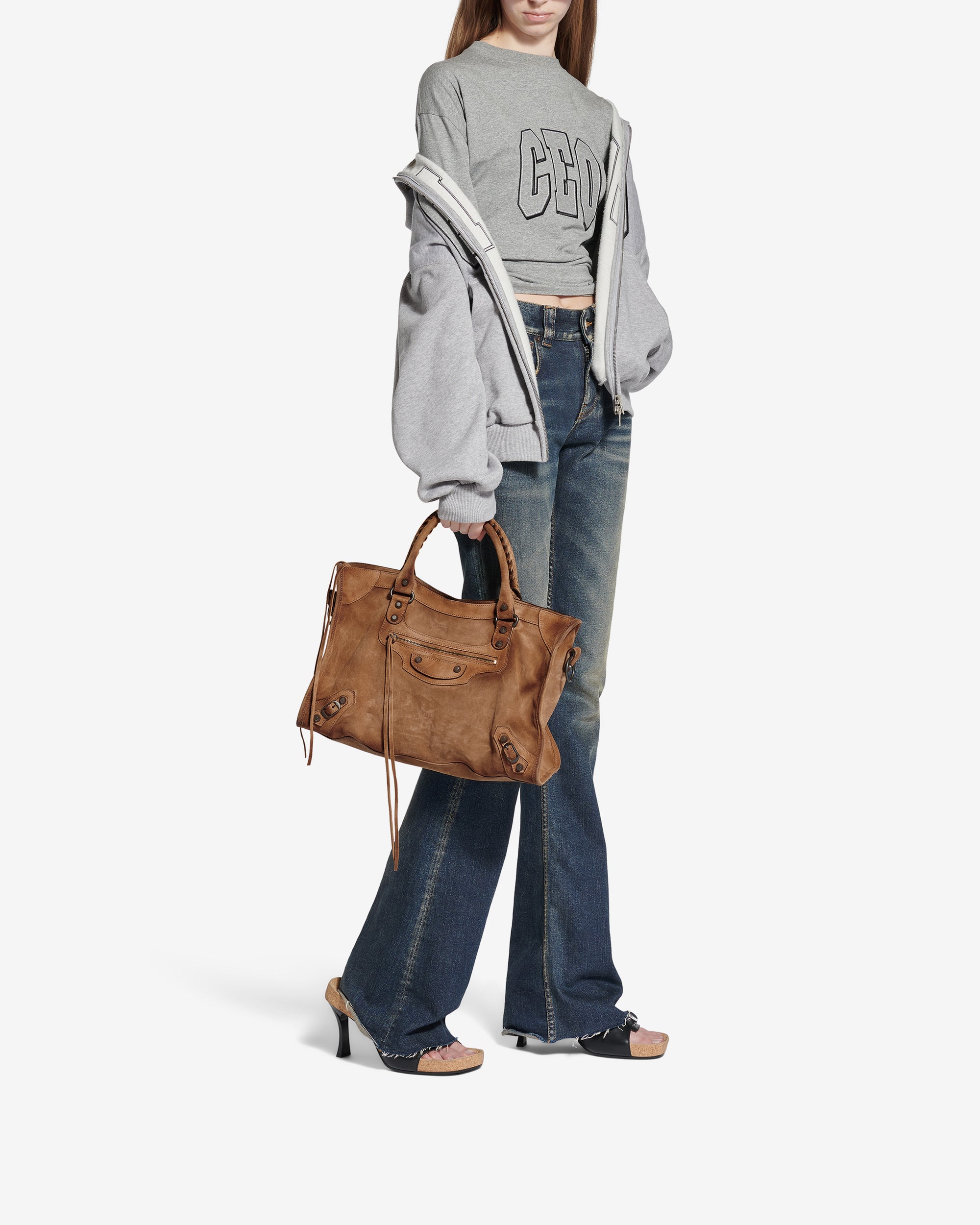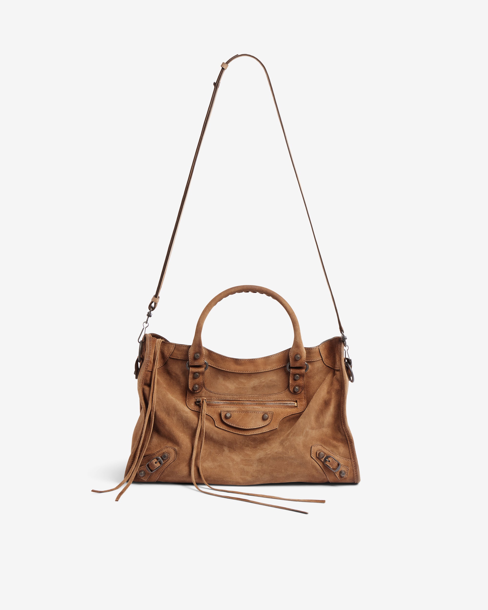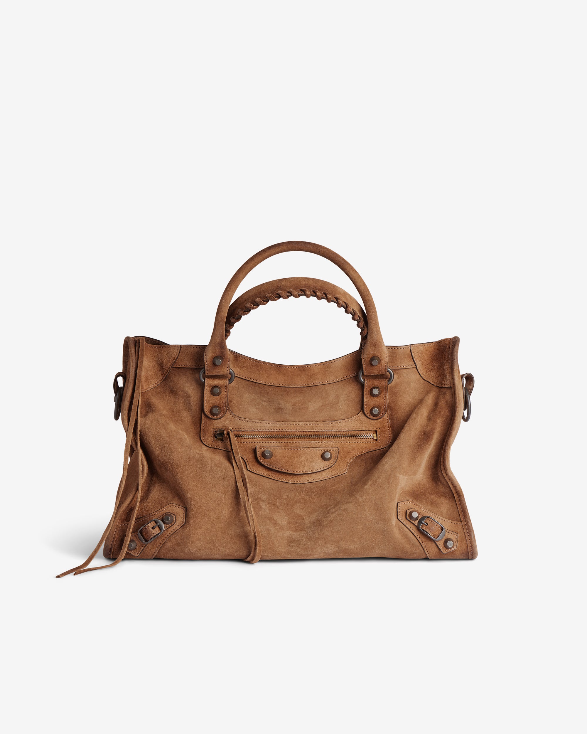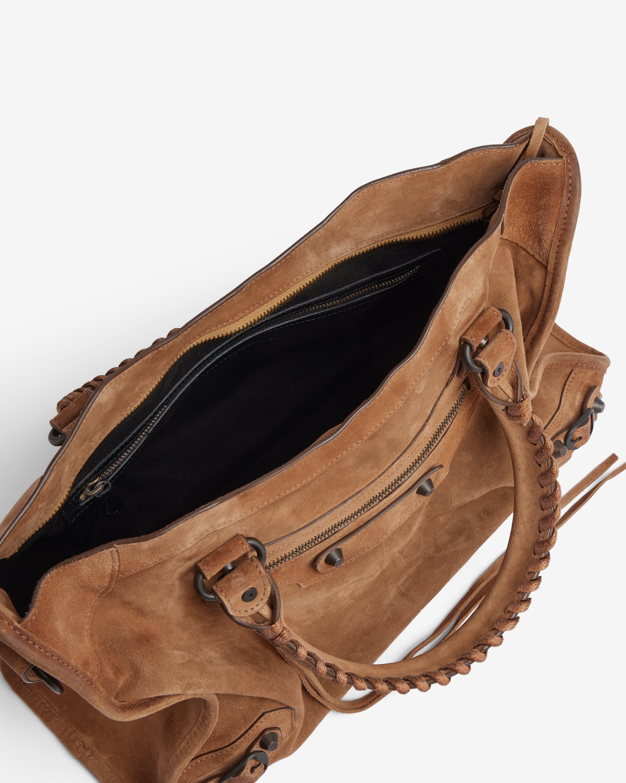 Le City Bag Medium in camel suede calfskin, brass hardware.