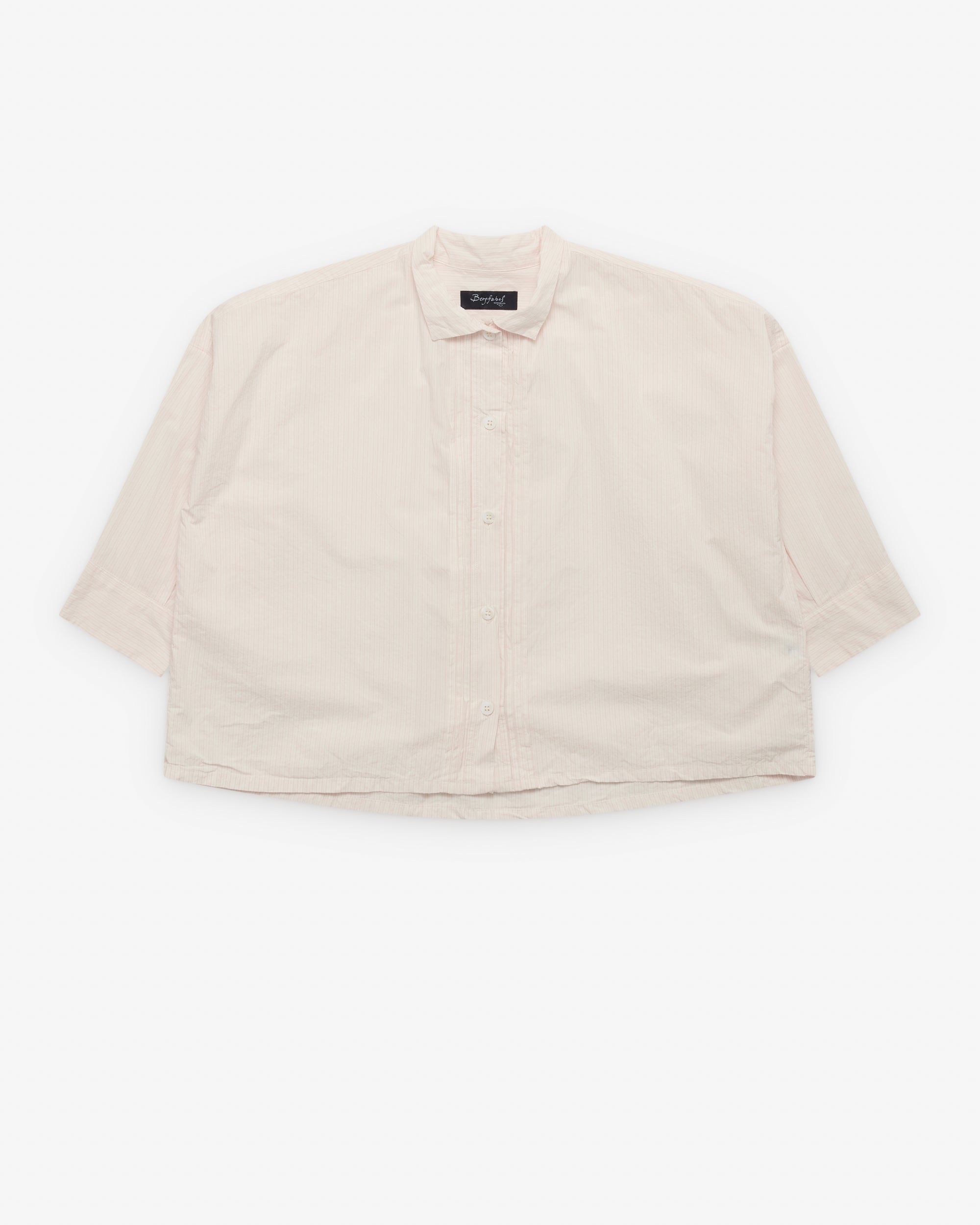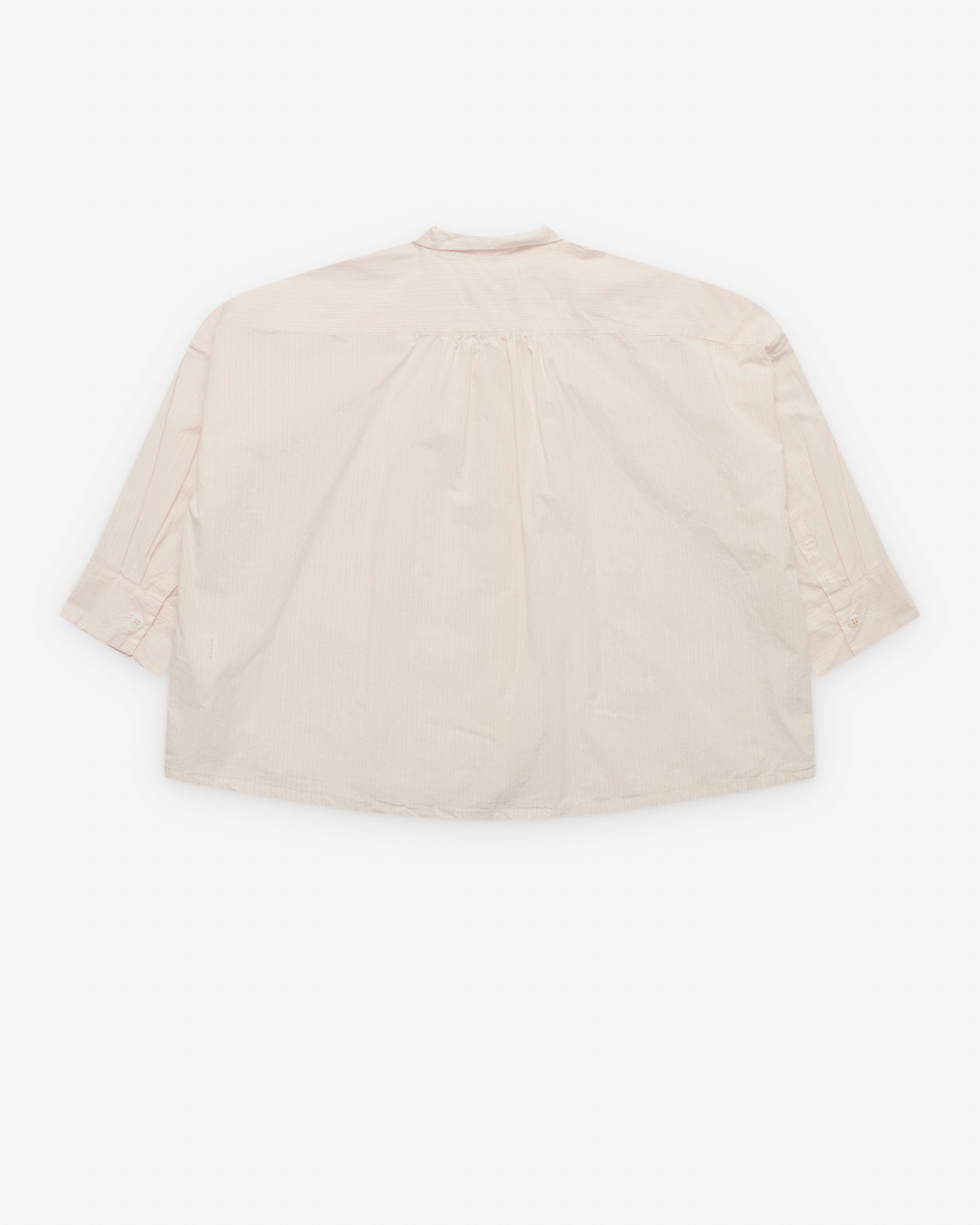 Point collarPleated detail at placket3/4 length sleevesStraight hemBoxy fit