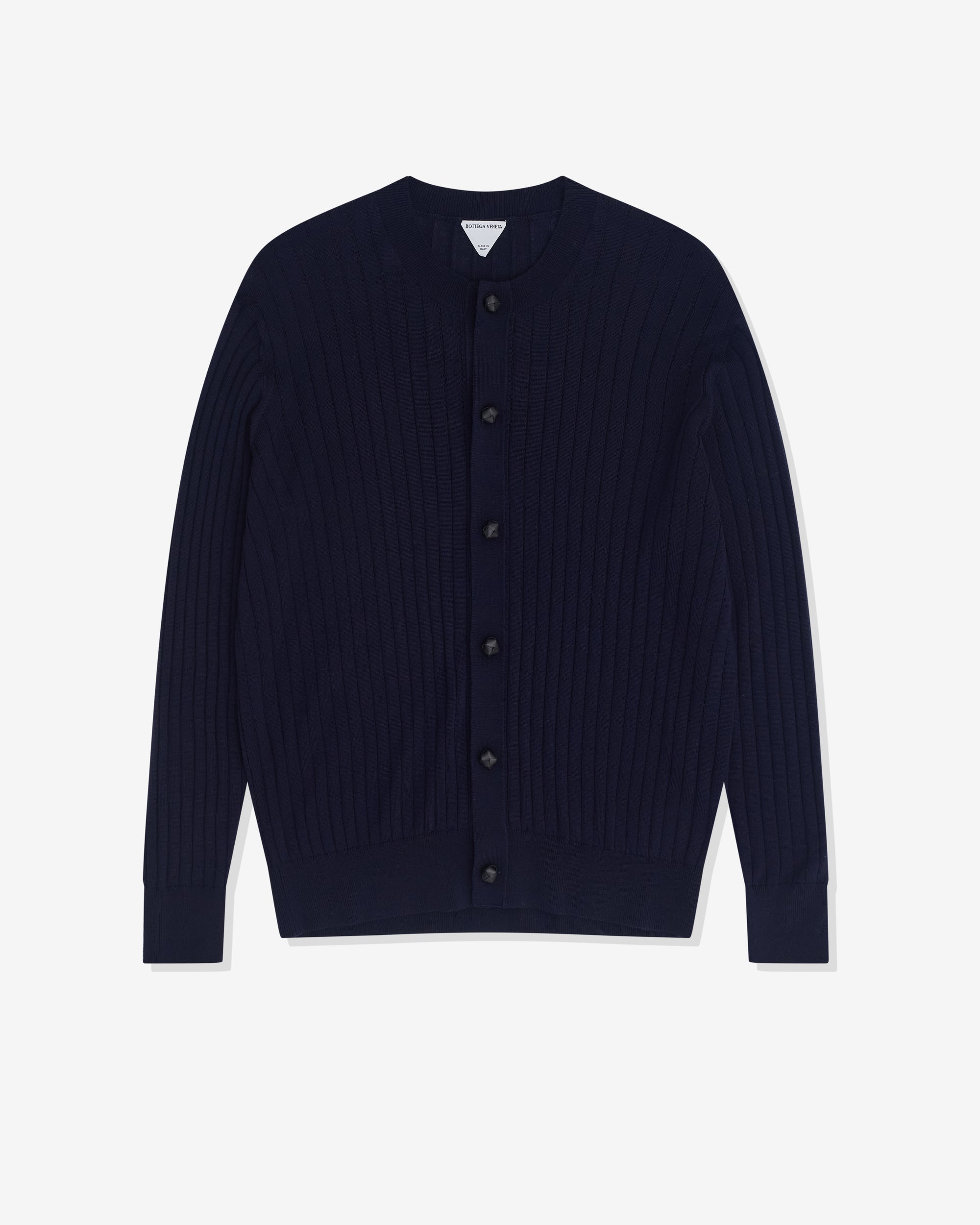 Cardigan in wool rib with Intrecciato leather buttons.