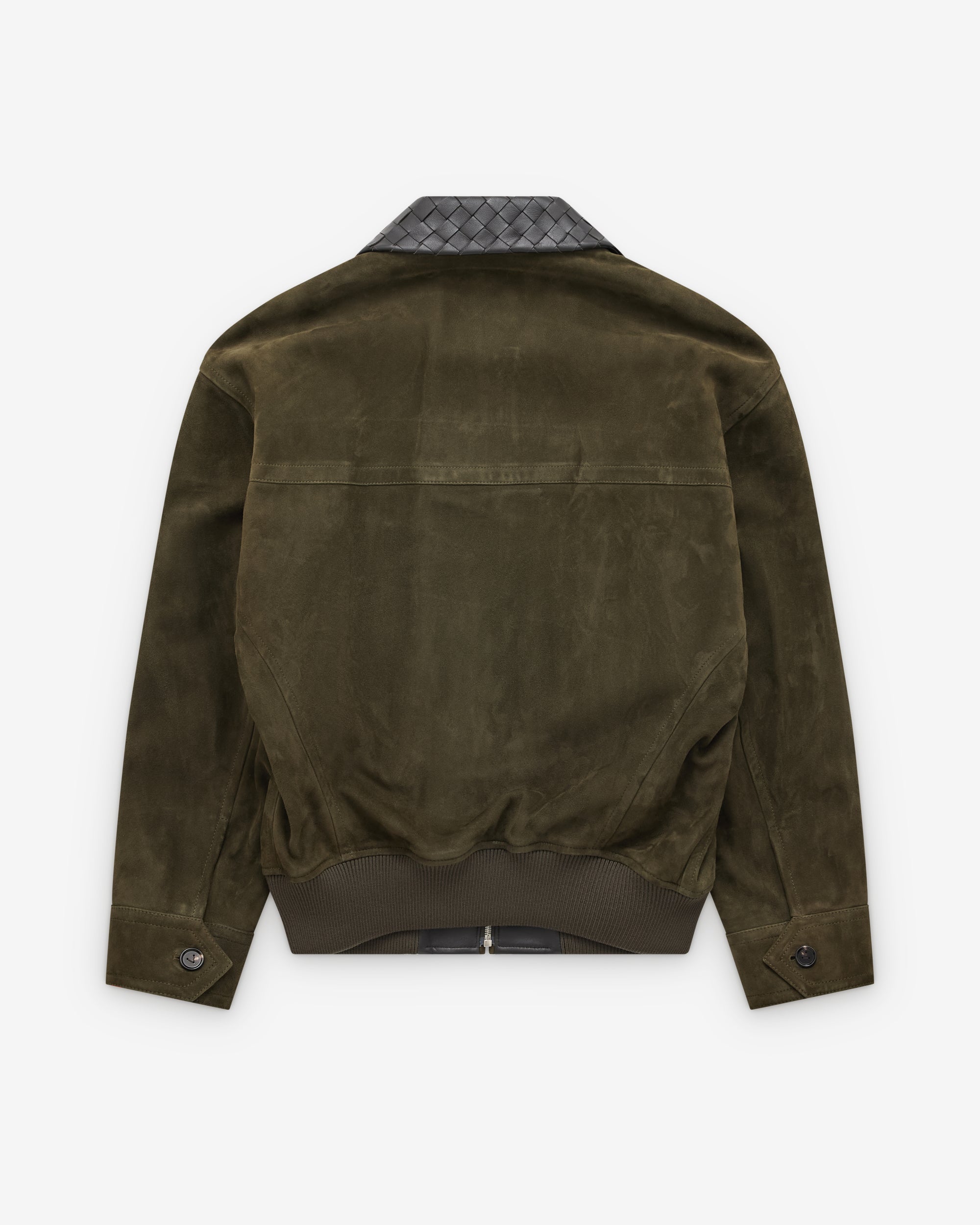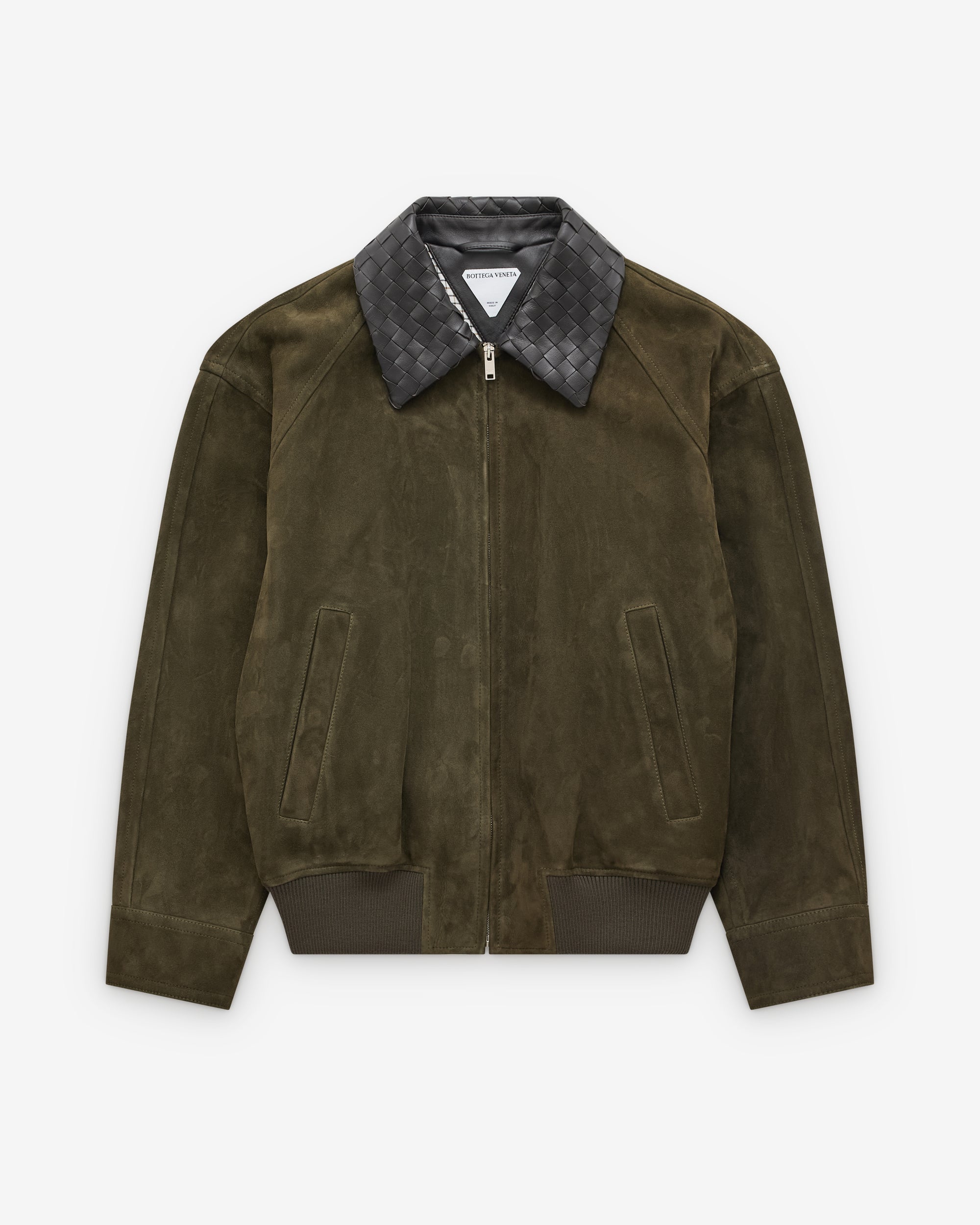 Bottega Veneta Blouson in full grain suede featuring an Intrecciato nappa leather collar.