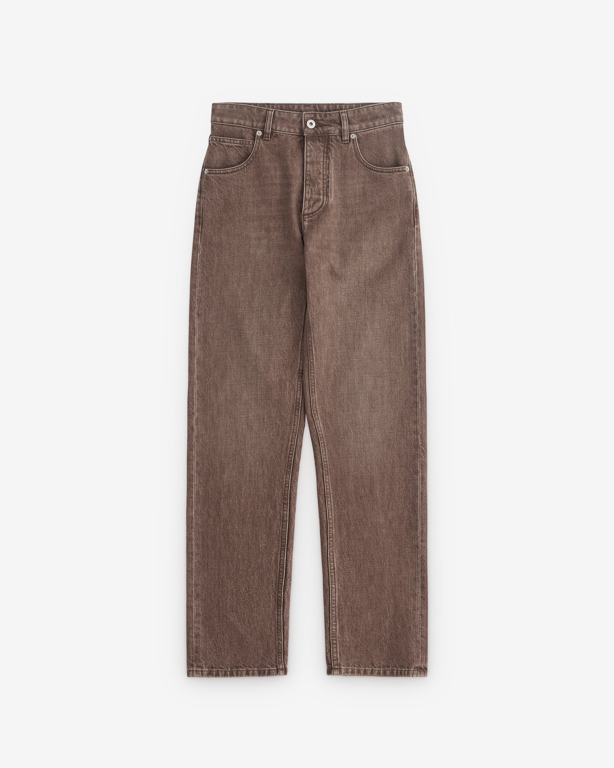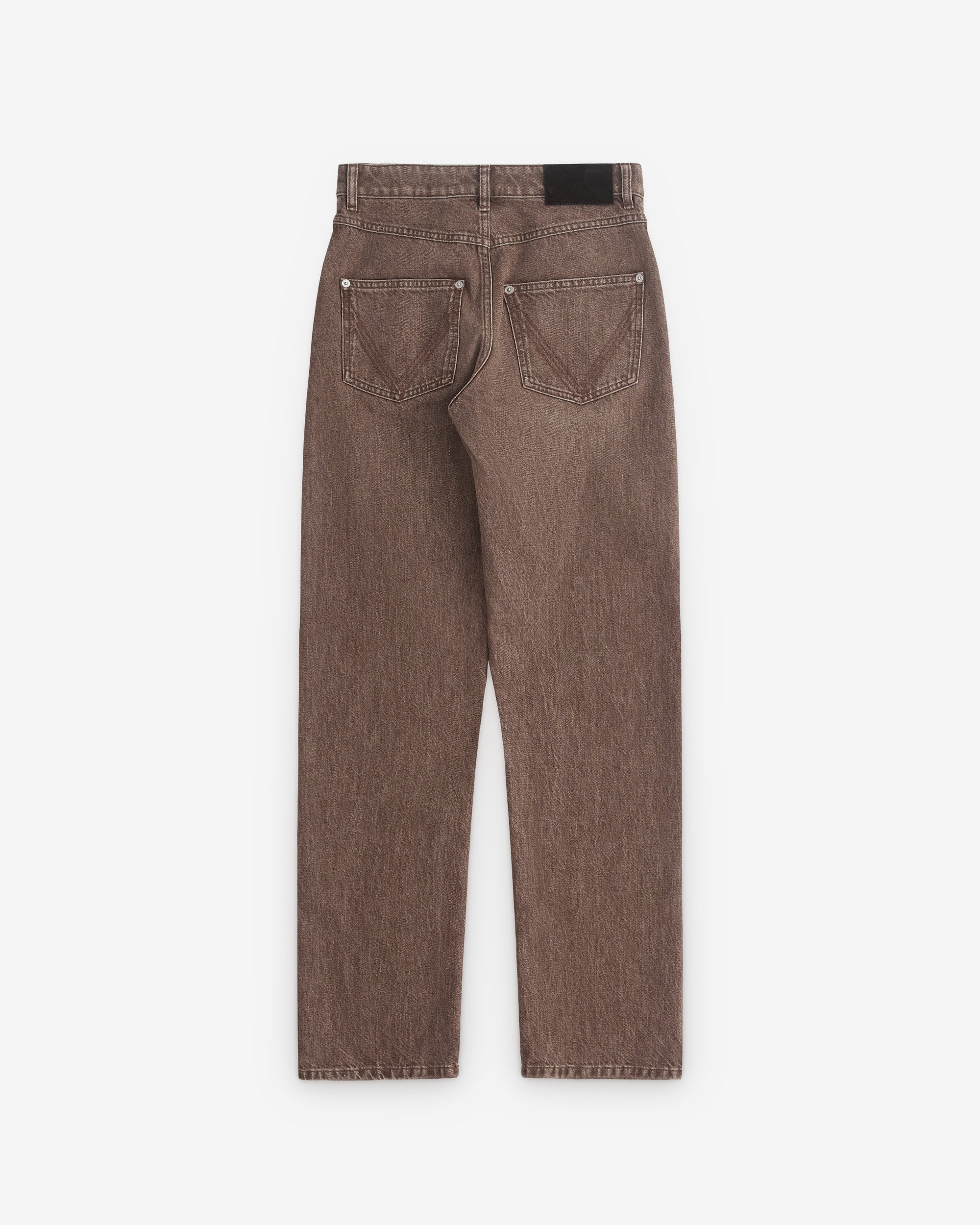 Jeans with straight leg in brown washed denim with Intrecciato suede back patch.