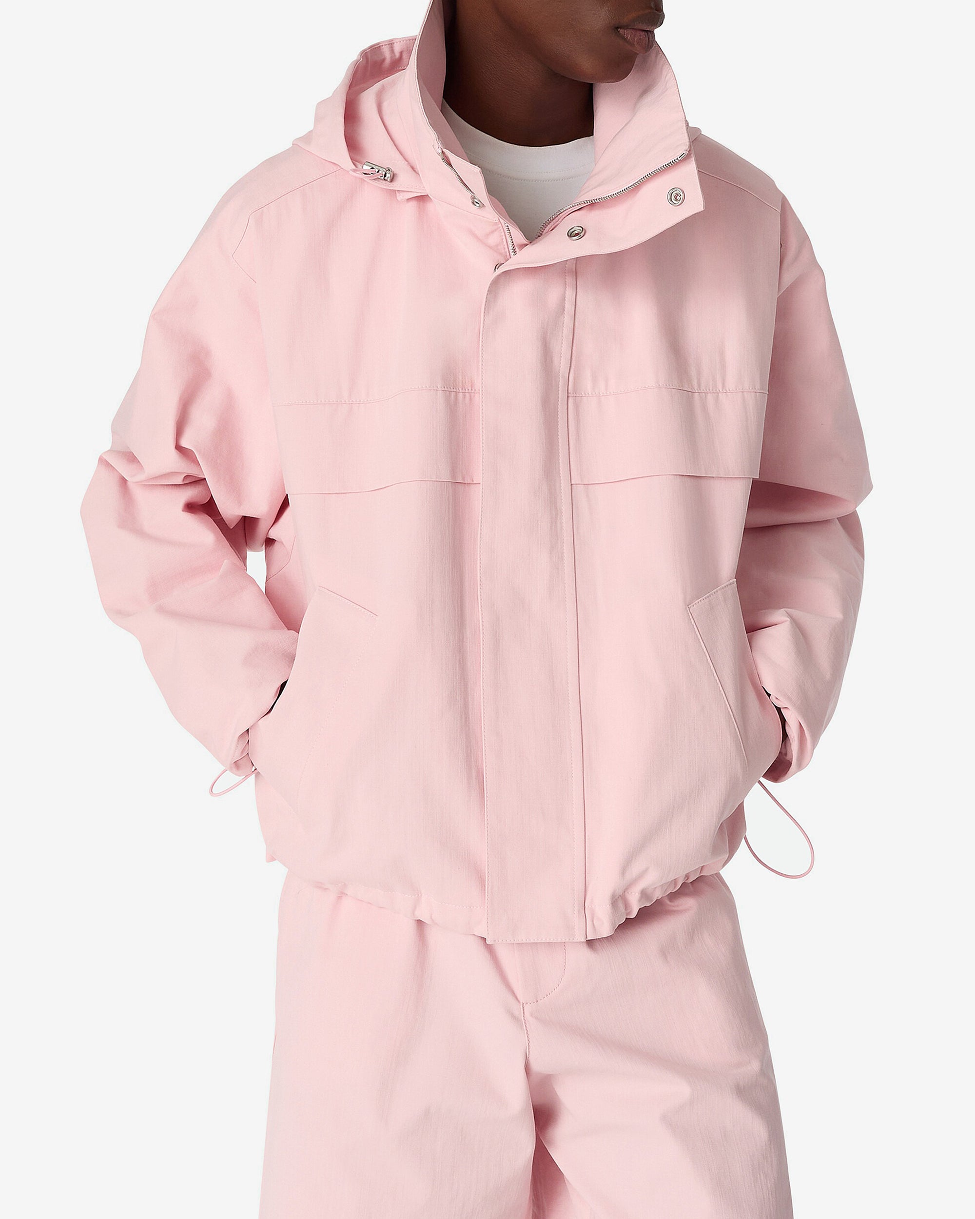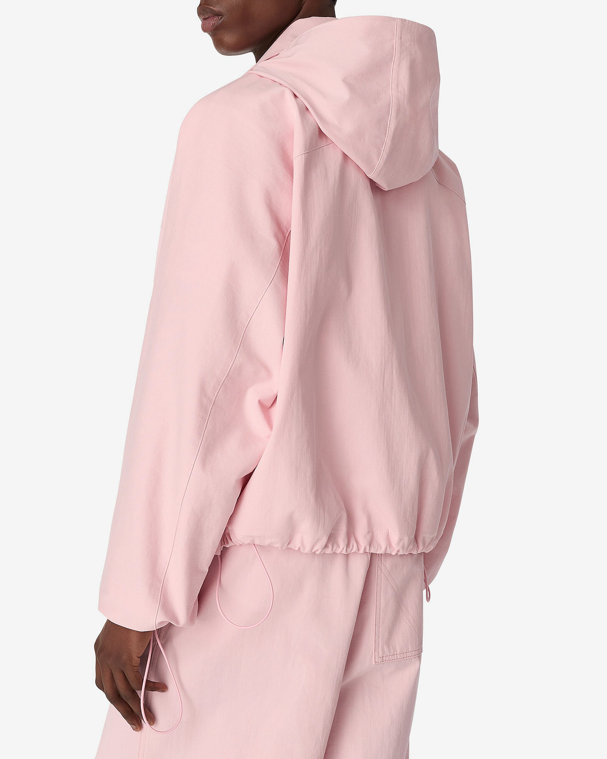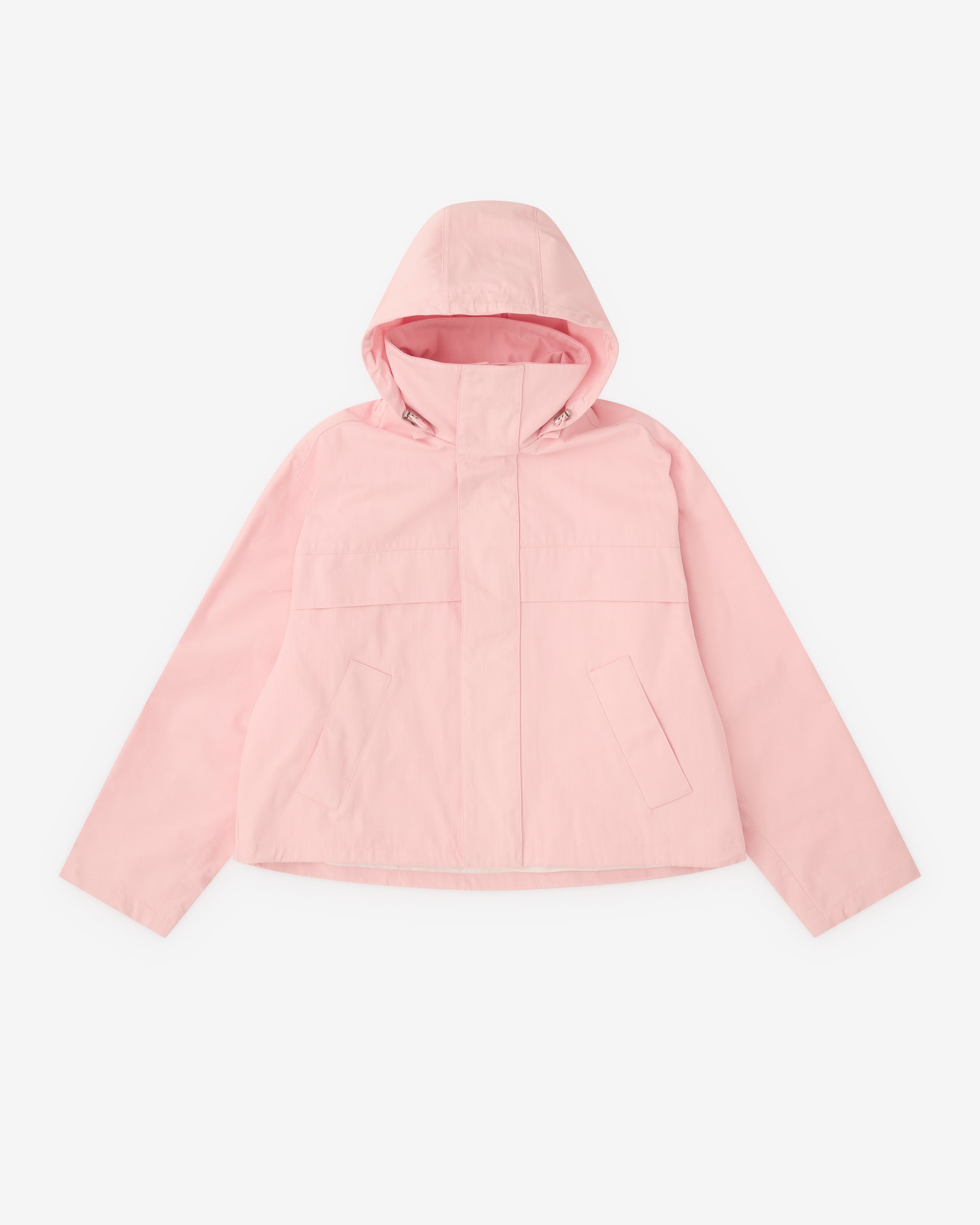 Washed irregular cotton twill blouson Packable hood Zip and snap button closure Lined Relaxed fit