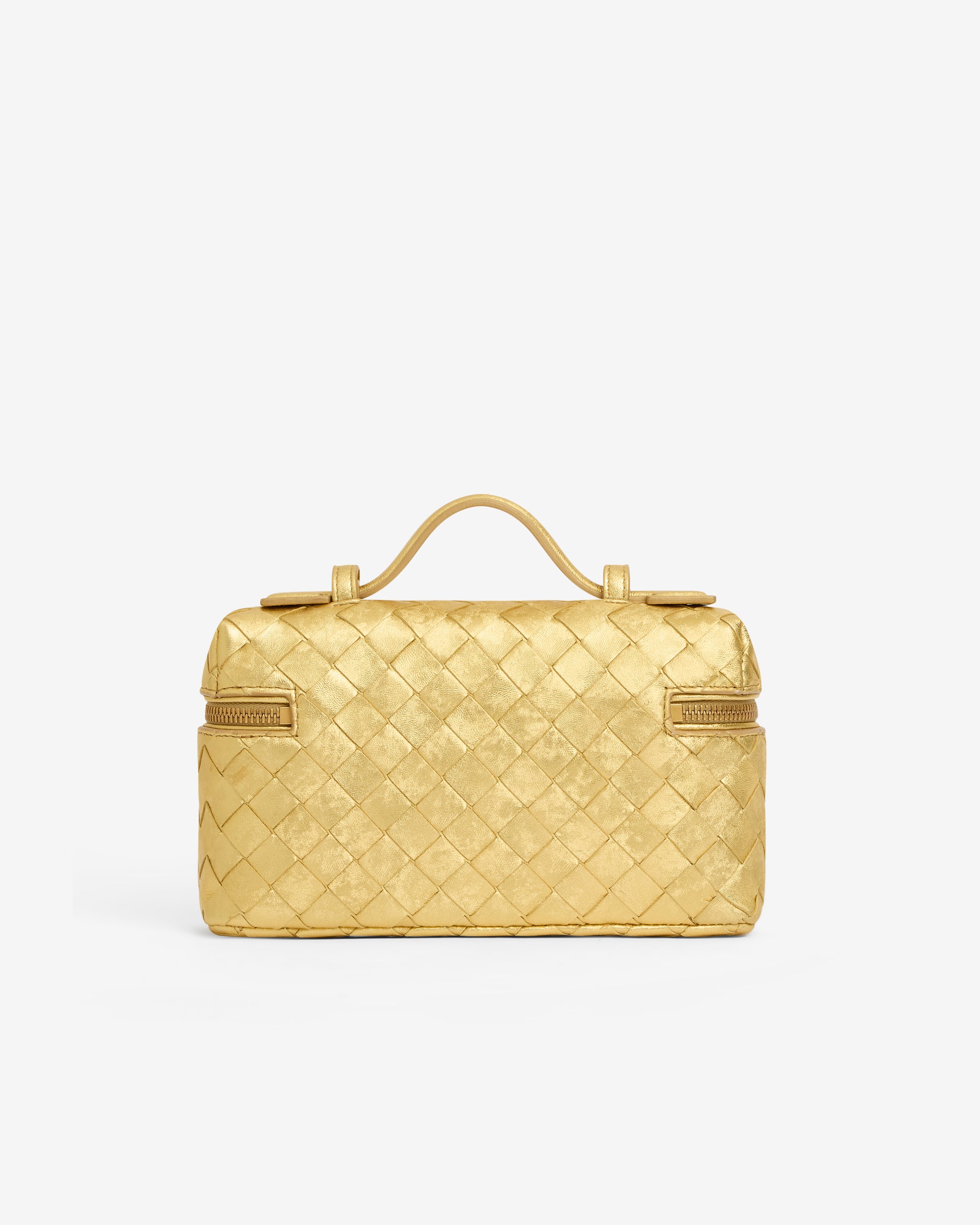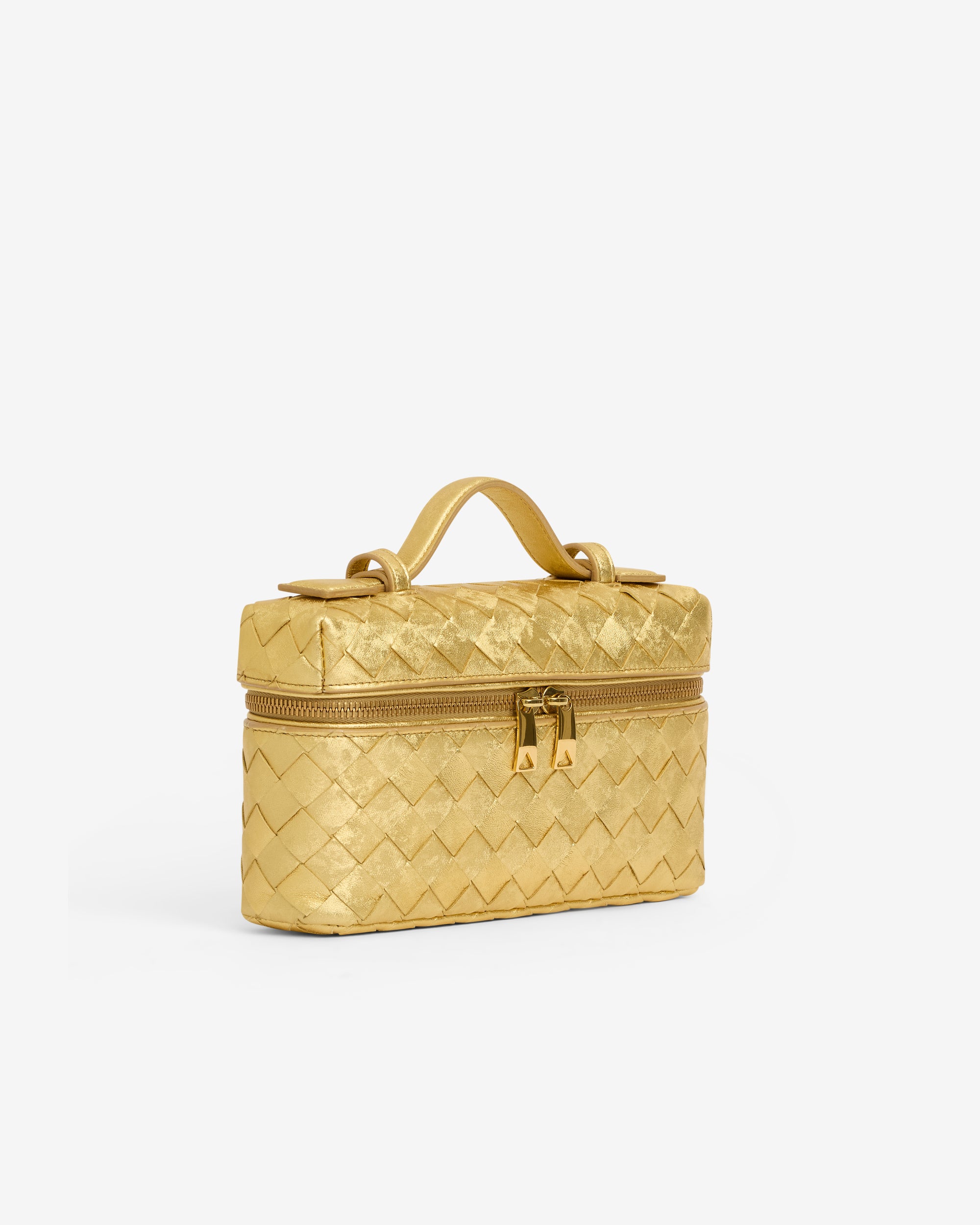 Vanity case in Intrecciato laminated leather with satin finish, featuring a detachable strap.