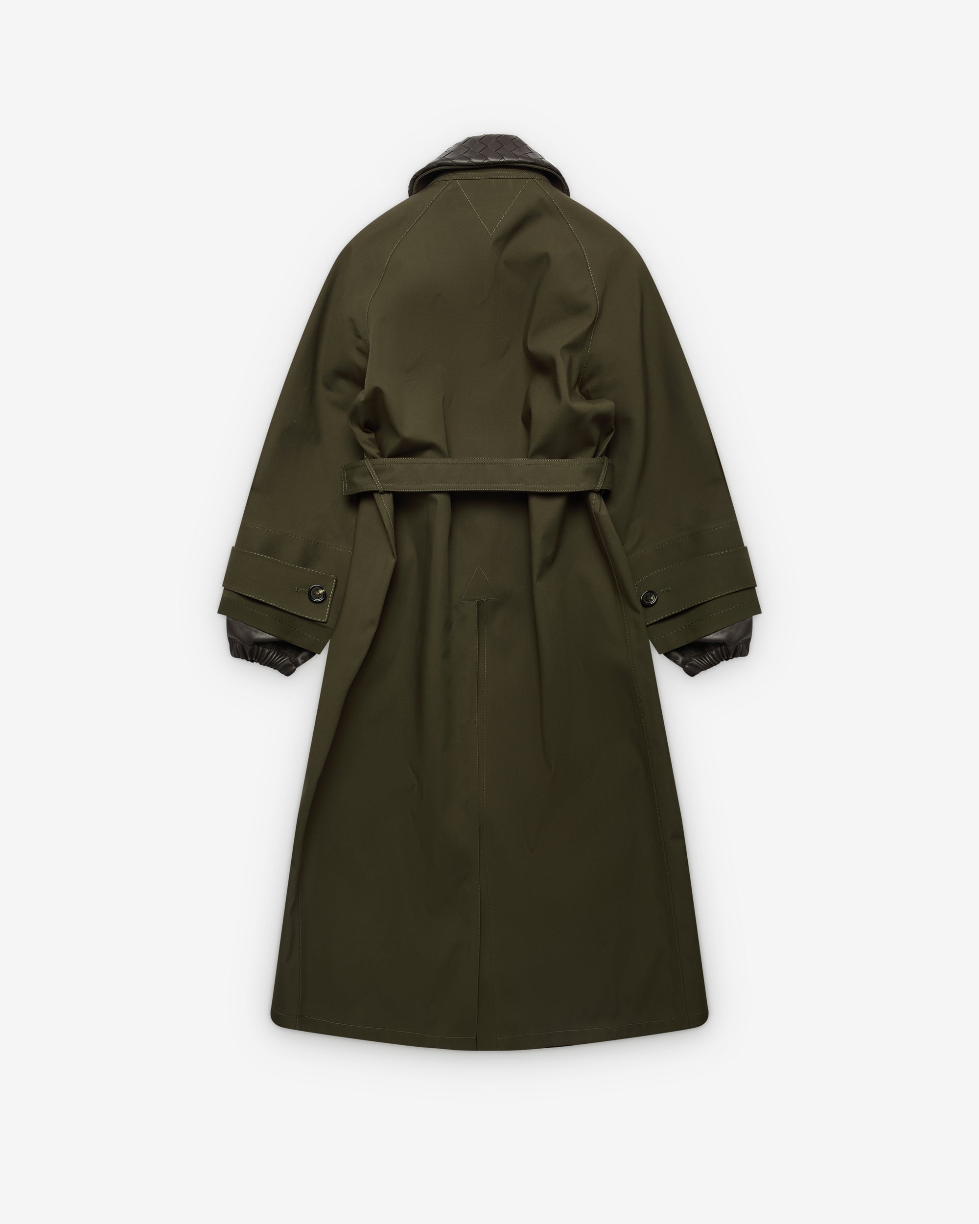 Trench coat in water-repellent stretch cotton with detachable Intrecciato leather collar.