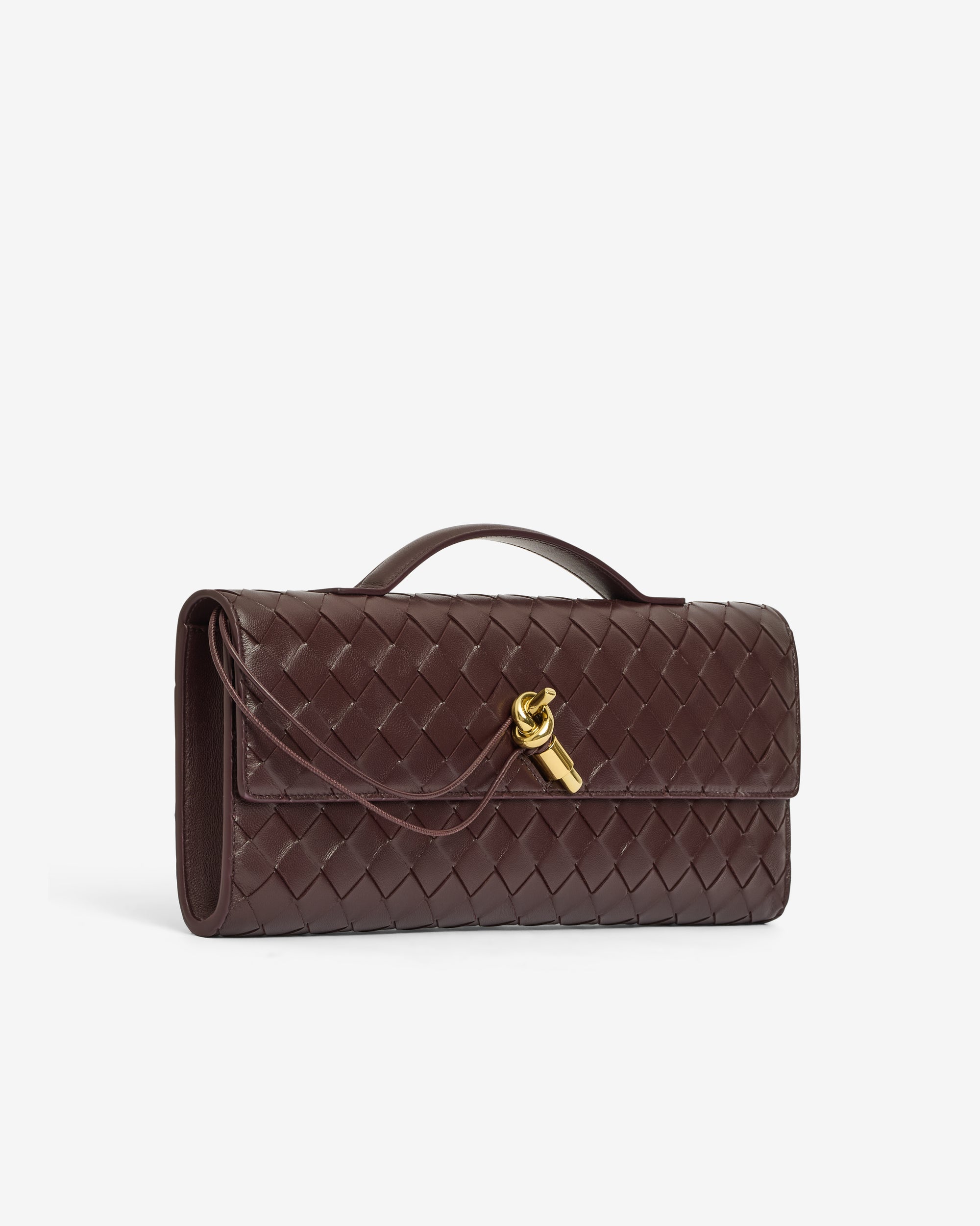 Top handle clutch in supple Intrecciato leather with signature knot closure.