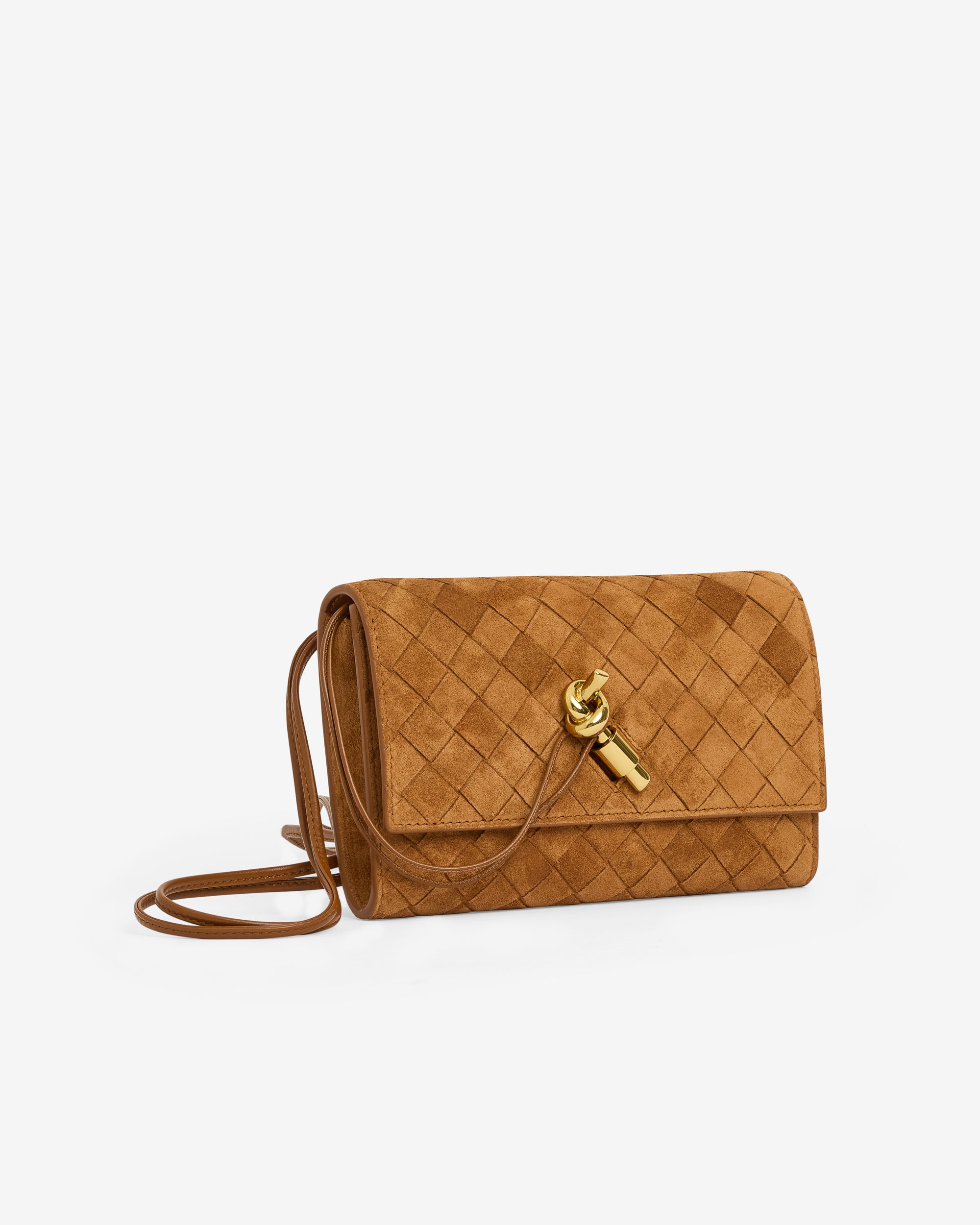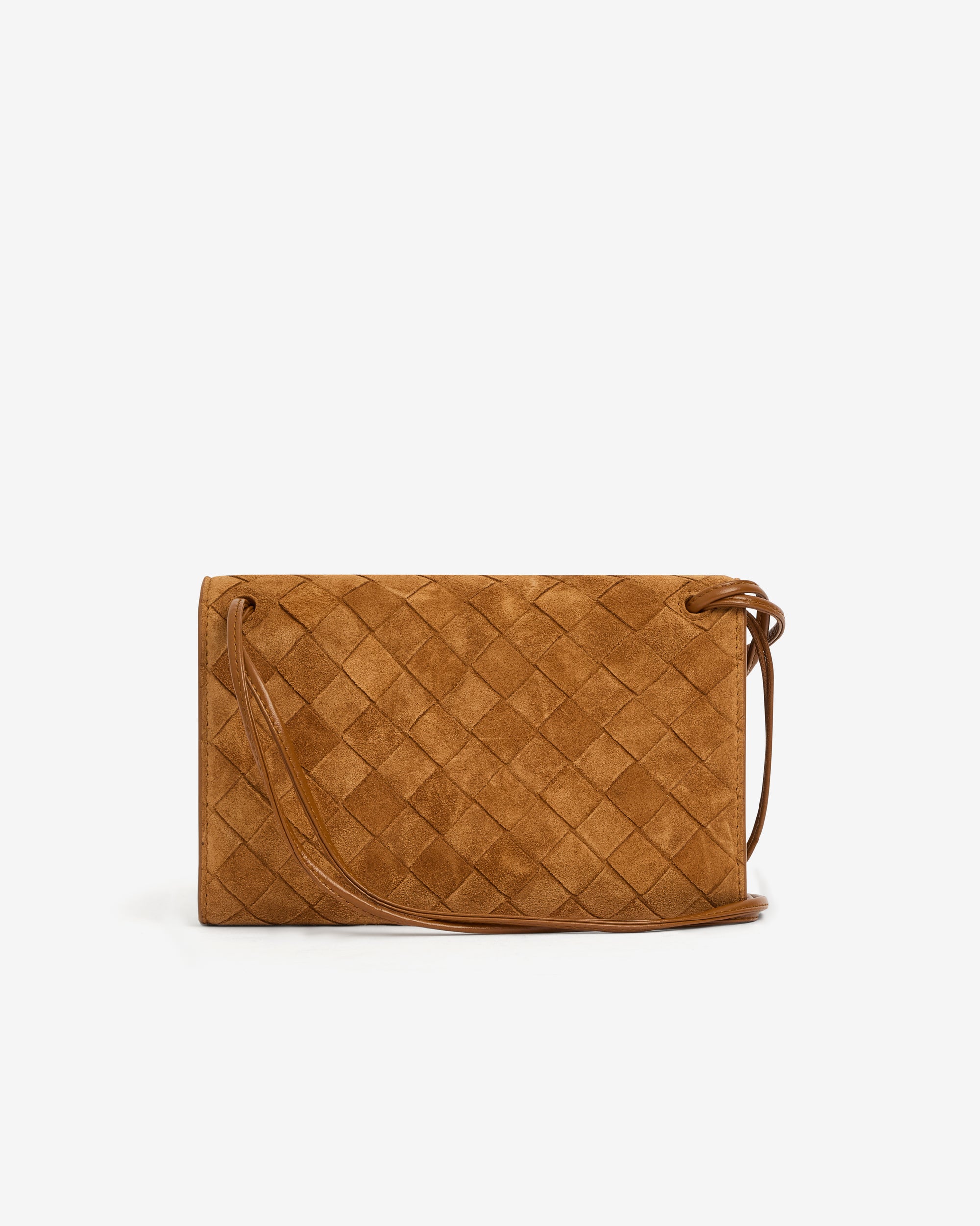 Pouch in Intrecciato suede with signature knot closure and sliding strap.