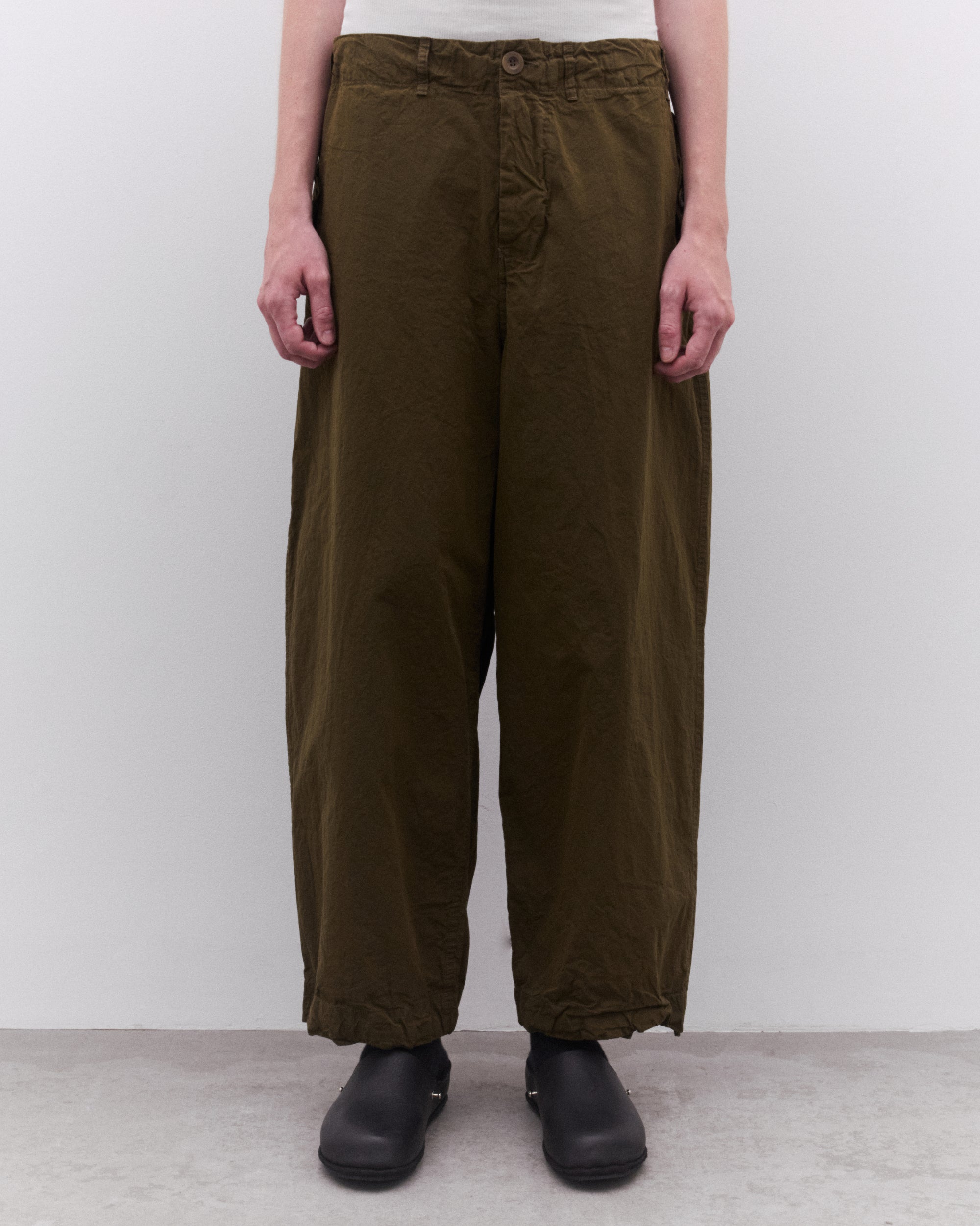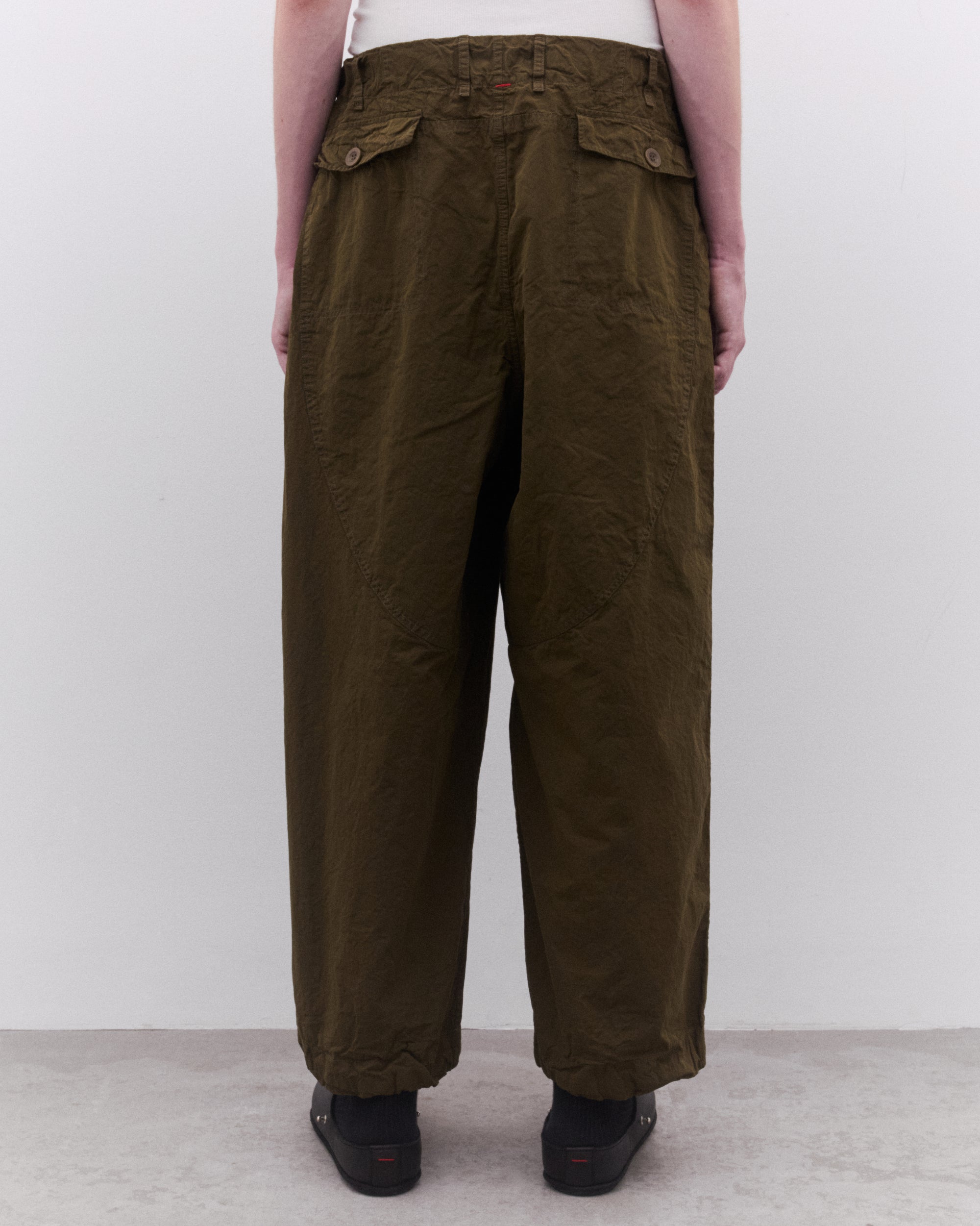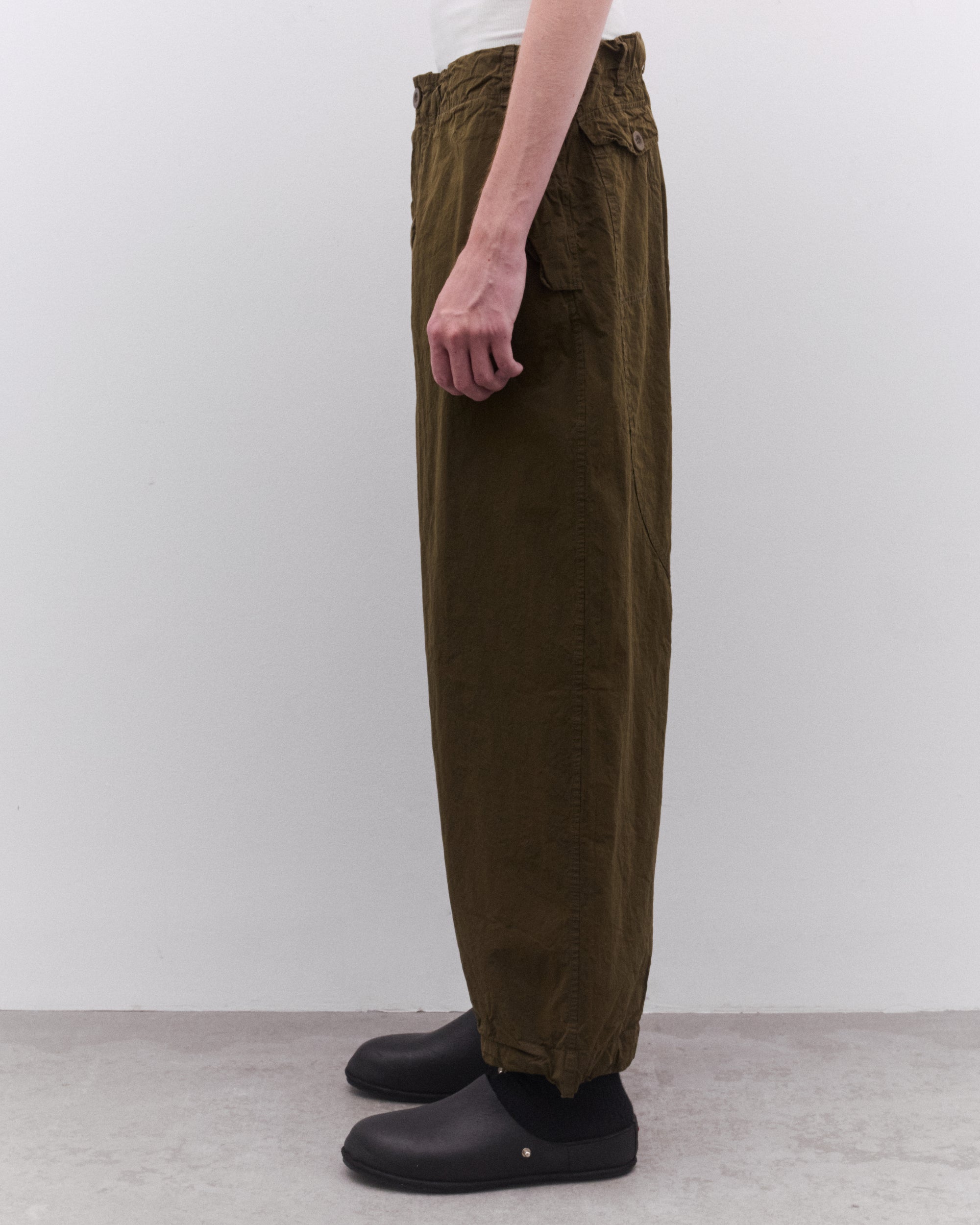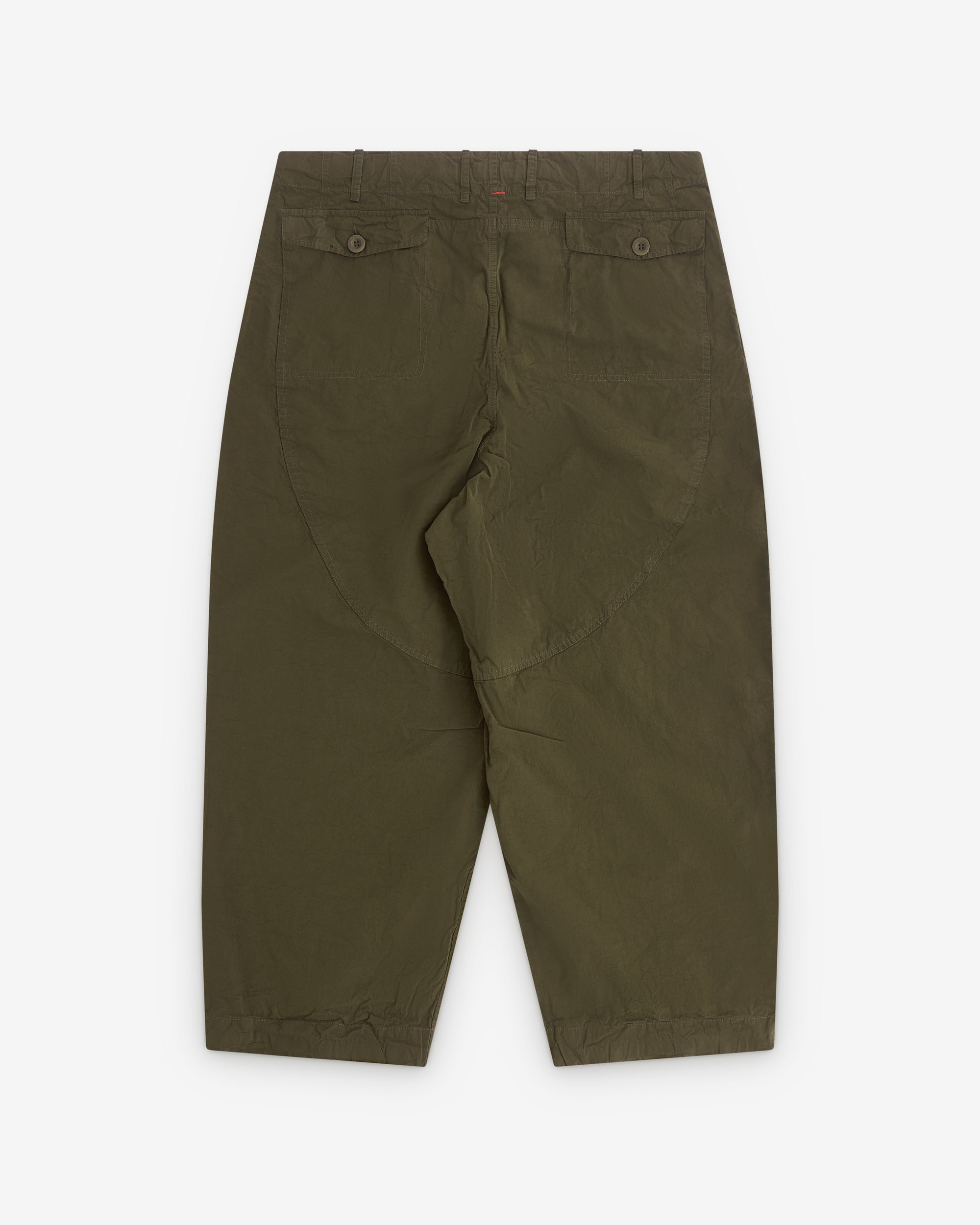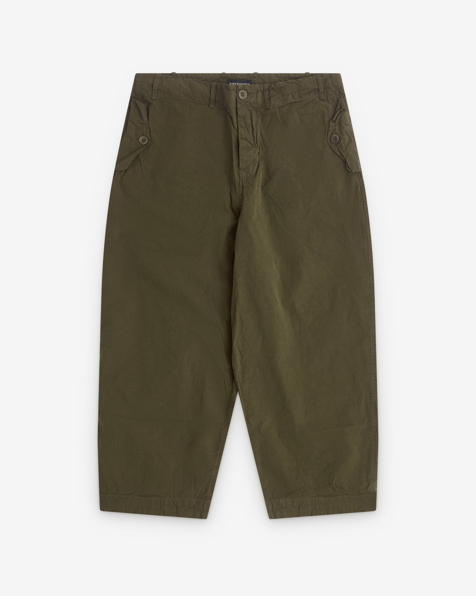Straight legButton and fly closureButton down flap pocket at side seamRear button down flap pocketsBelt loopsWashed cotton fabric