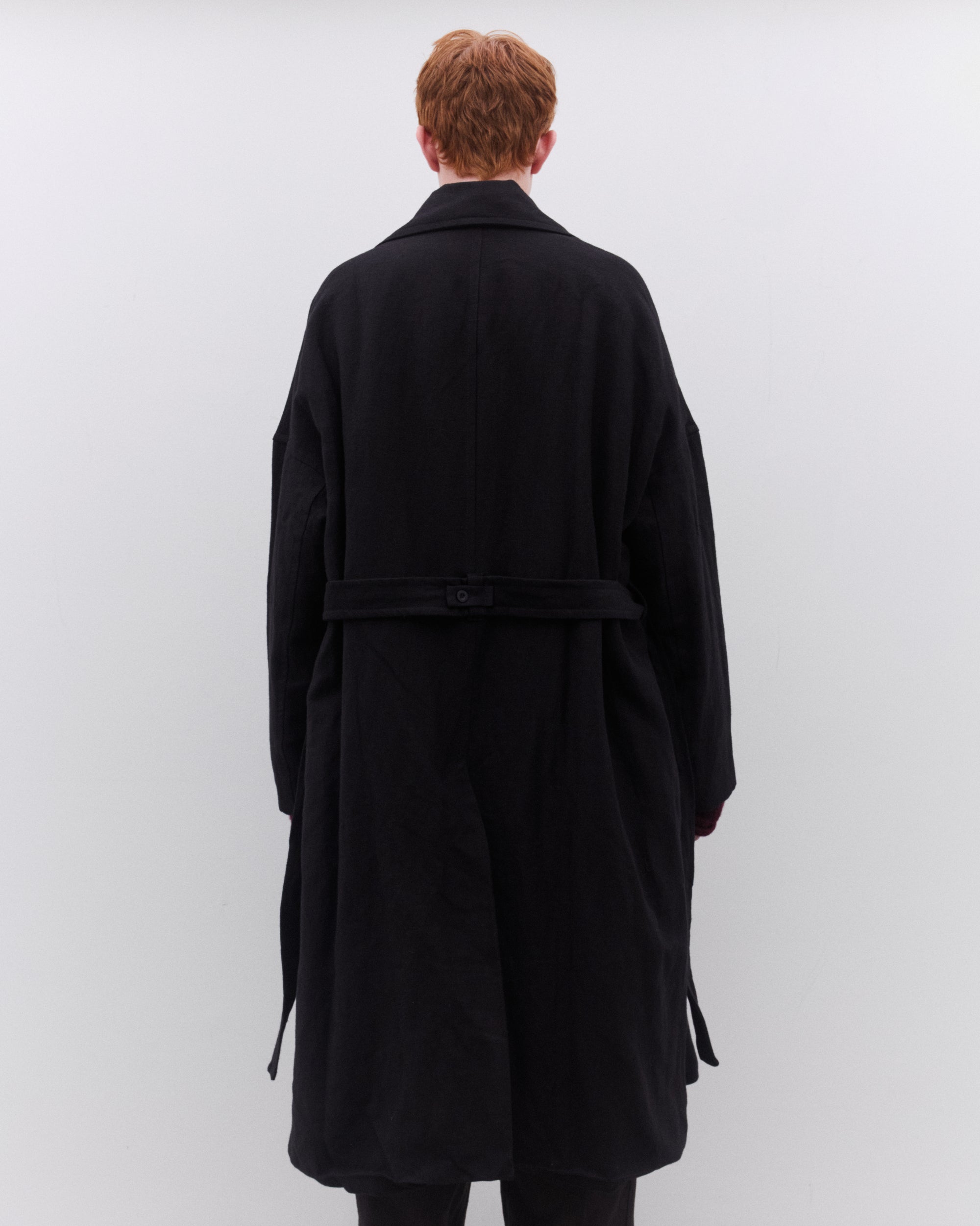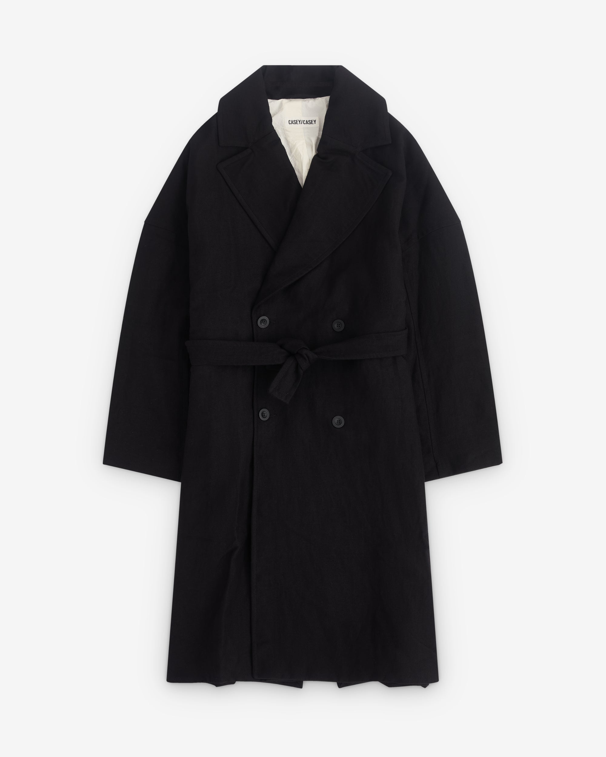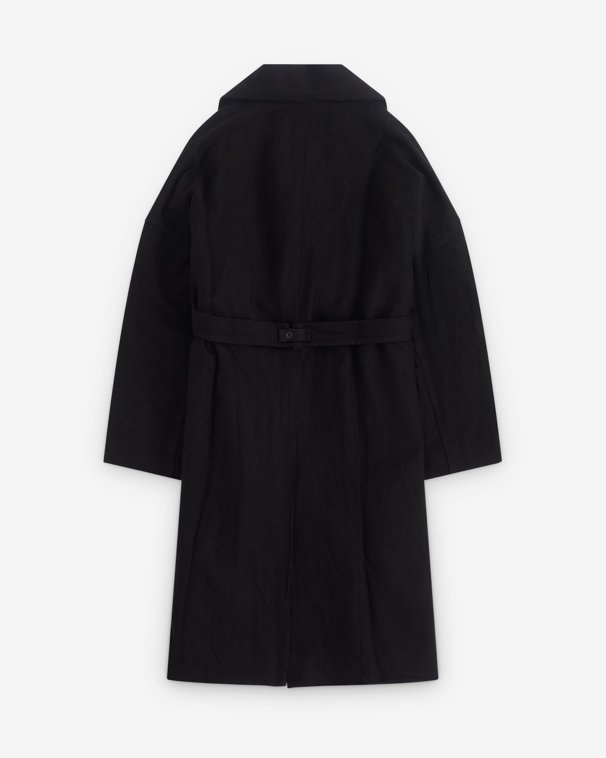 Double breasted closureNotched lapel collarFull internal liningTie at waistKnee length Boxy fit