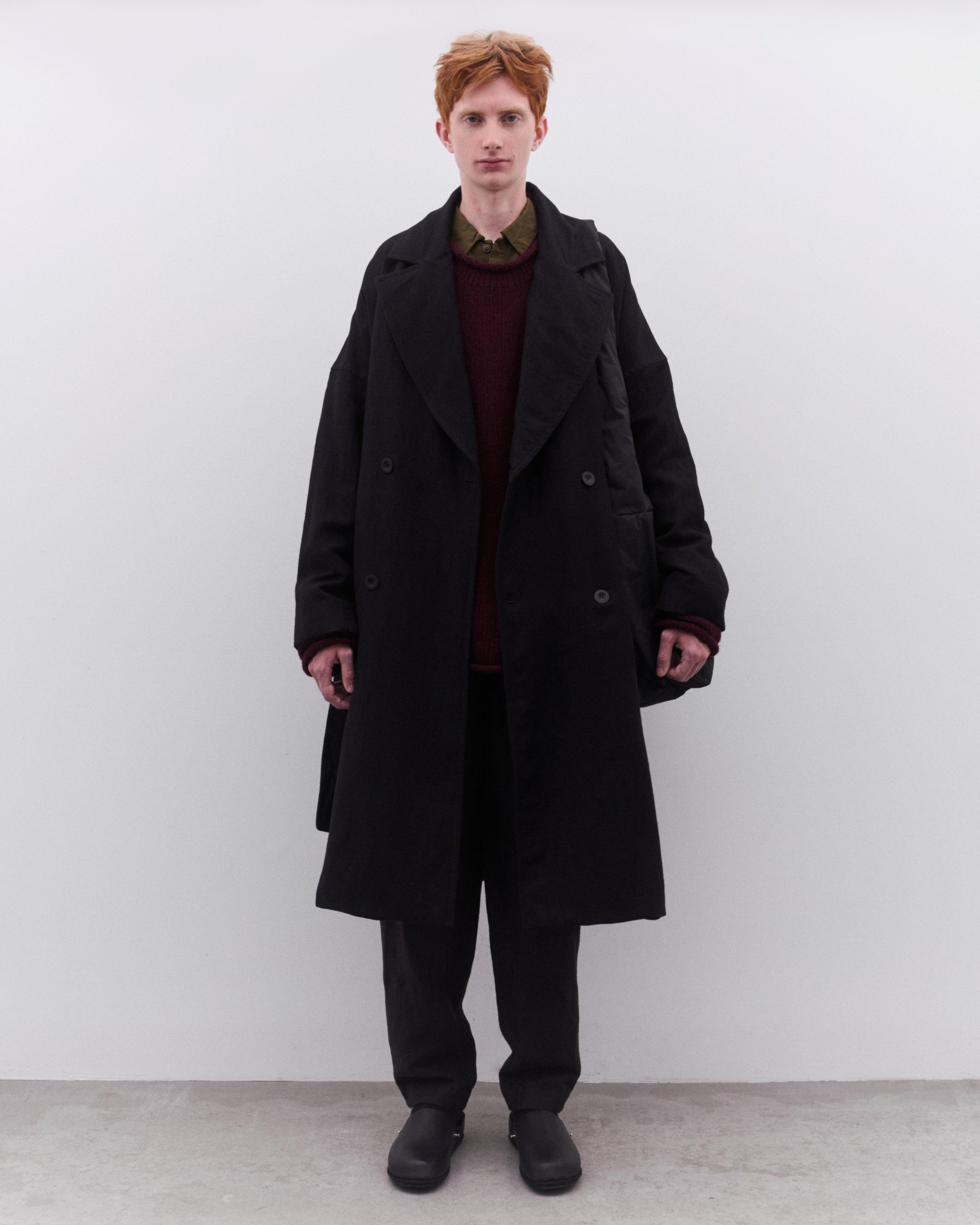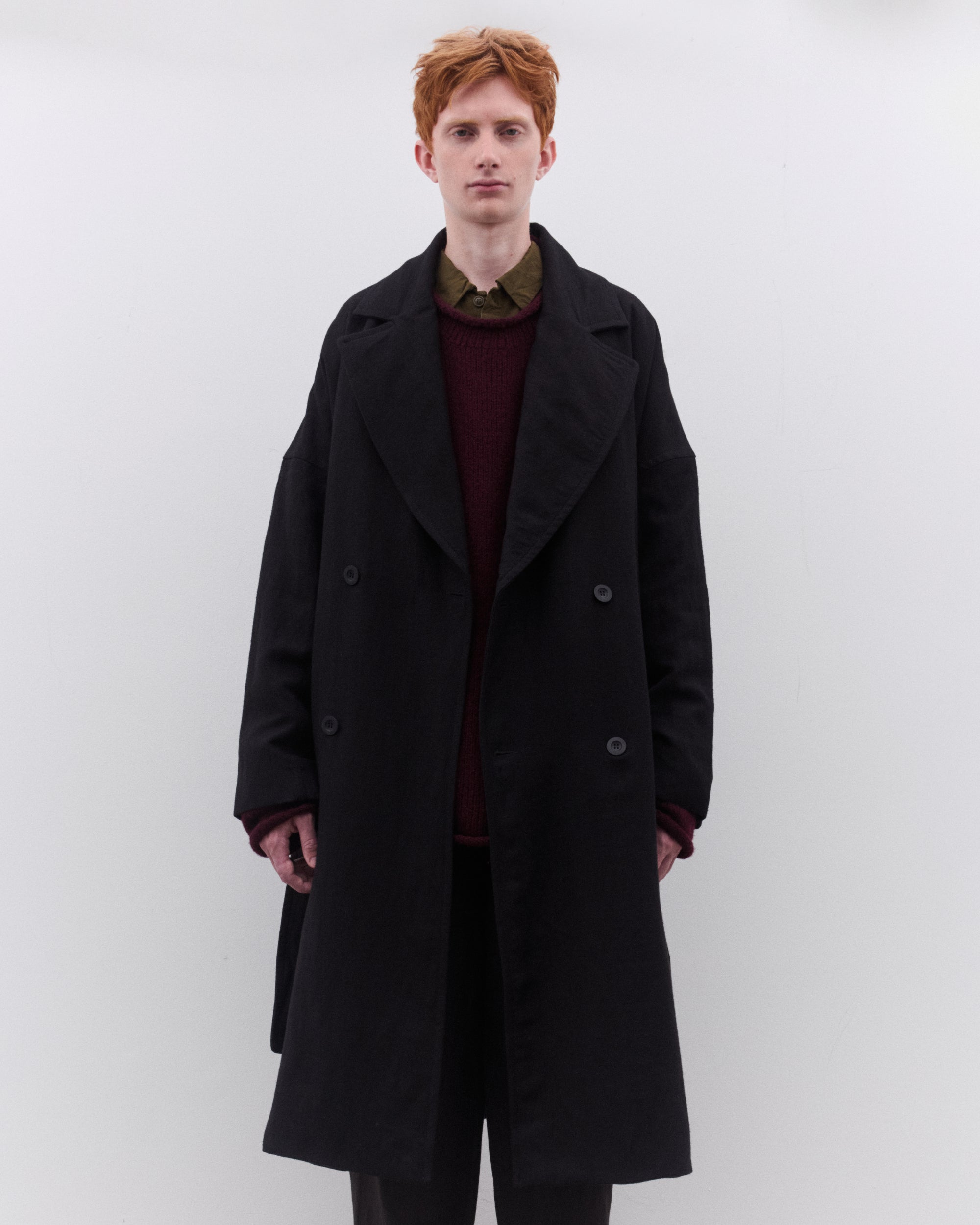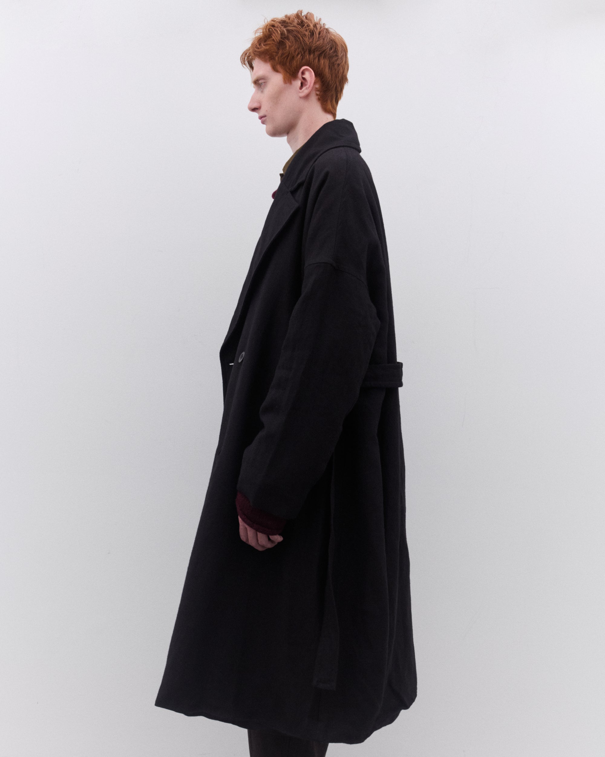 Double breasted closureNotched lapel collarFull internal liningTie at waistKnee length Boxy fit
