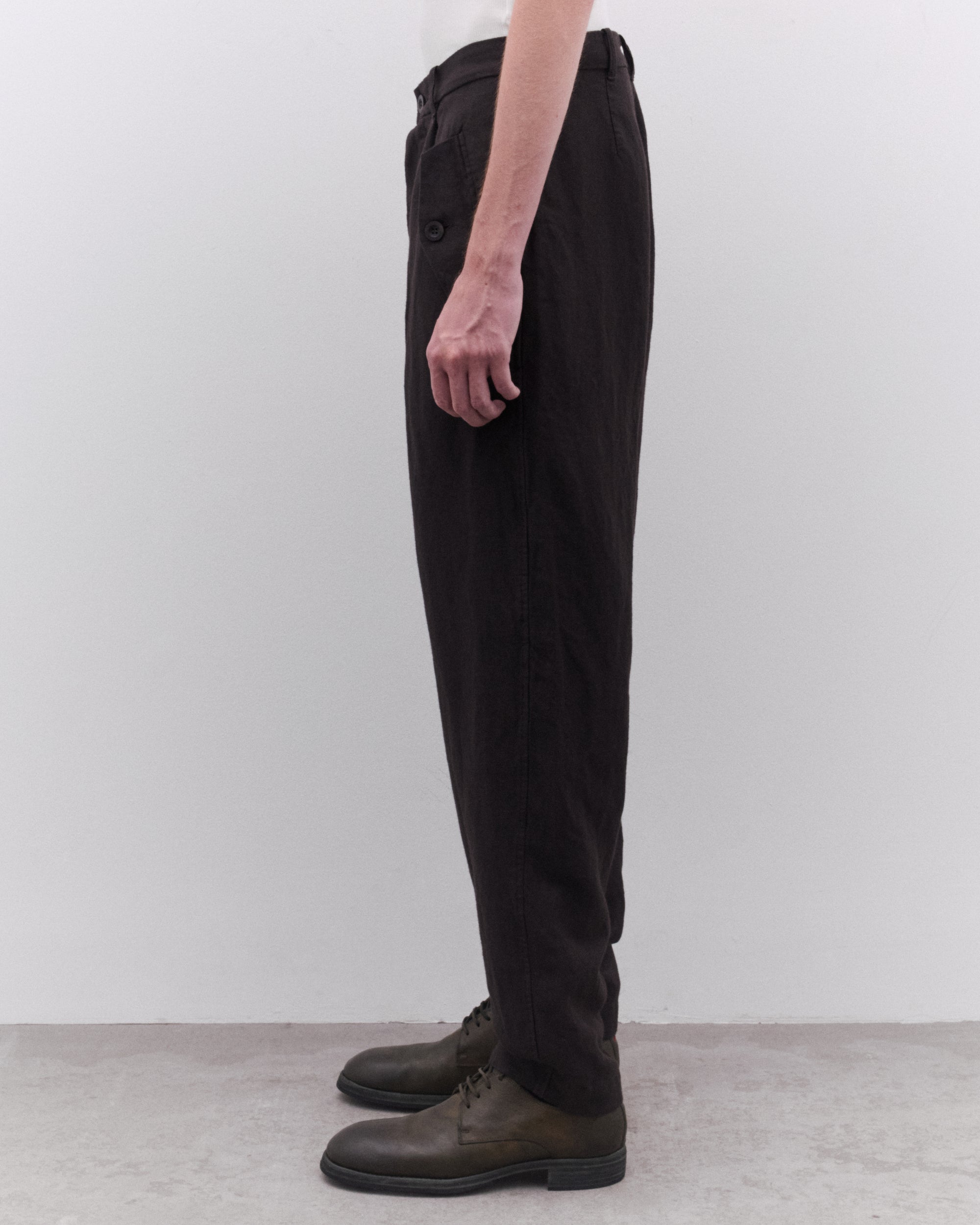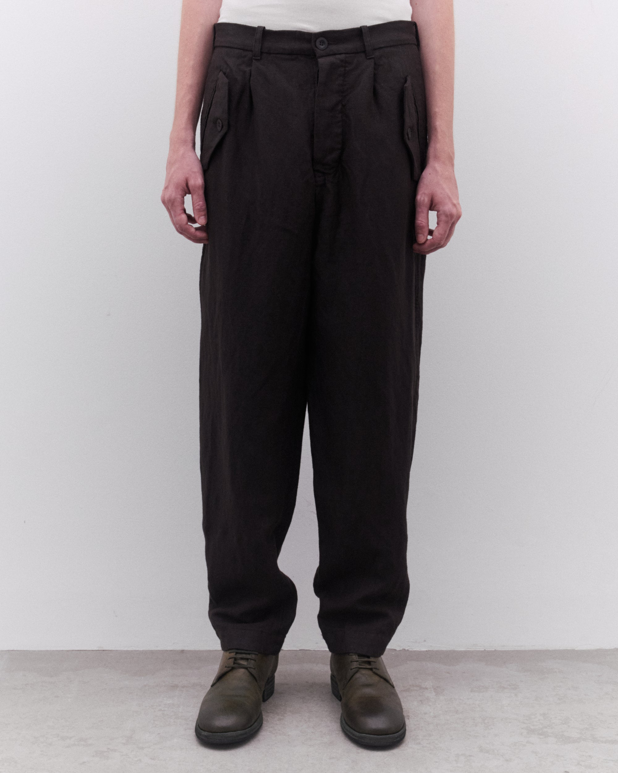 High waistButton and fly closureButton down flap pocketTapered legBelt loopsRear welt pocket