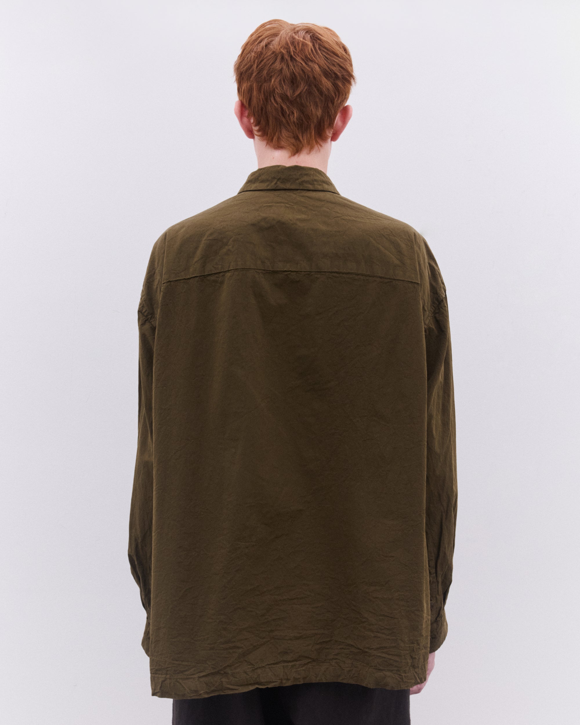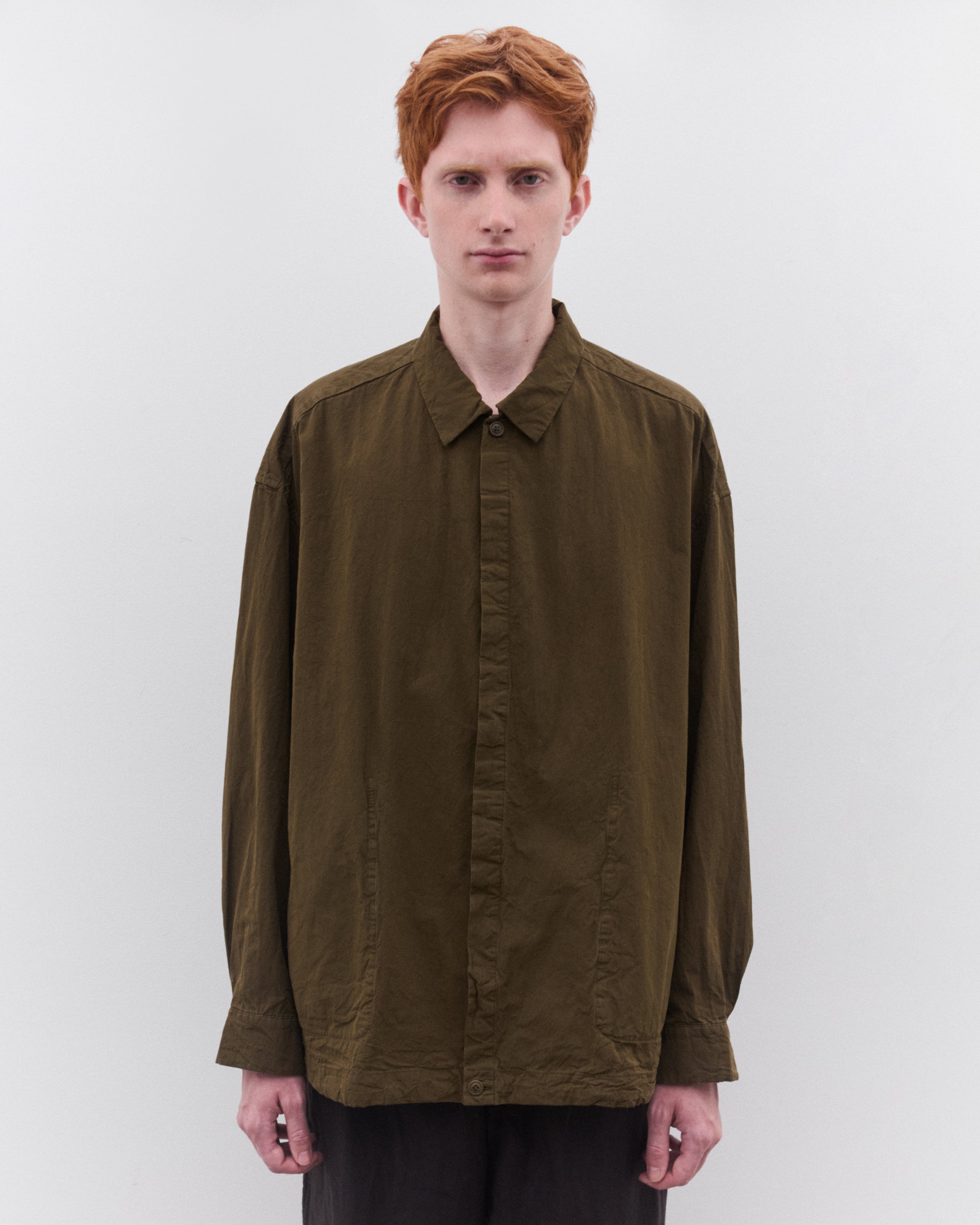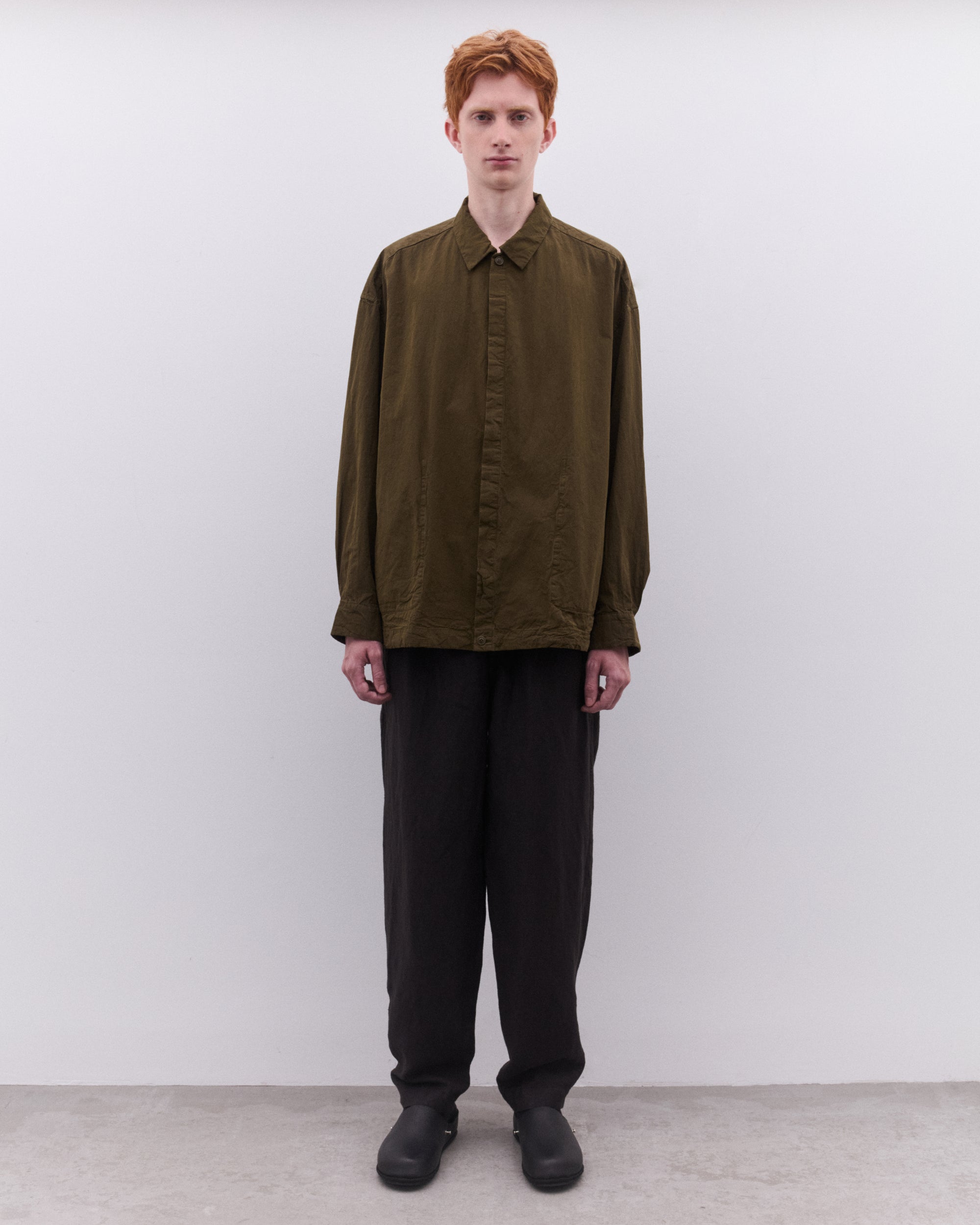 Classic shirt collarConcealed button closureTwo internal patch pocketsStraight hemRear box pleatBoxy fit