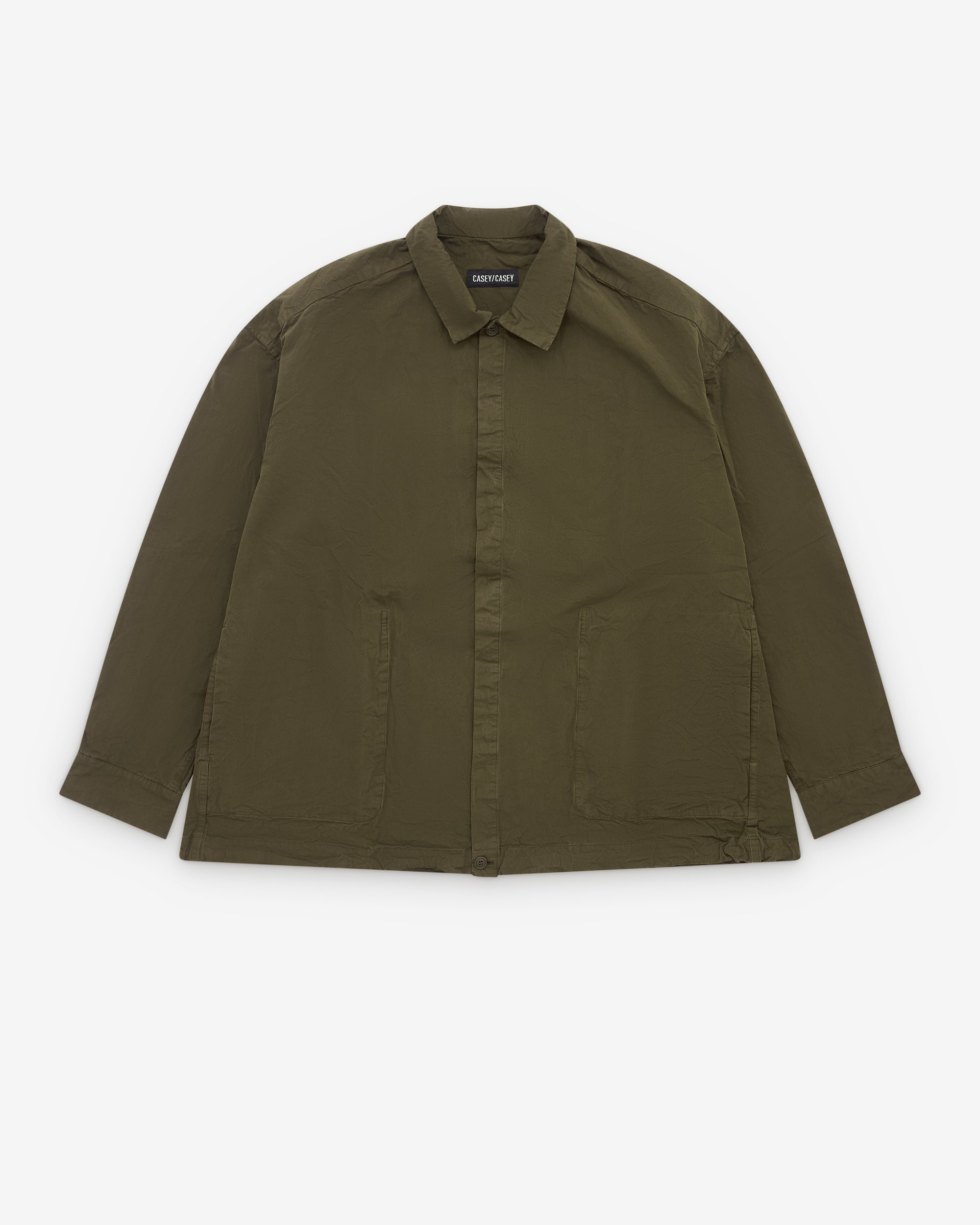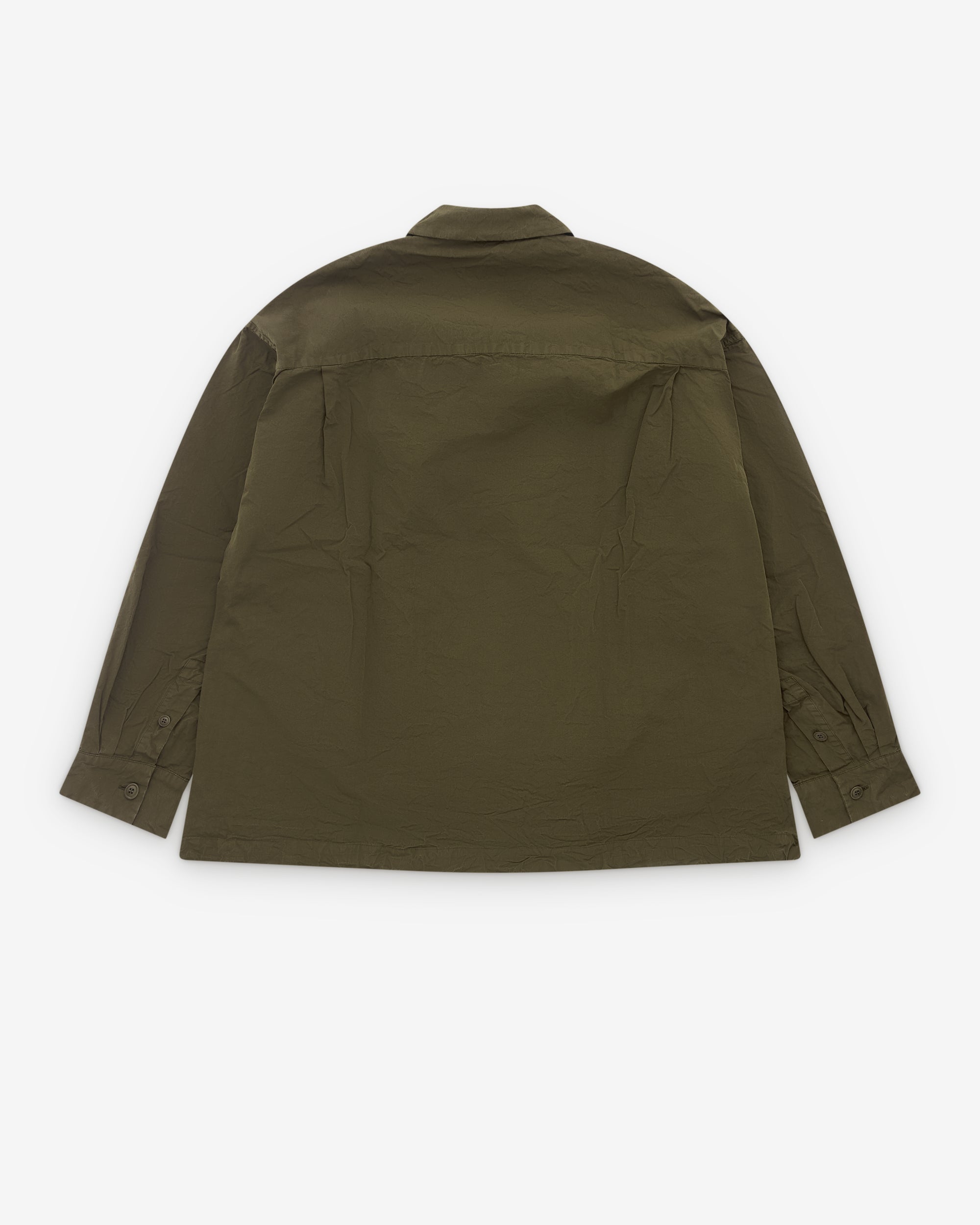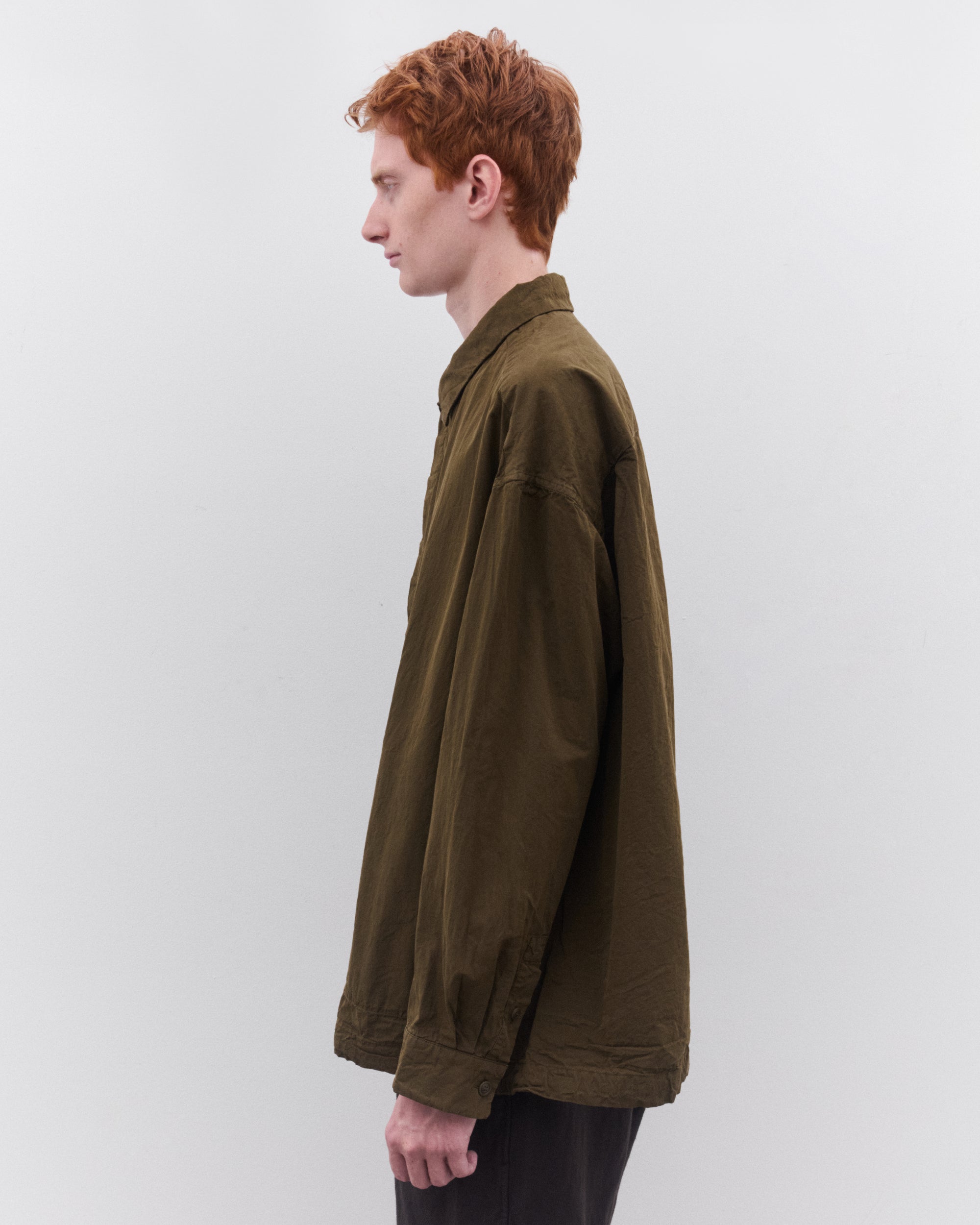 Classic shirt collarConcealed button closureTwo internal patch pocketsStraight hemRear box pleatBoxy fit