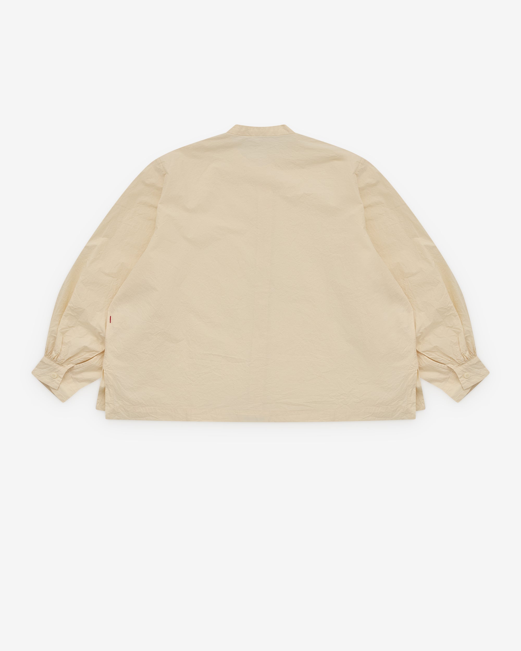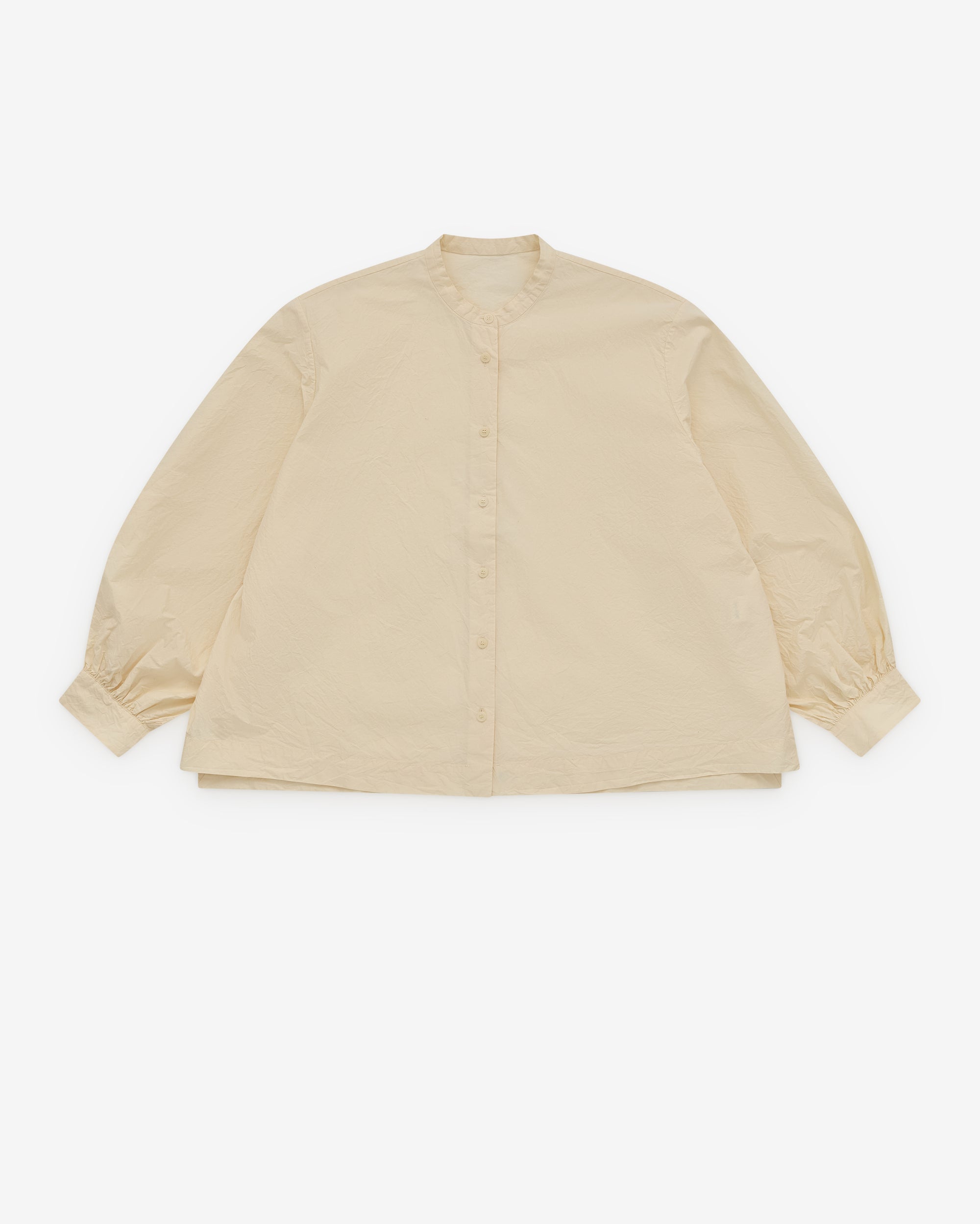 Round neck collarSplit at side seamBoxy, relaxed fitGathered, button cuffs