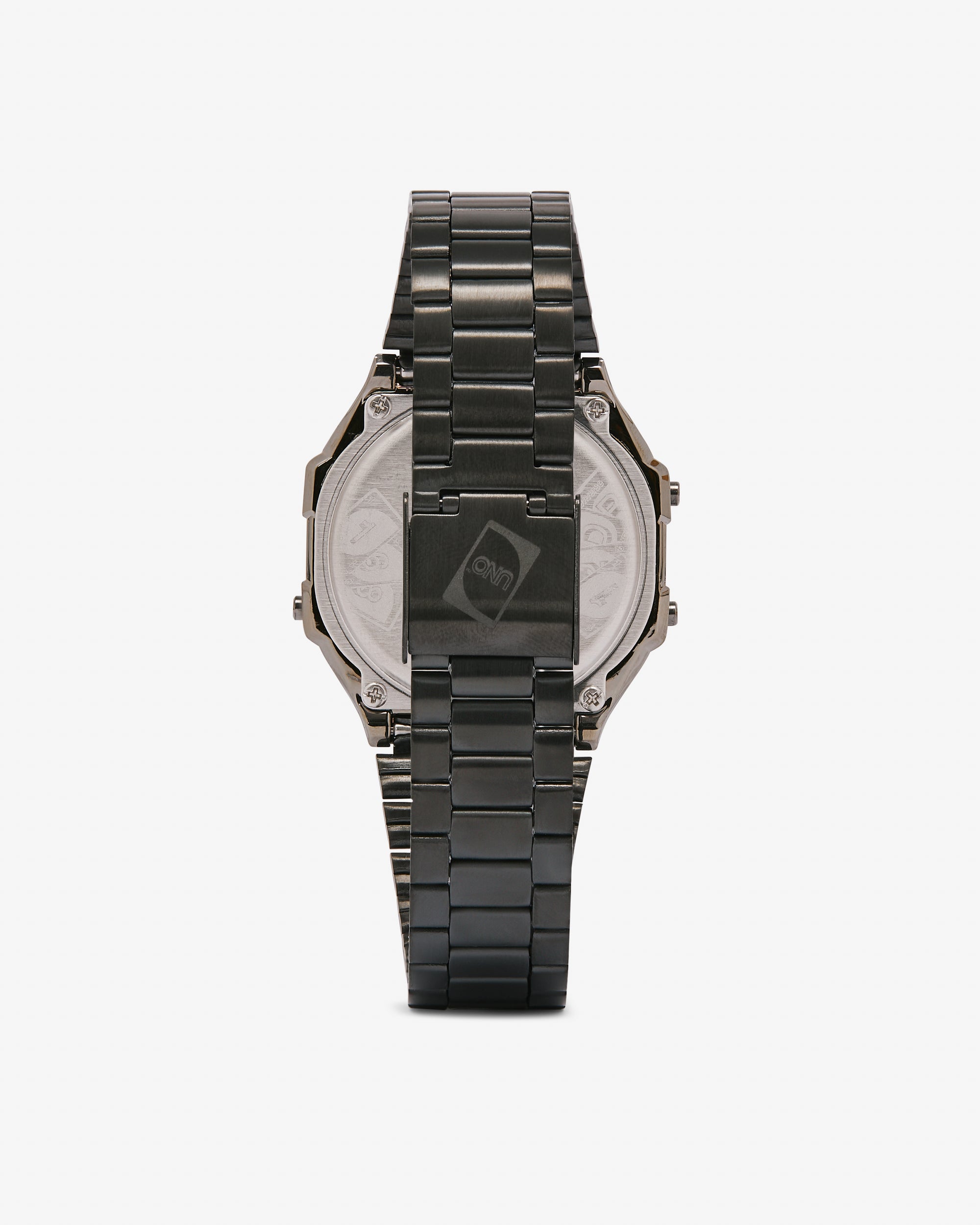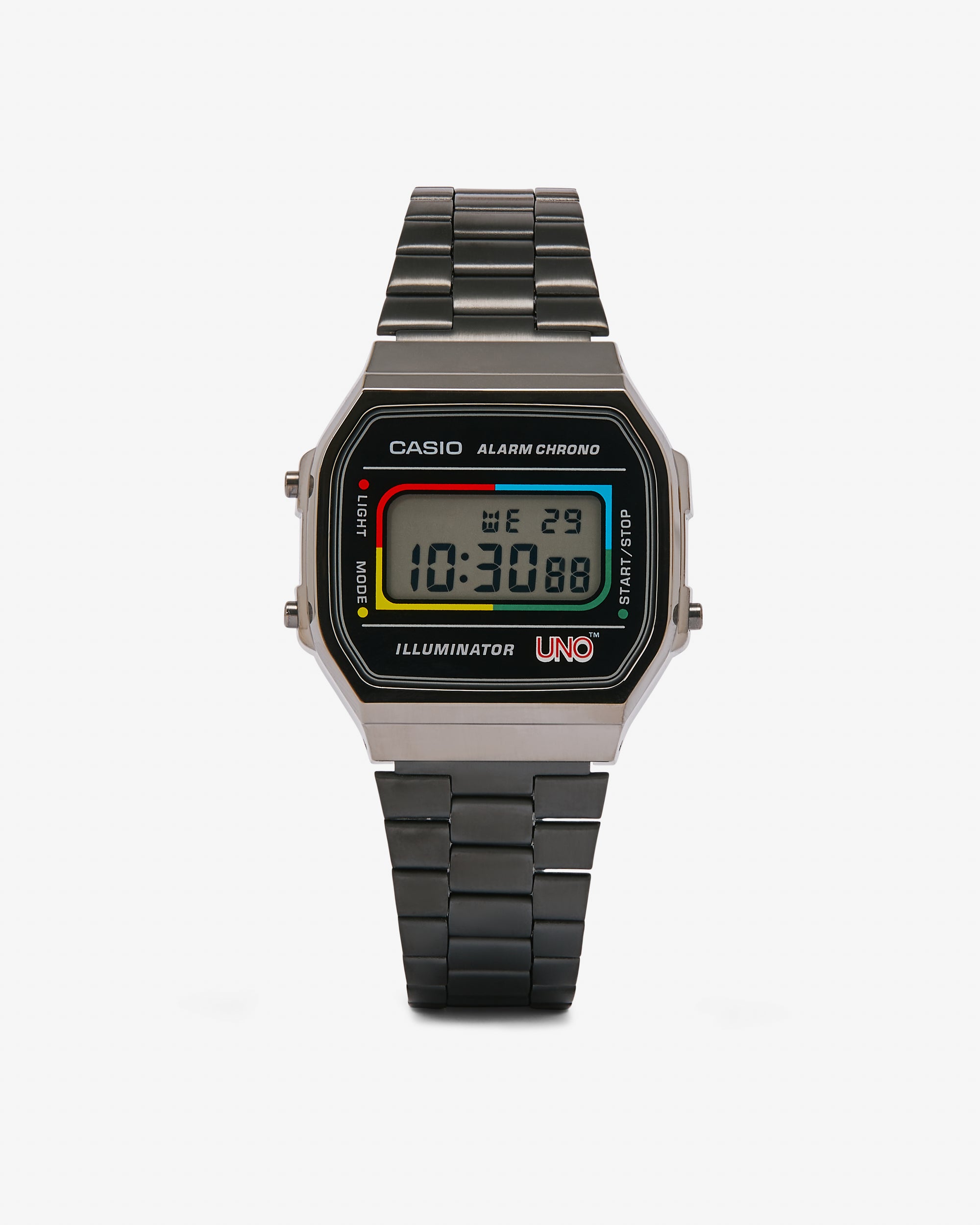 Presenting a collaboration between Casio watches and UNO™, the card game from Mattel, a pairing of two brands born in the 1970s. The collaboration model is based on the popular vintage style of the A168 watch and incorporates retro pop colors and design touches inspired by classic UNO™ cards throughout. These details, including on the watch face, case back, and band, project a casual sense of fun in a special watch that delivers a timeless sparkle that transcends the generations.