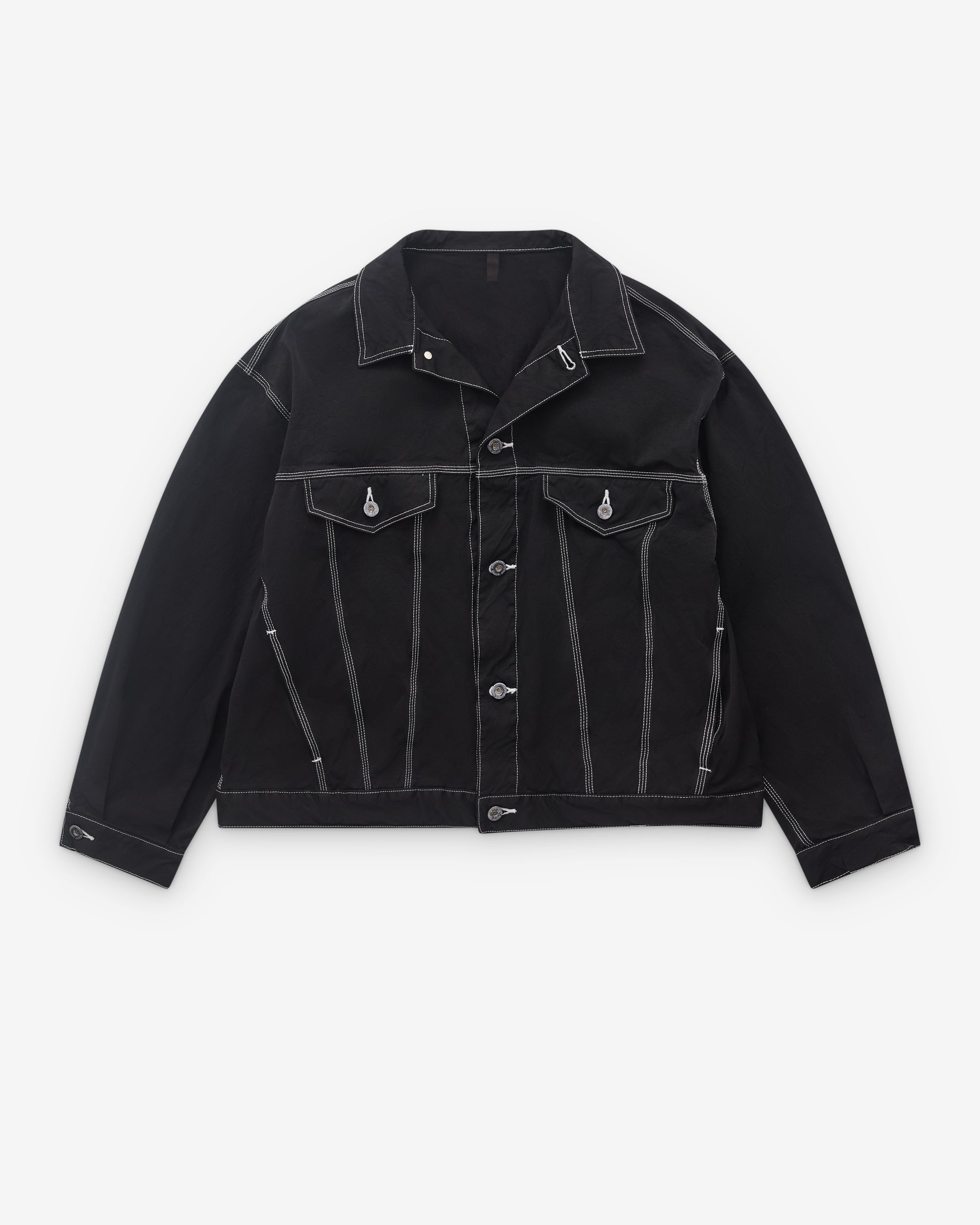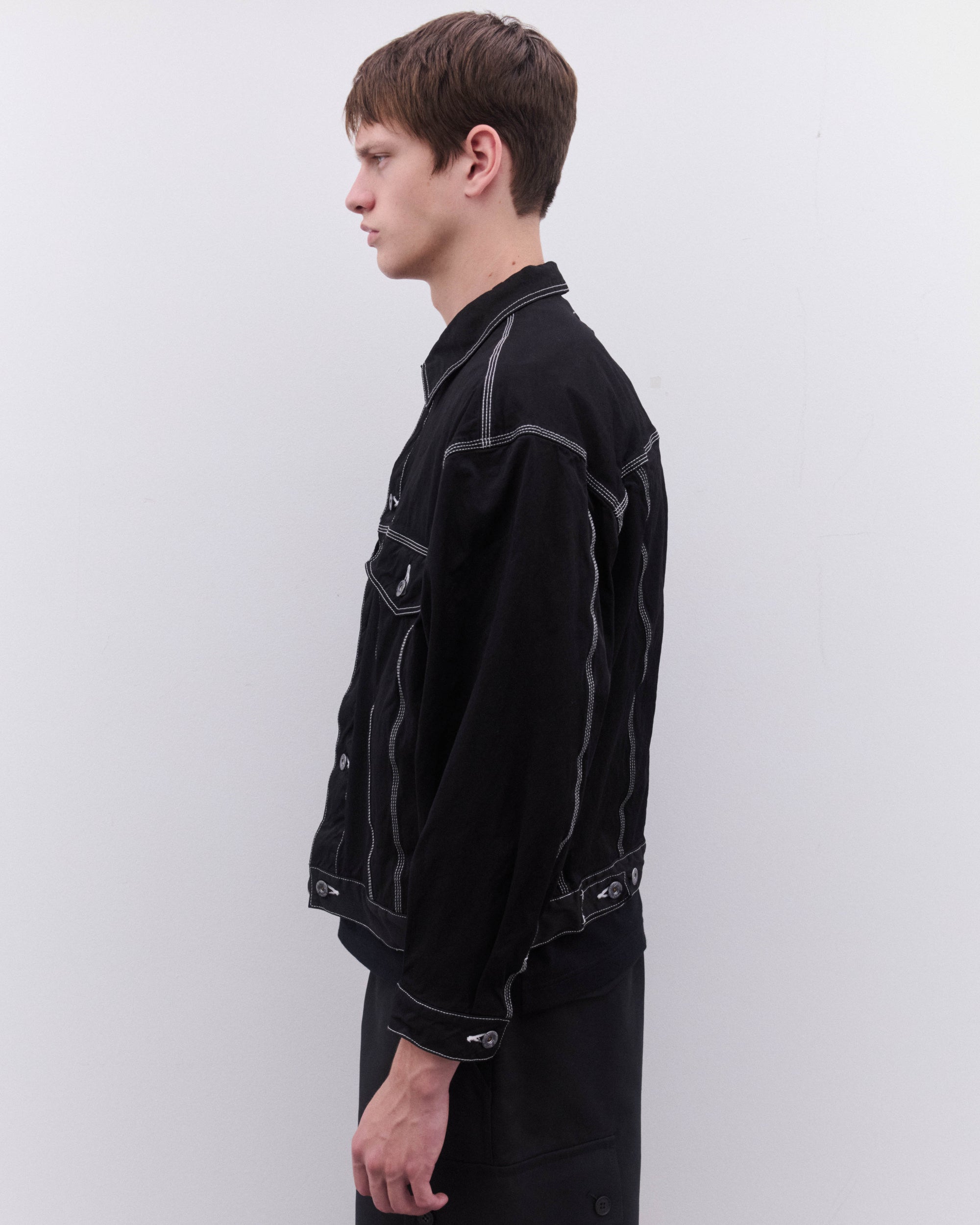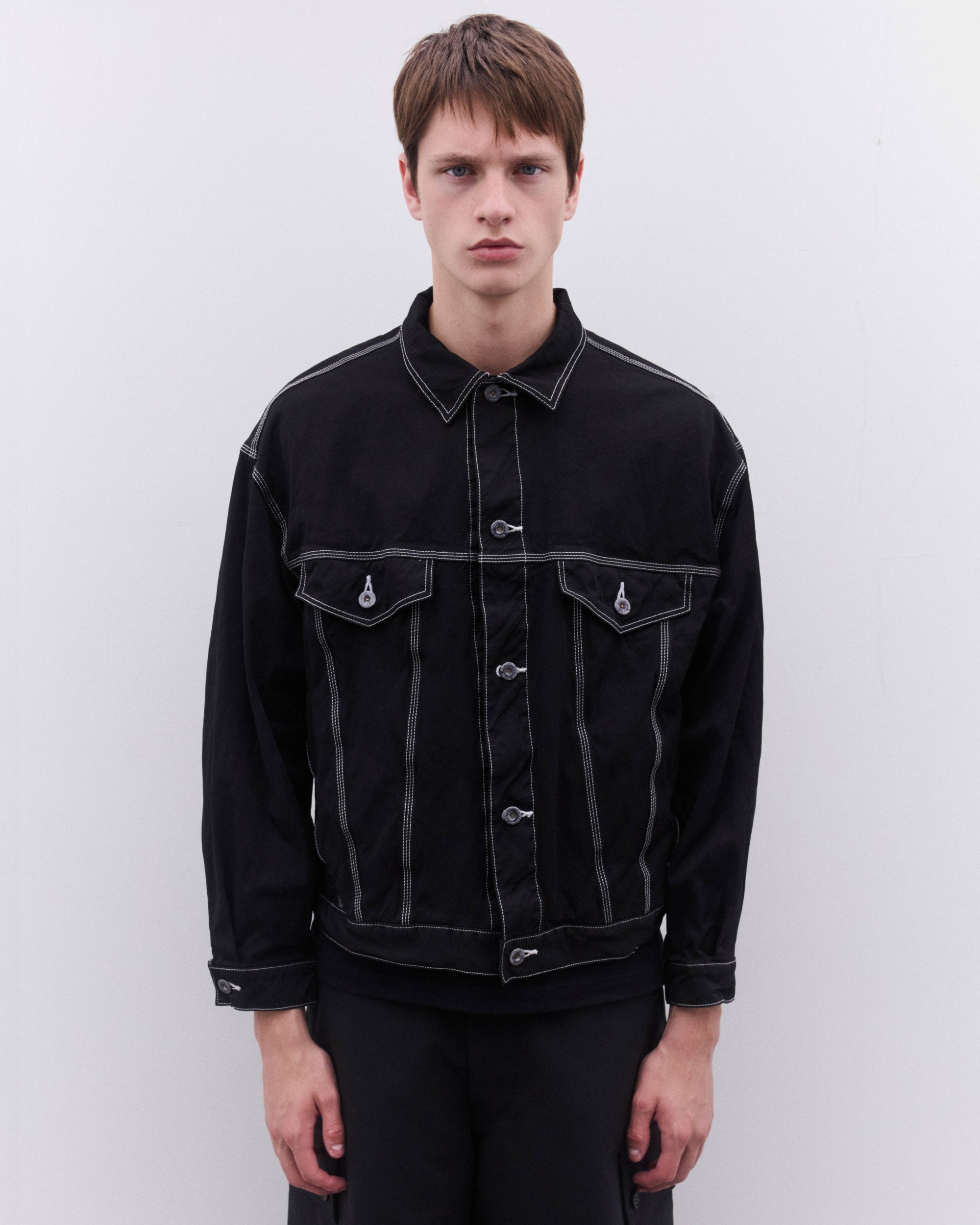 Point collarButton fasteningDrop shouldersFront welt pocketsFront button flap pocketsContrast topstitchingBoxy, relaxed fitCuff and waist button adjusters