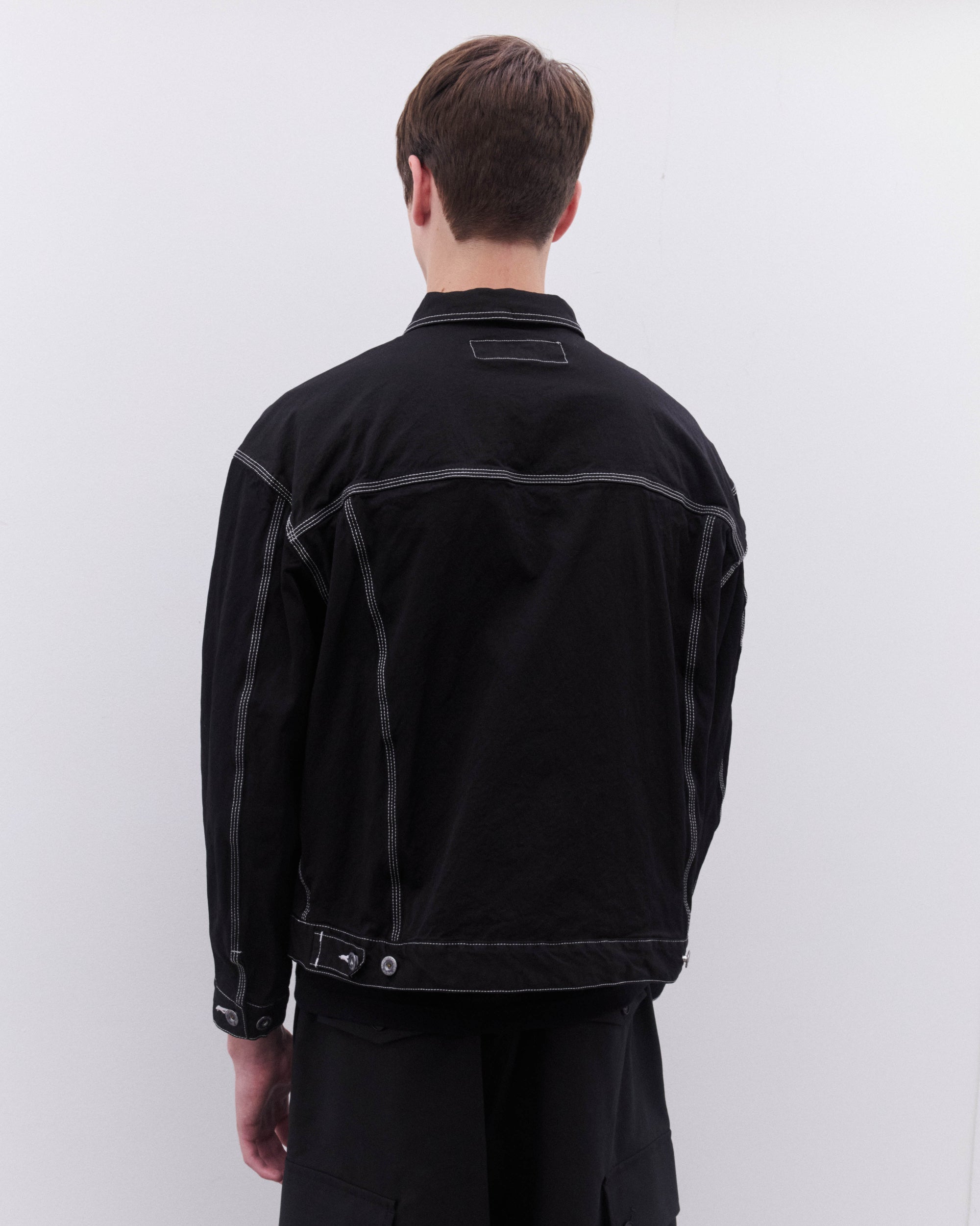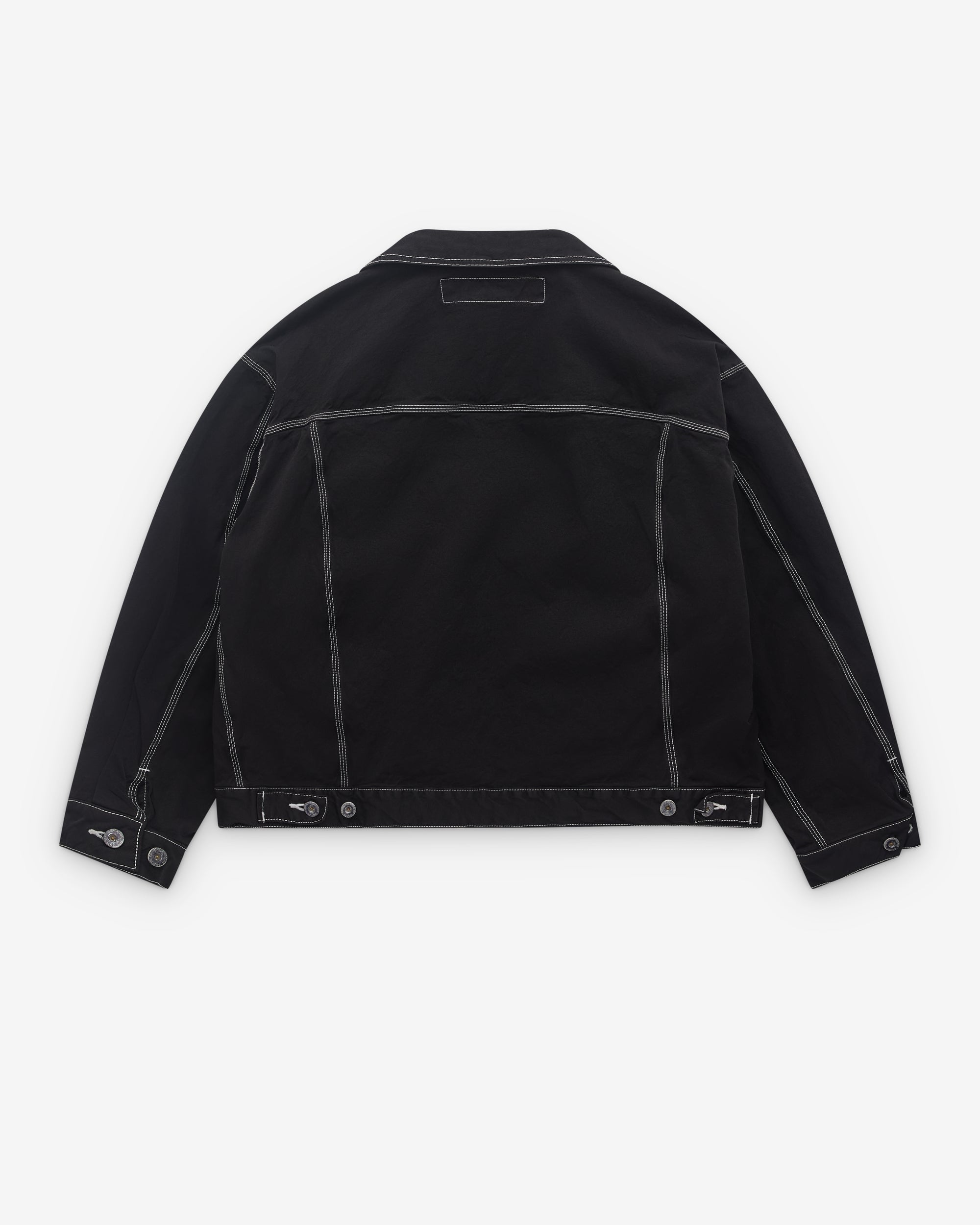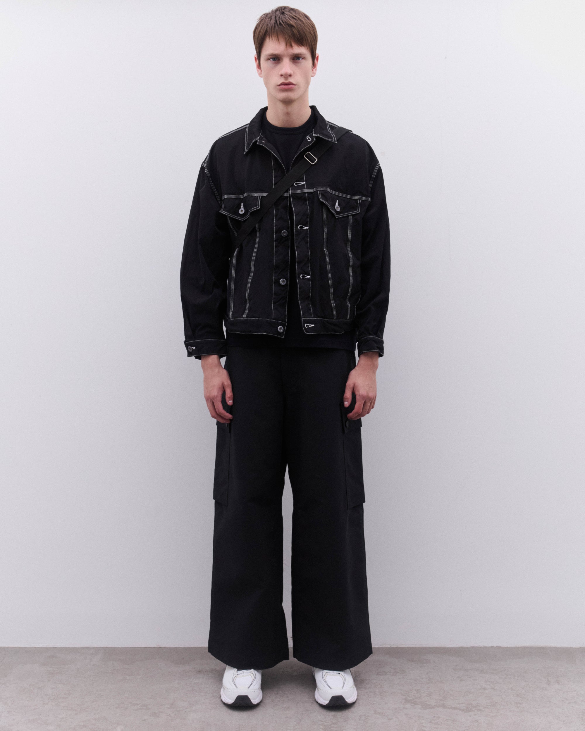 Point collarButton fasteningDrop shouldersFront welt pocketsFront button flap pocketsContrast topstitchingBoxy, relaxed fitCuff and waist button adjusters