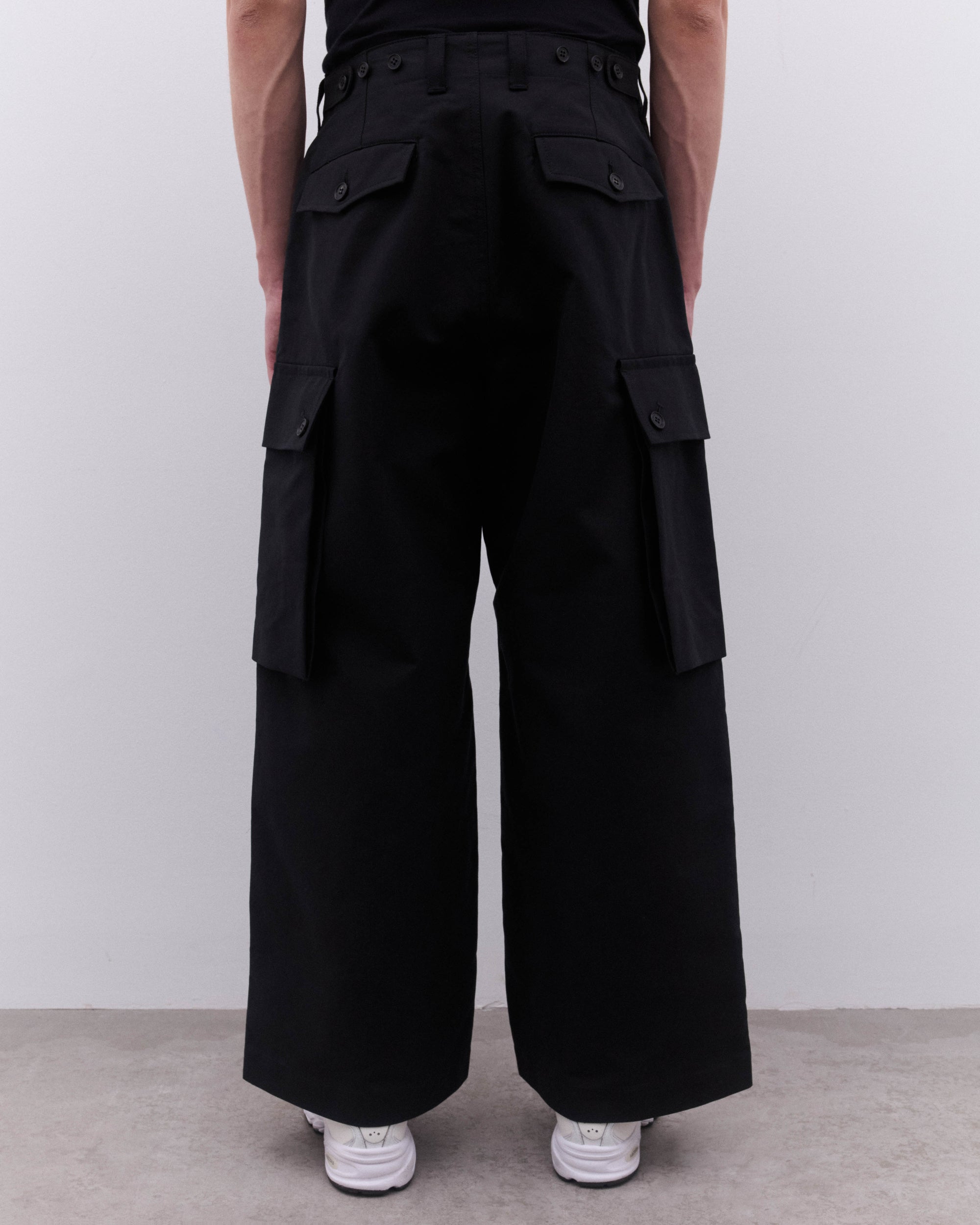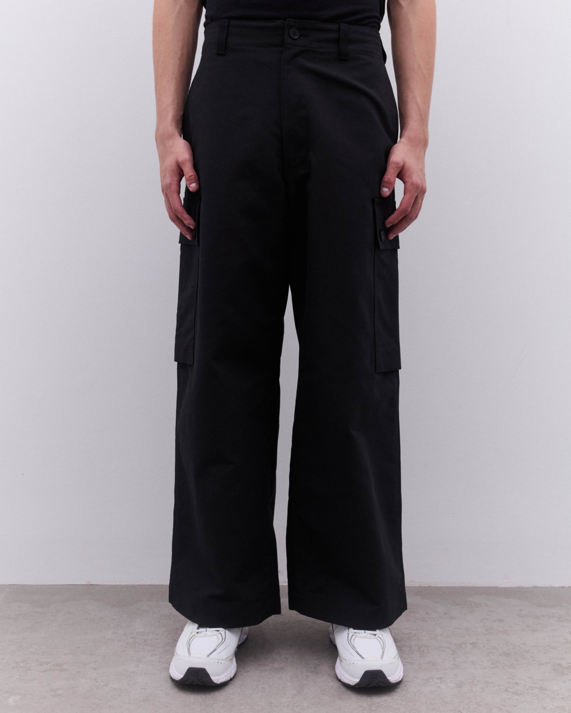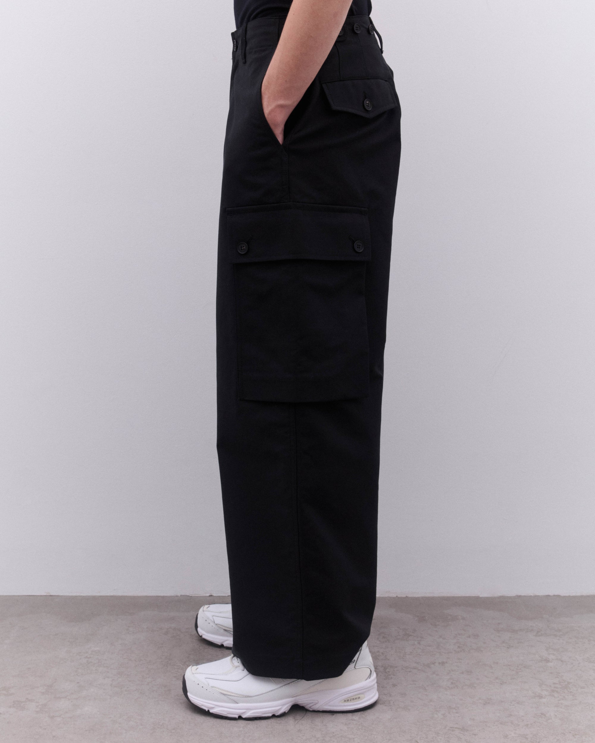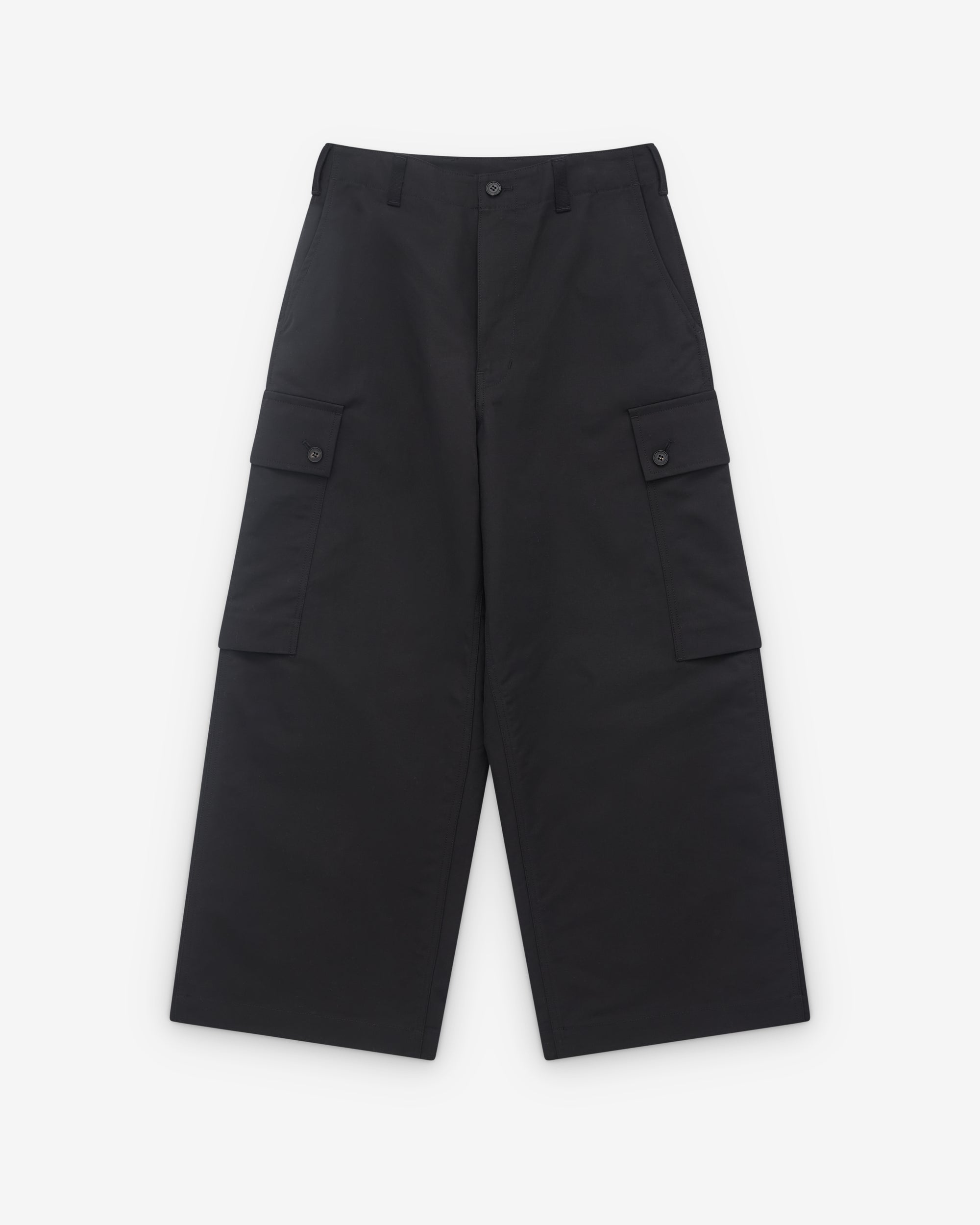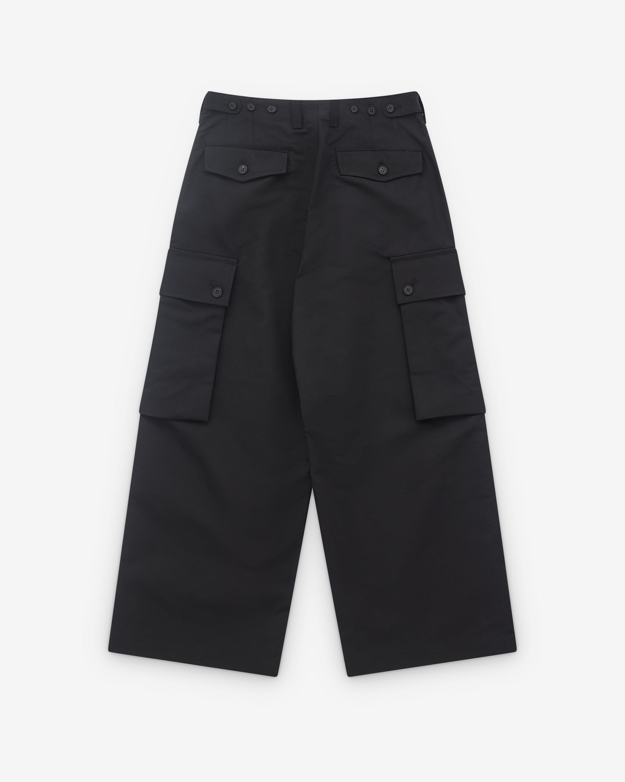 Wide legPress stud cargo pockets at legHigh waistButton and zip flySide seam pocketsRear button flap pocketsButton adjusters at waist