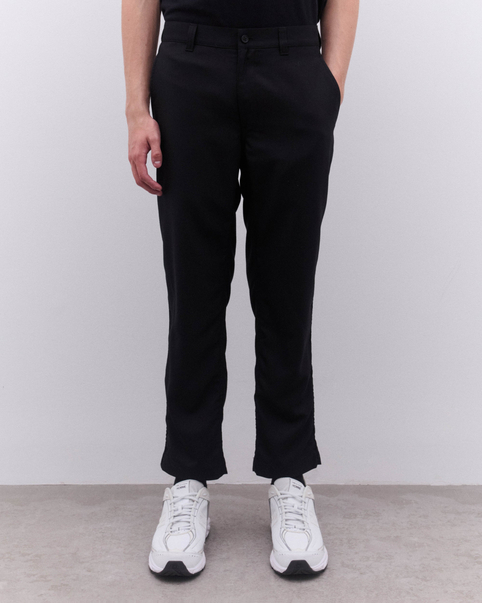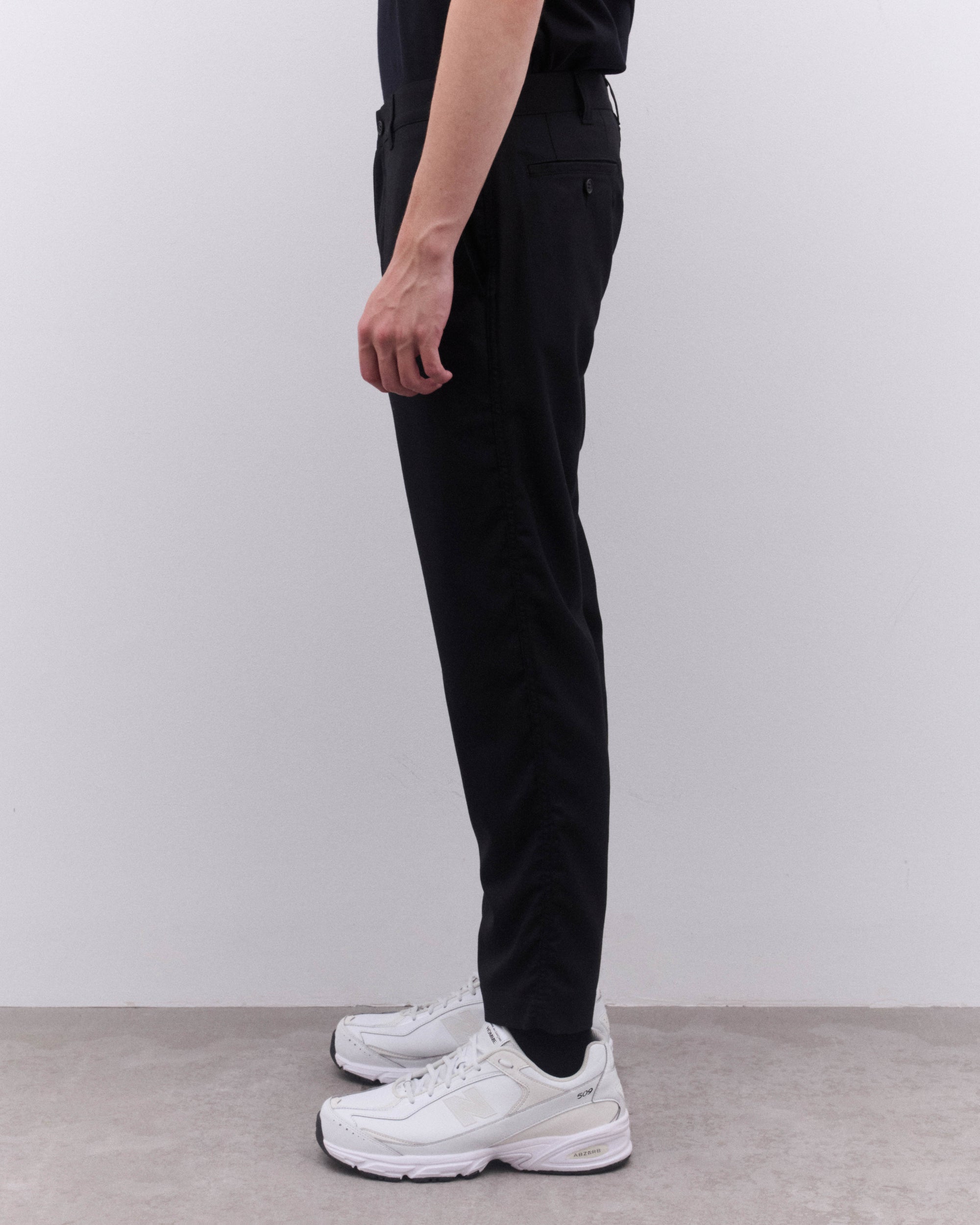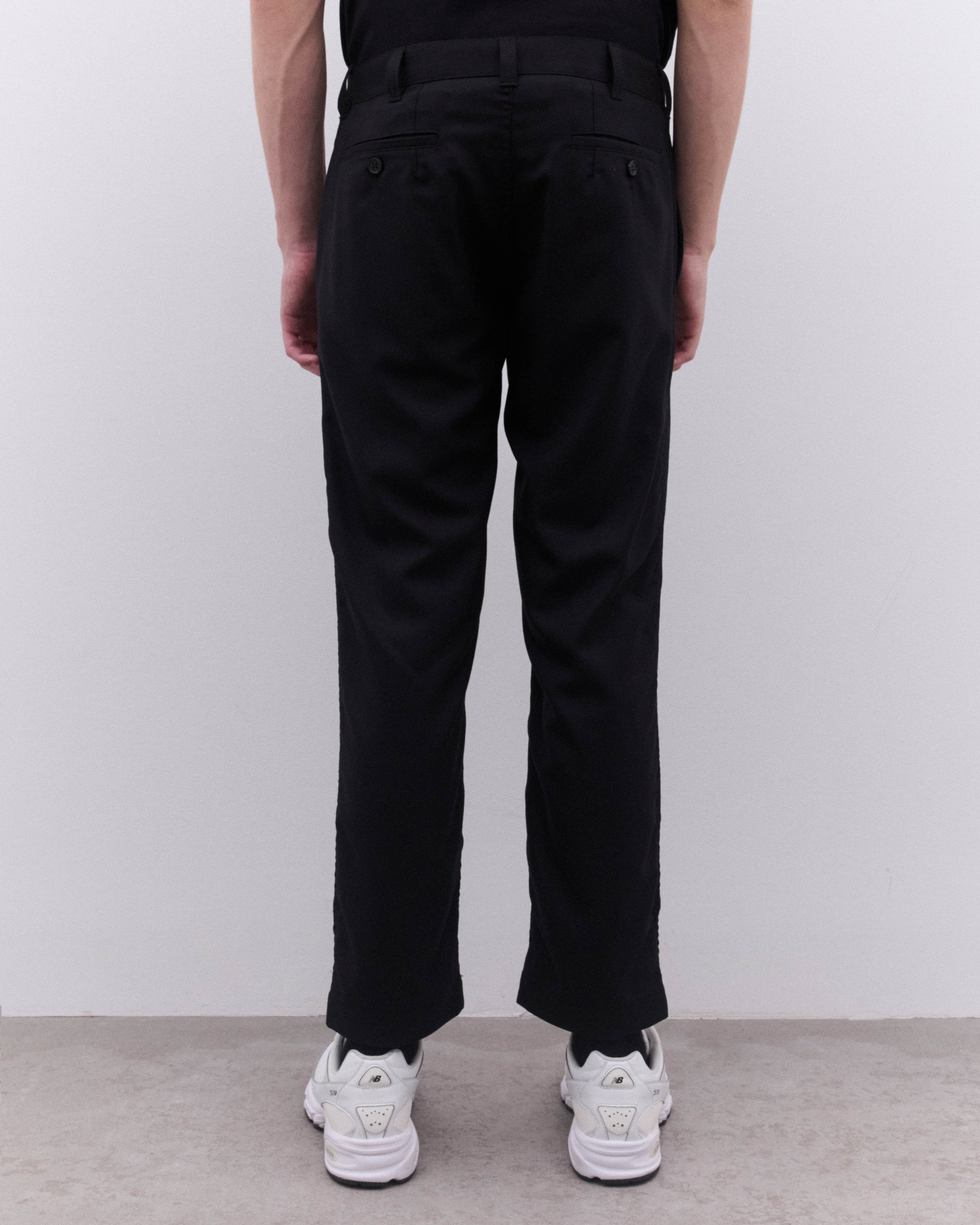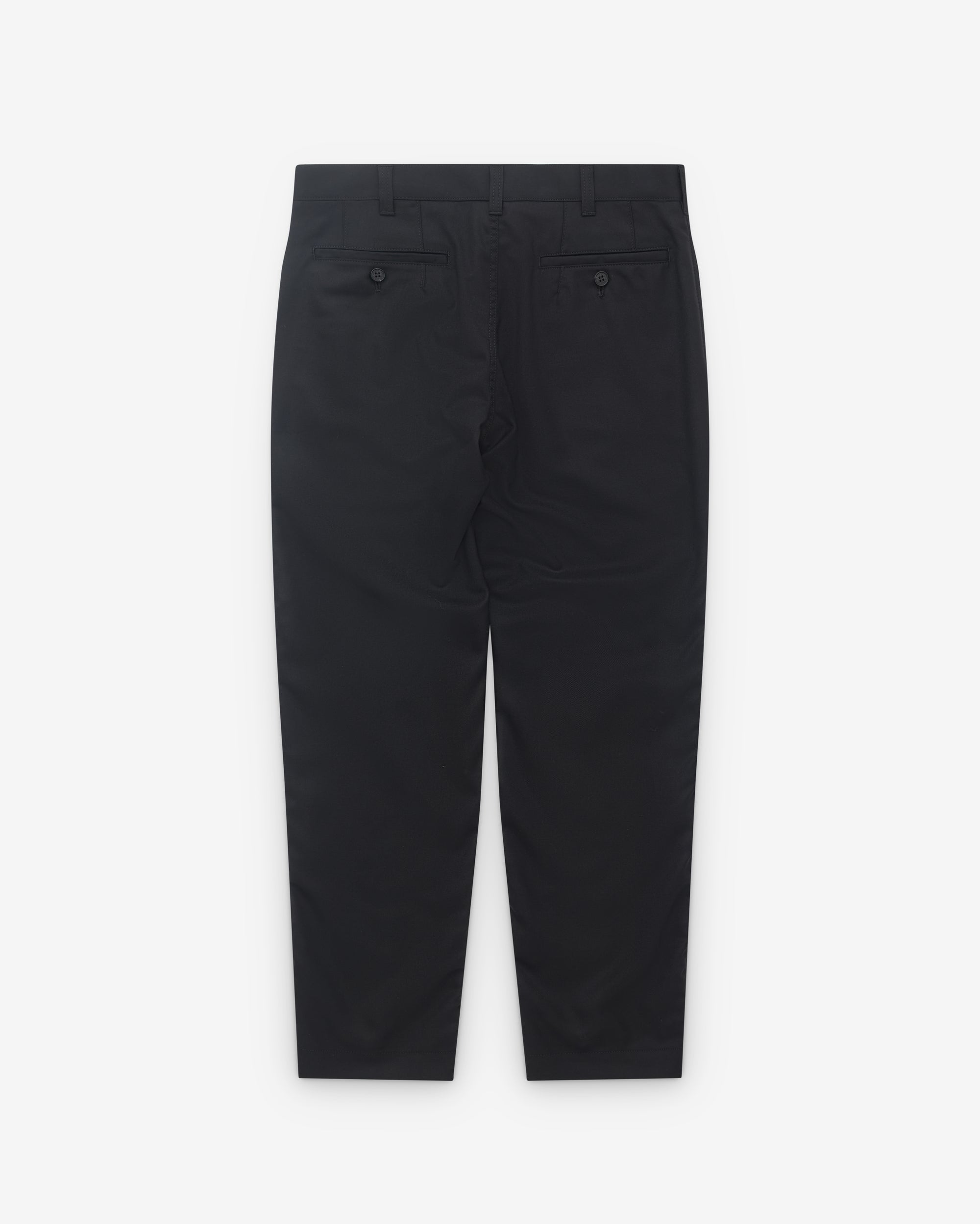 Tapered legFlat frontSide seam pocketsButton and zip fly fasteningBelt loopsRear button welt pockets