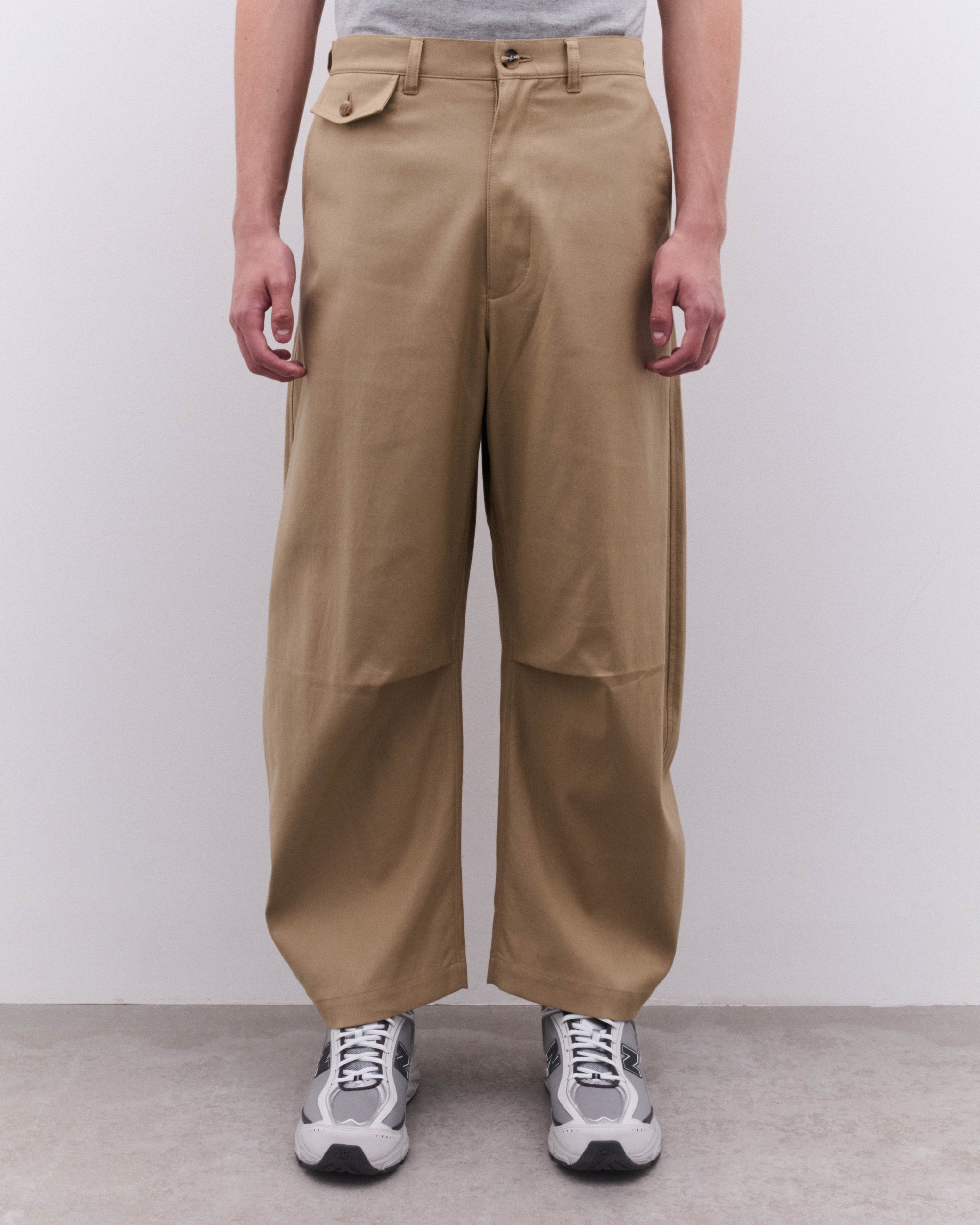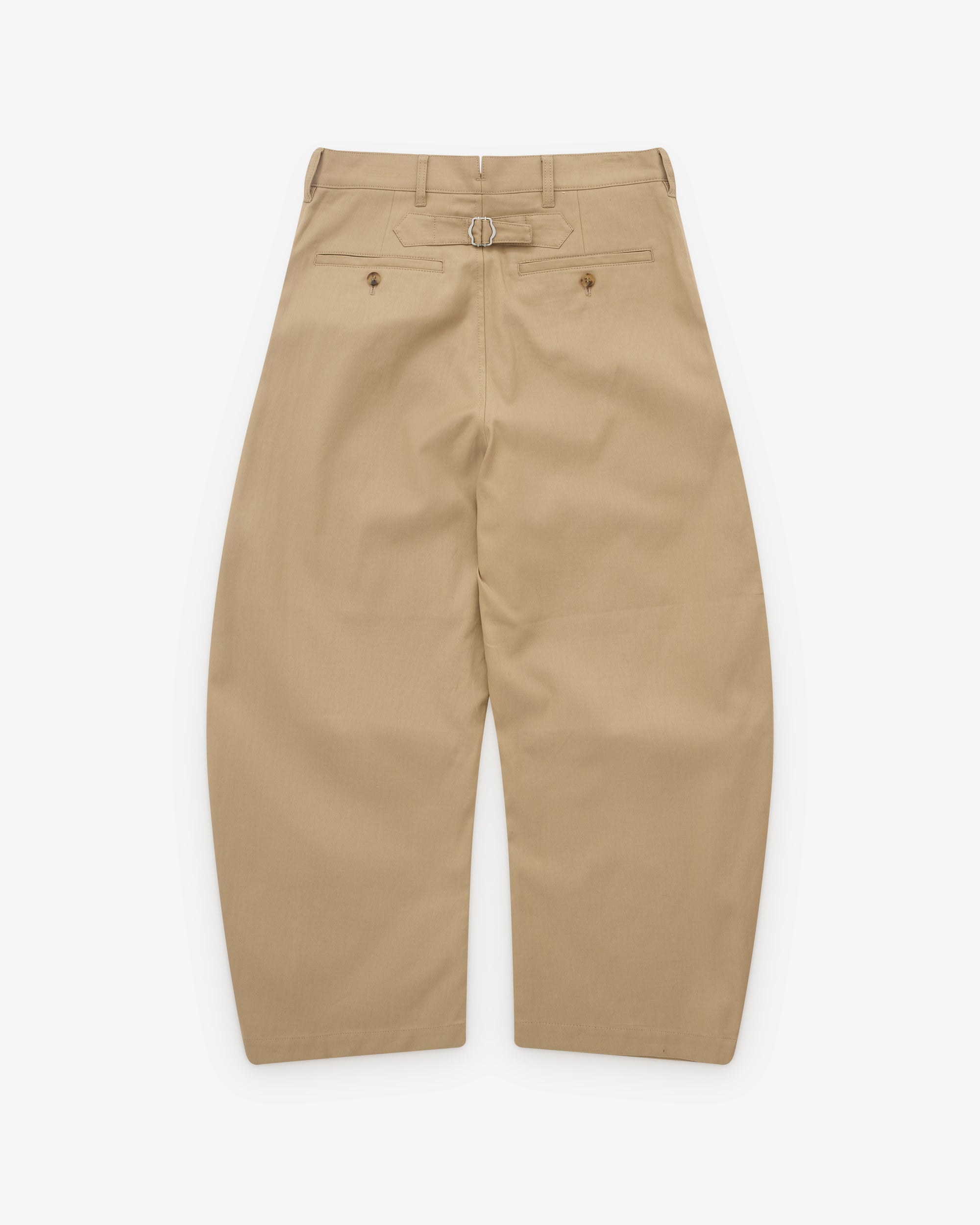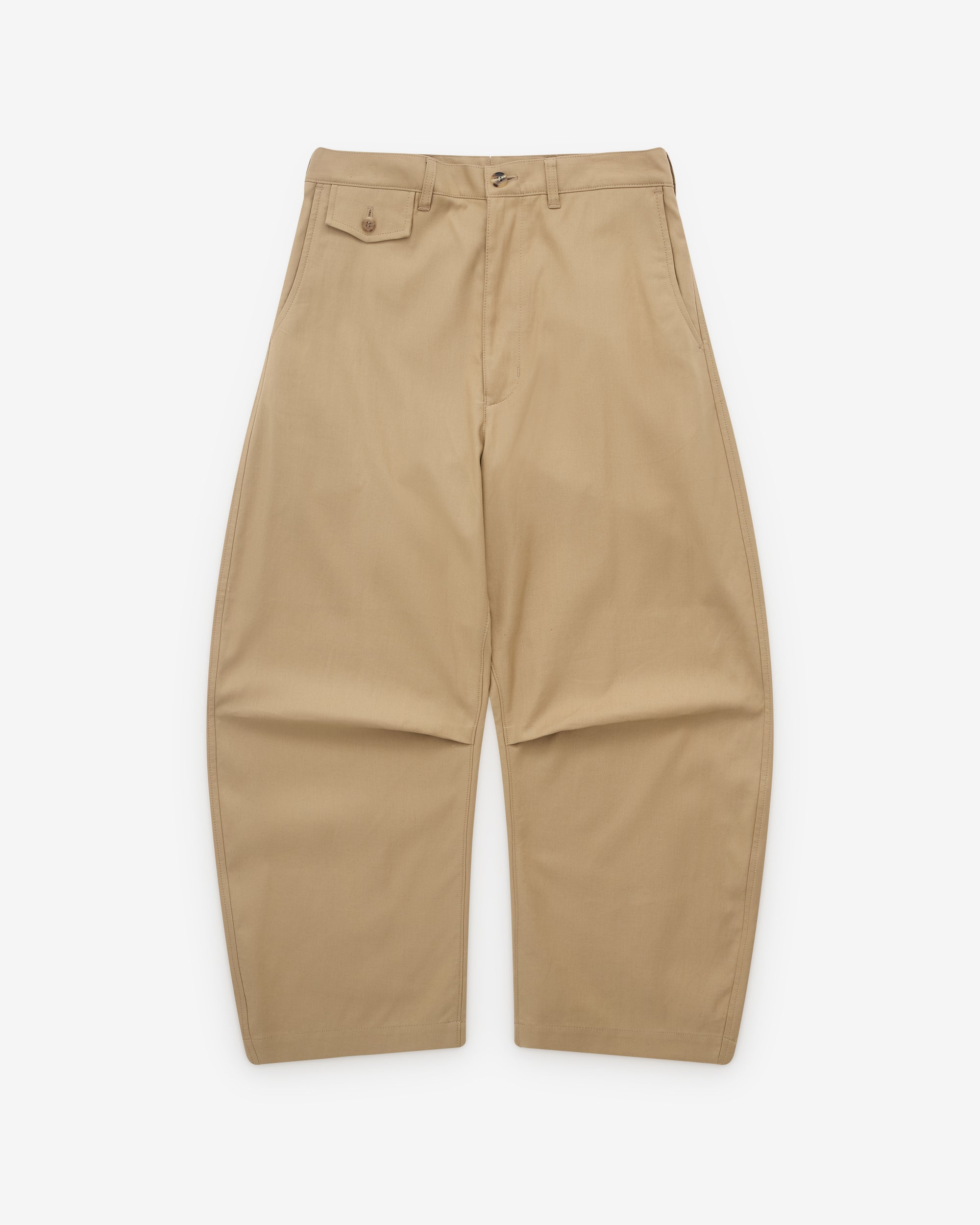 Curved hemDarted knee detailButton ticket pocketSide seam pocketsBelt loopsRear tab adjusterRear button welt pockets