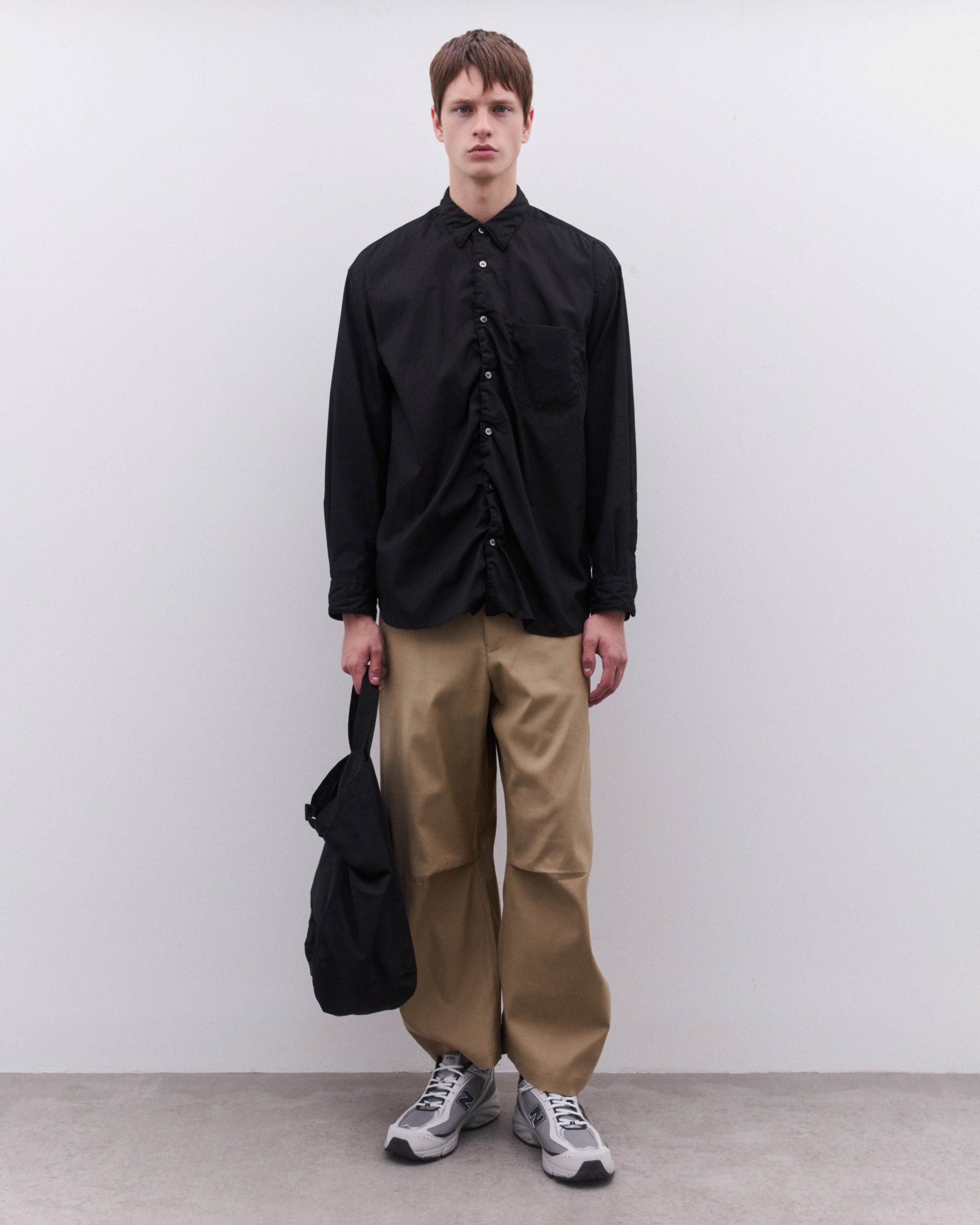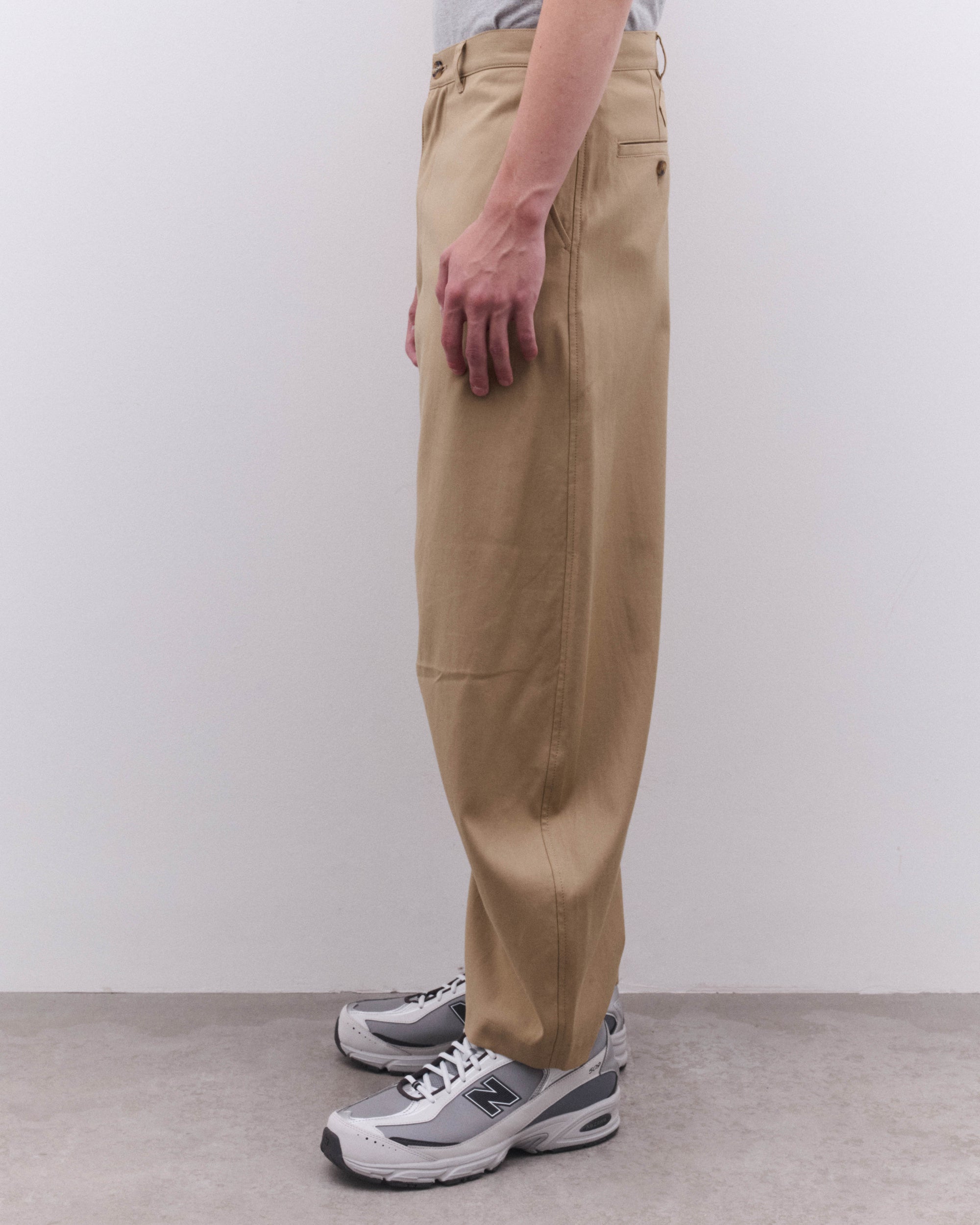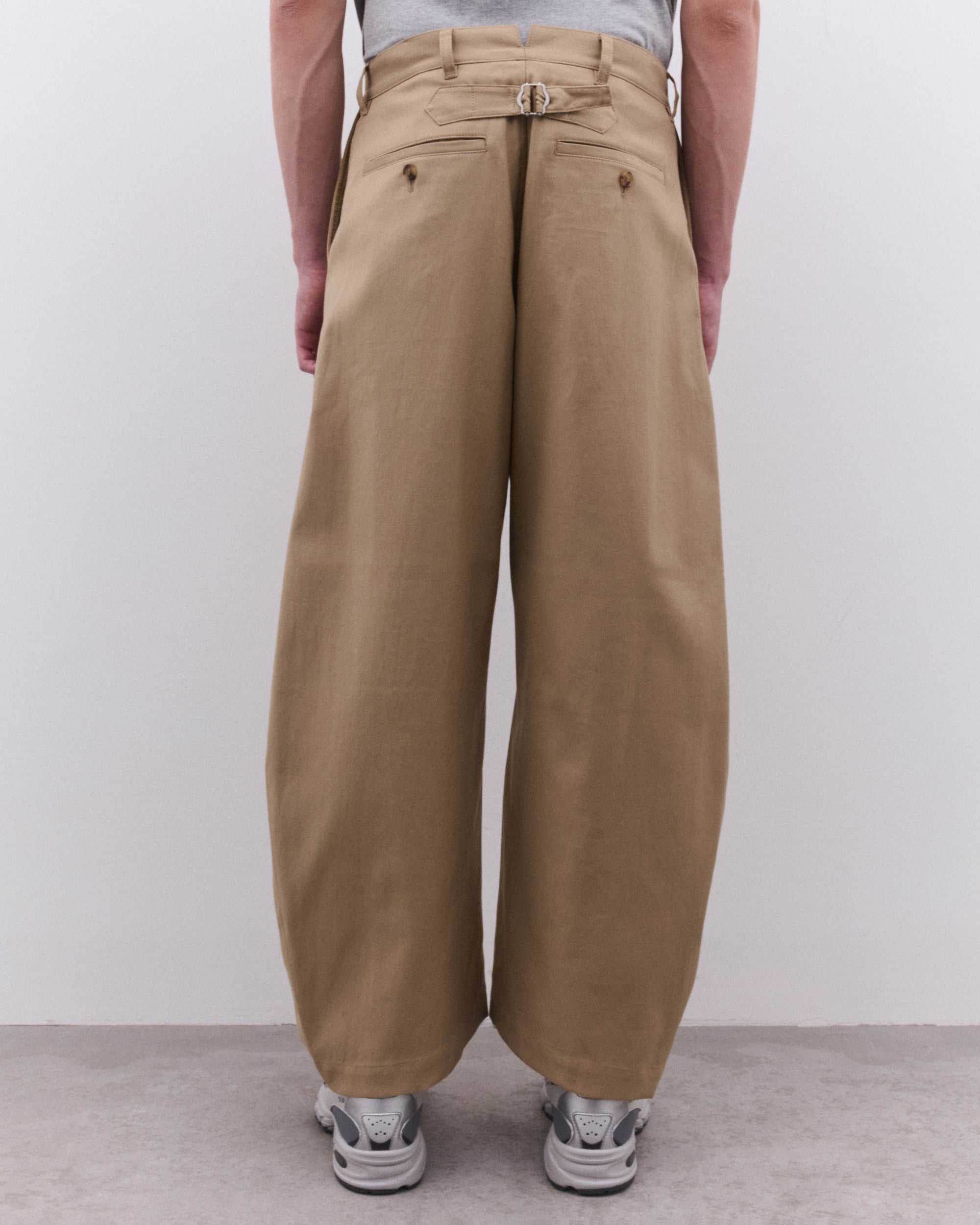 Curved hemDarted knee detailButton ticket pocketSide seam pocketsBelt loopsRear tab adjusterRear button welt pockets