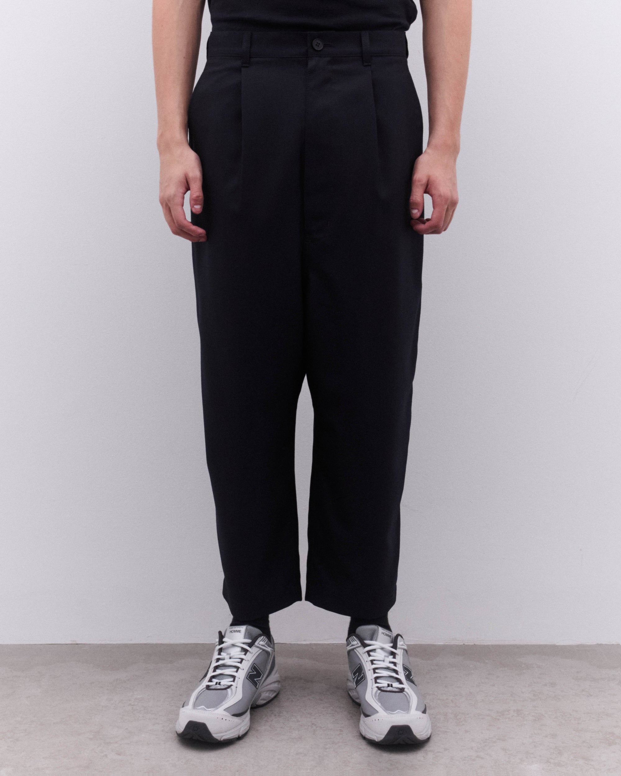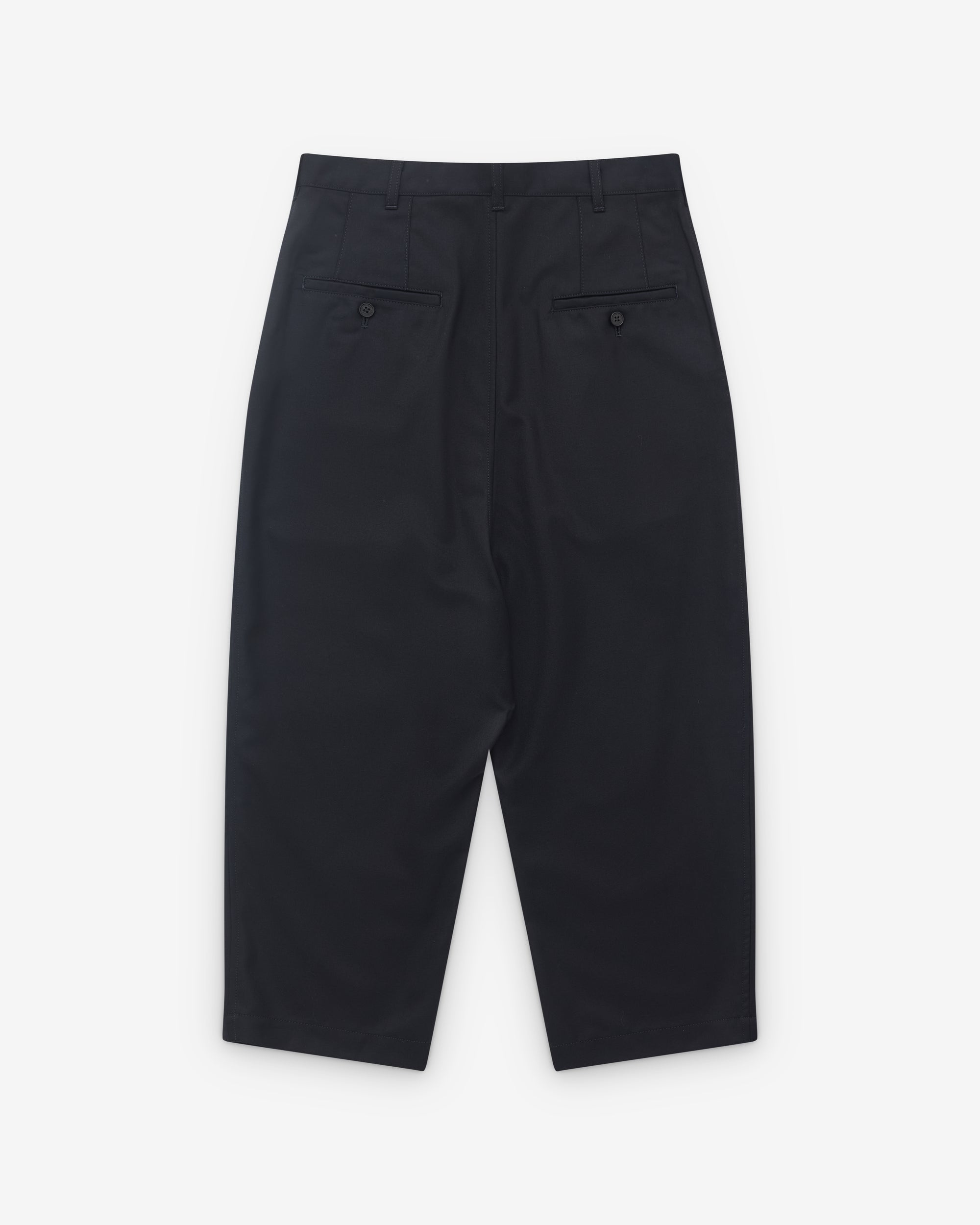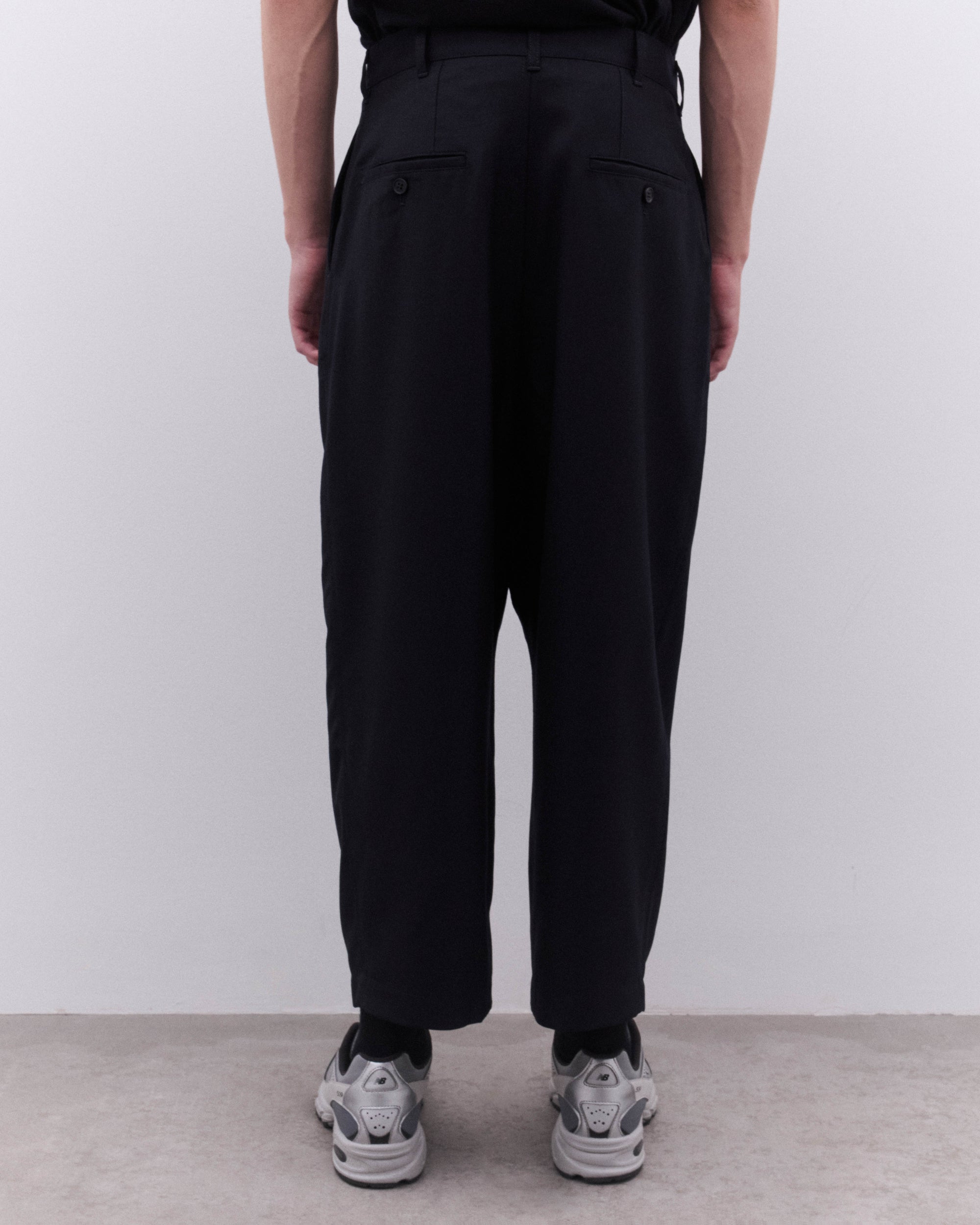 Wide, tapered legPleated frontButton and zip flySide pocketsRear button welt pocketsBelt loops100% WoolMade in Japan
