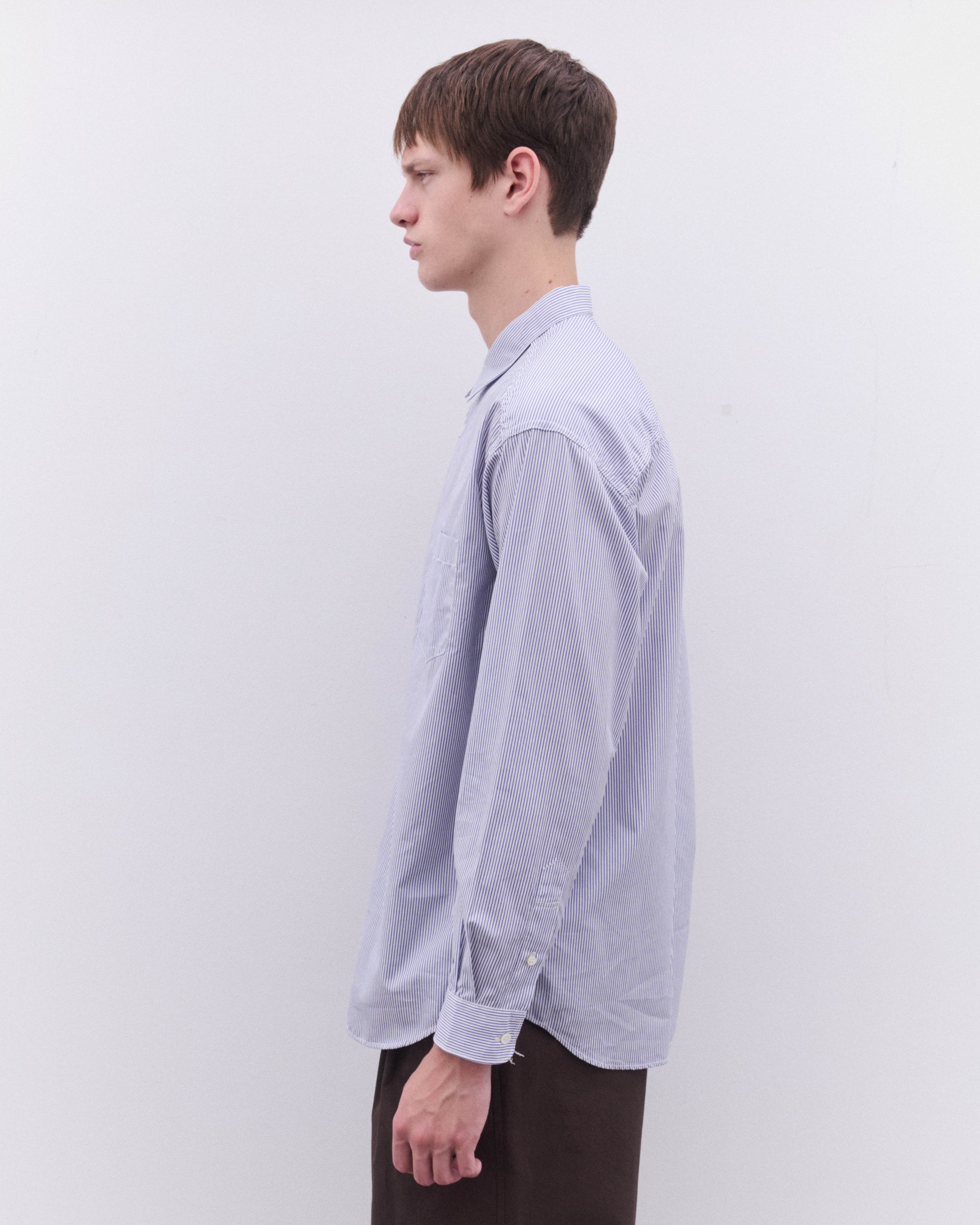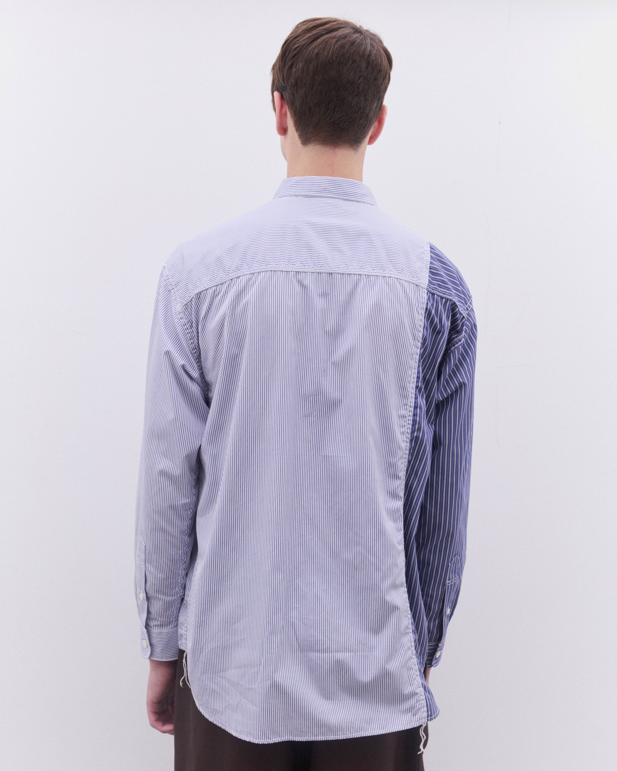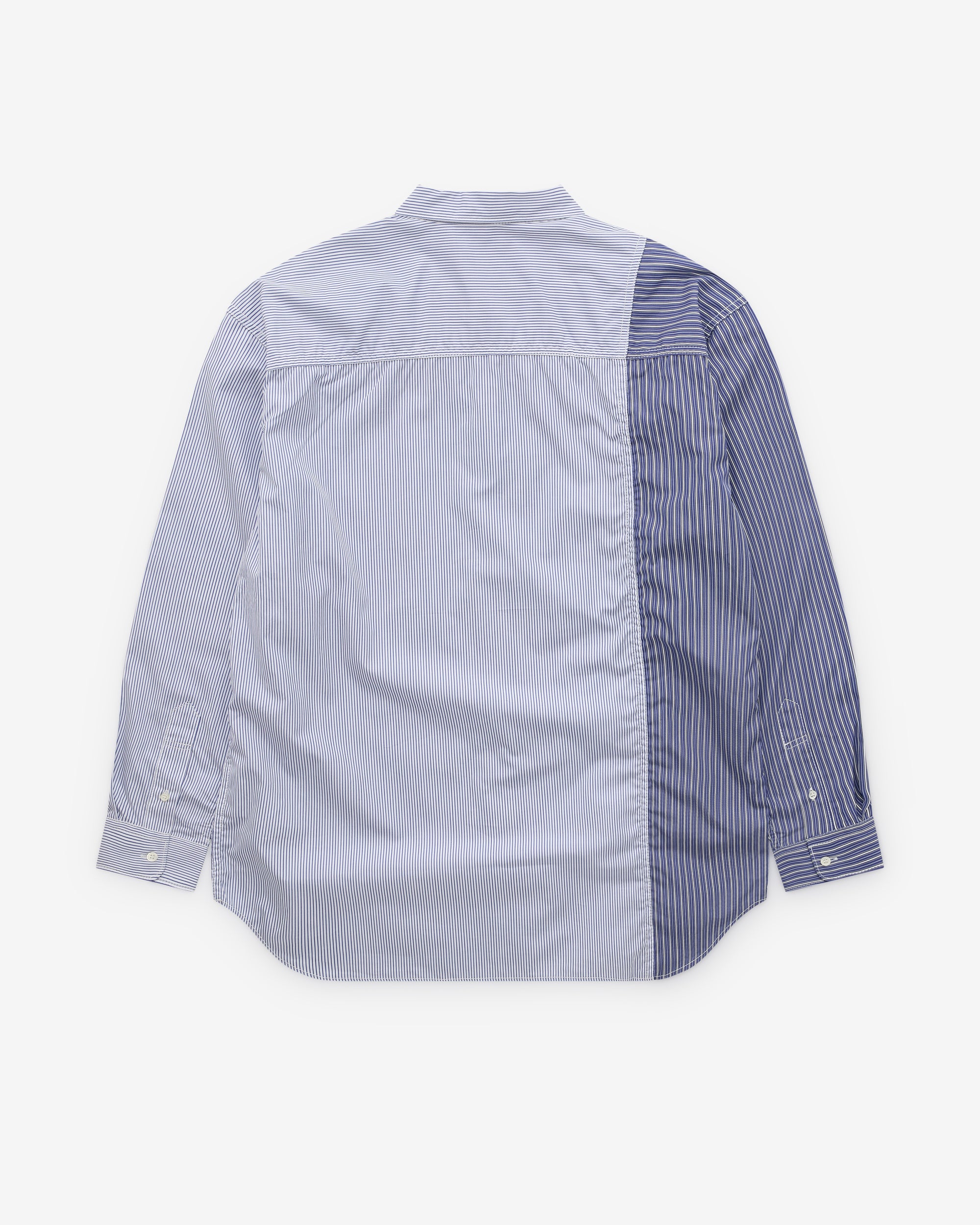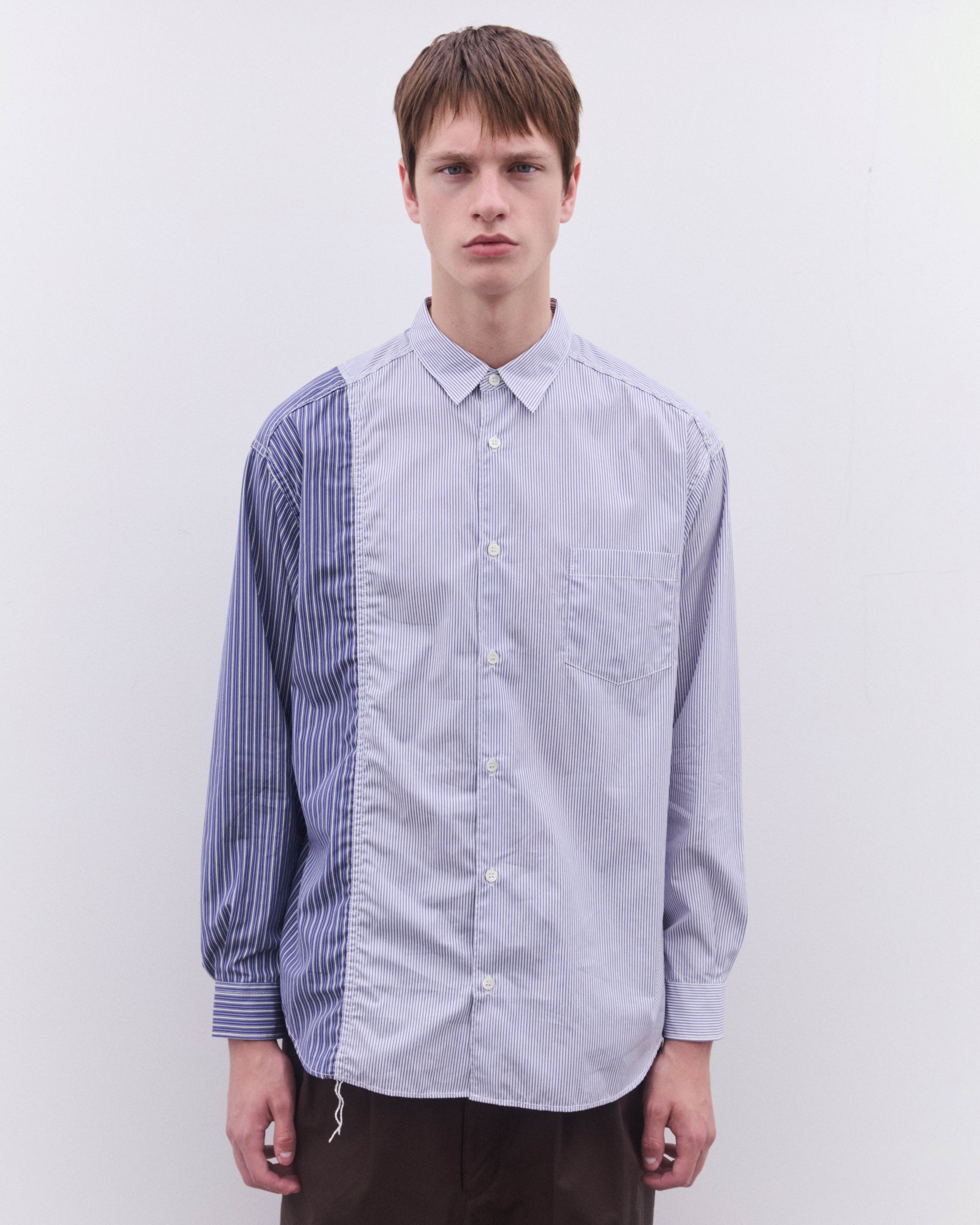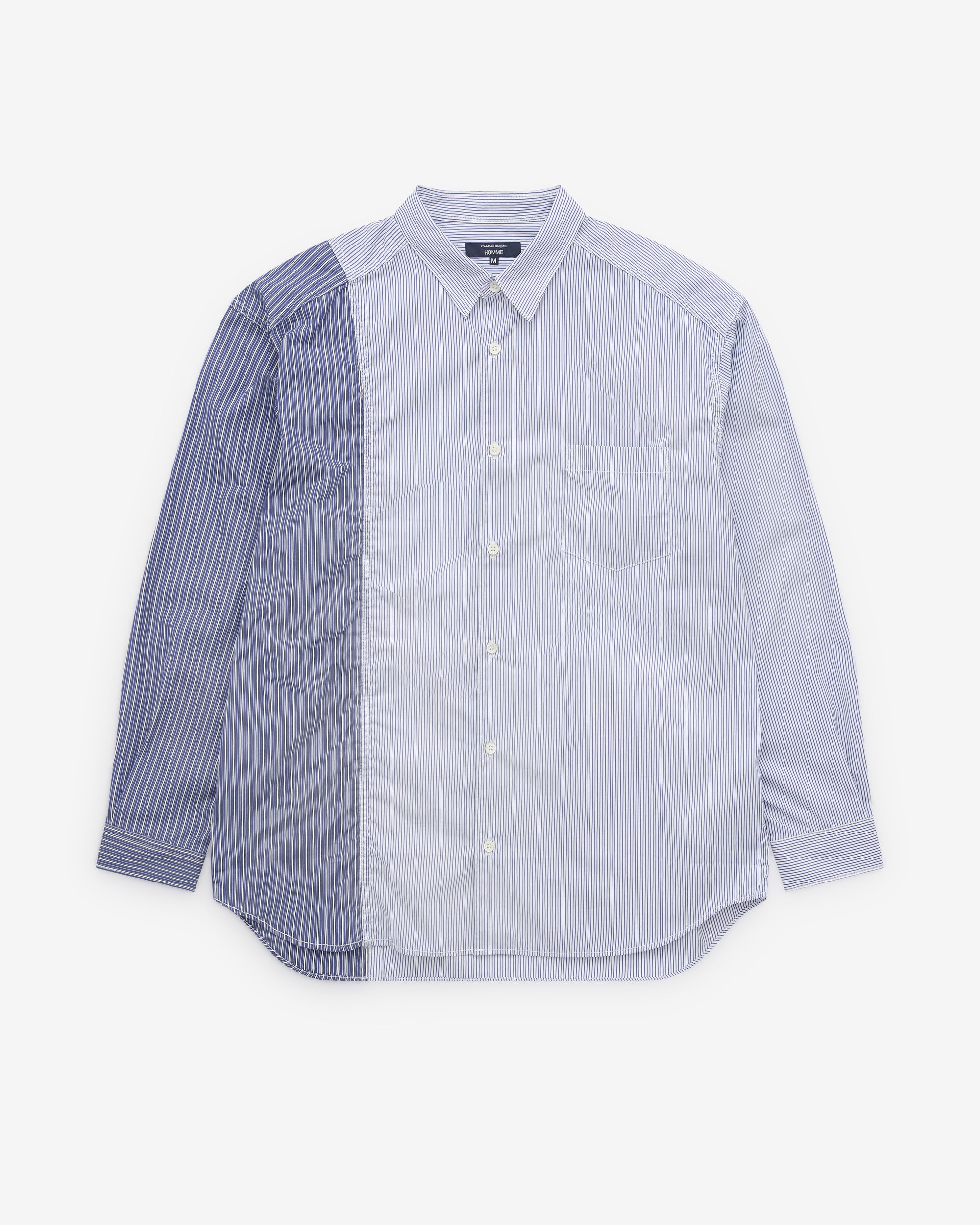 Point collarCurved hemPatch chest pocketButton placketButton cuffsContrast stripe panelling