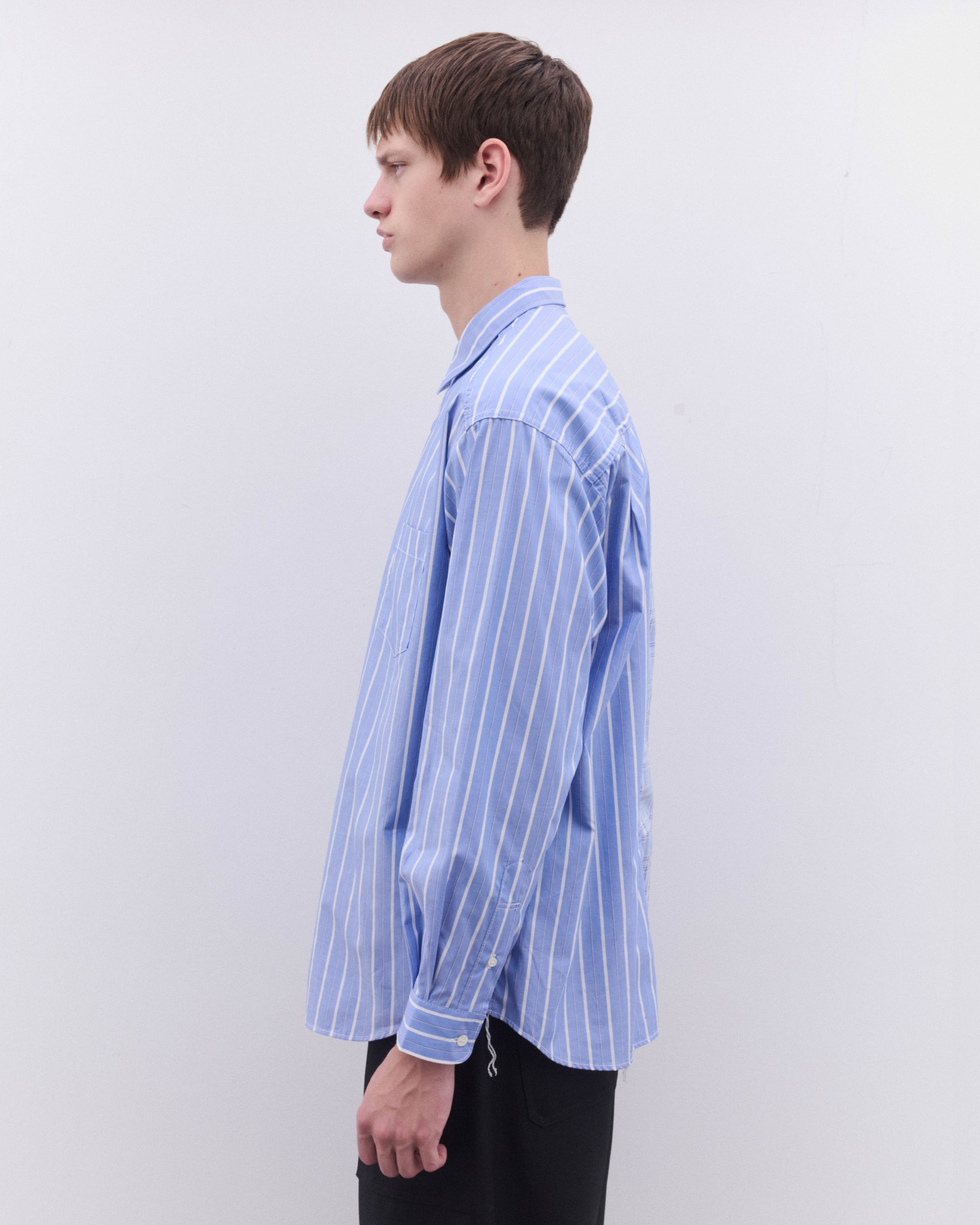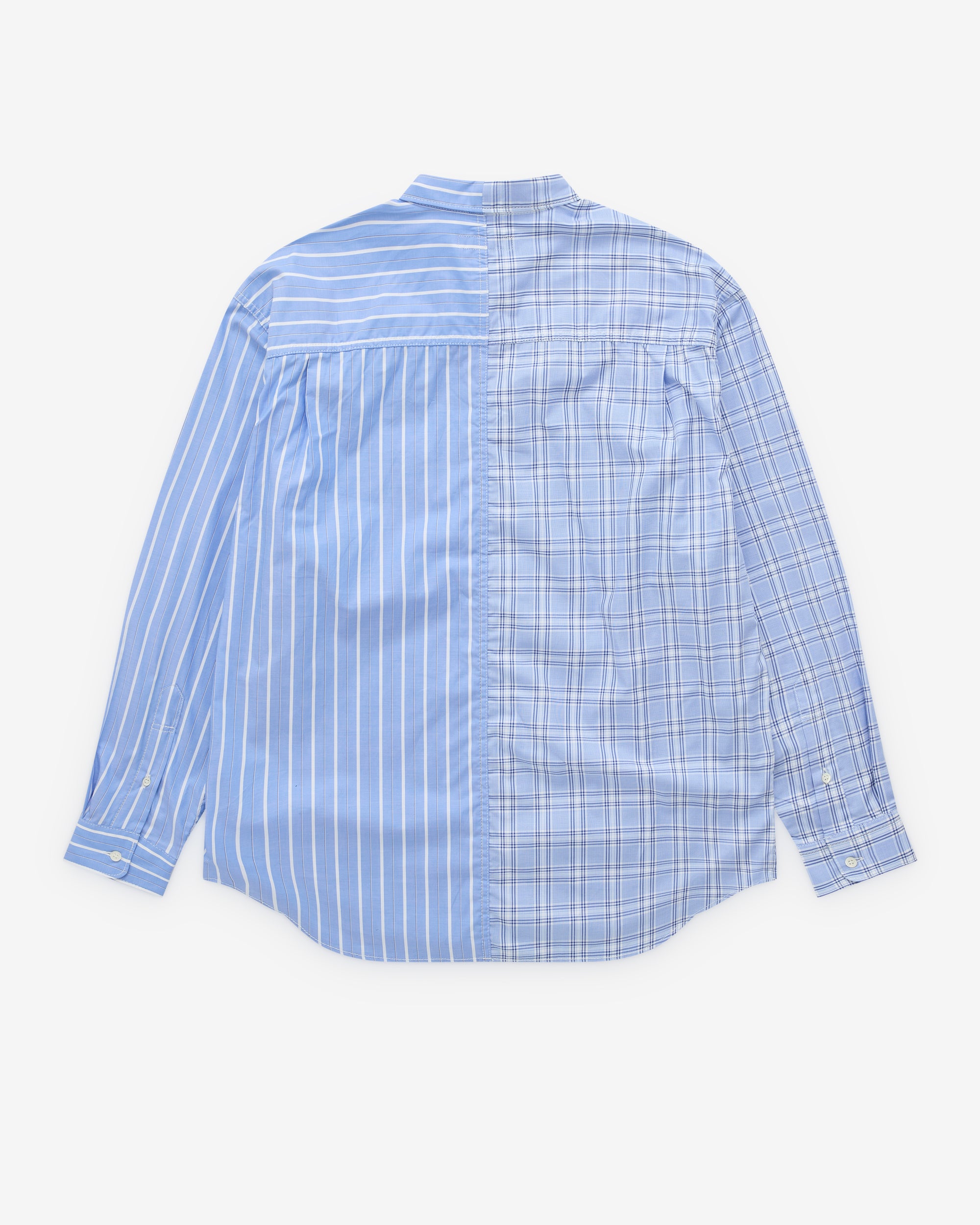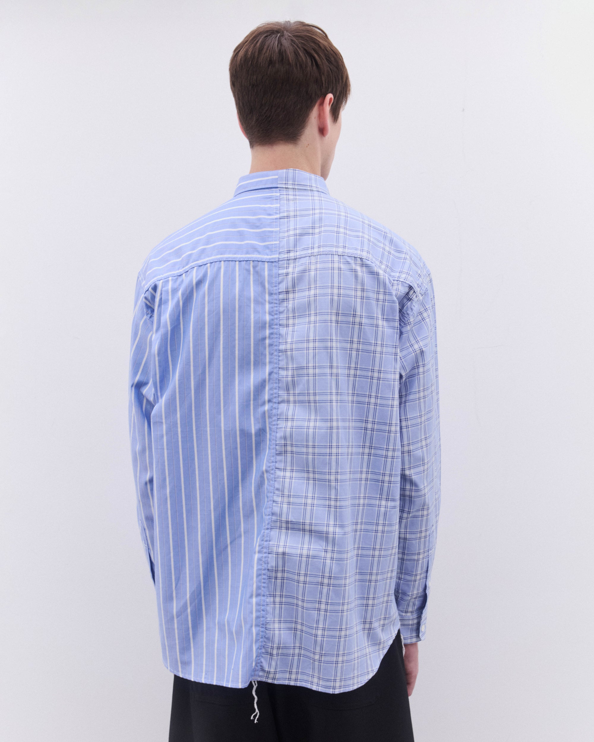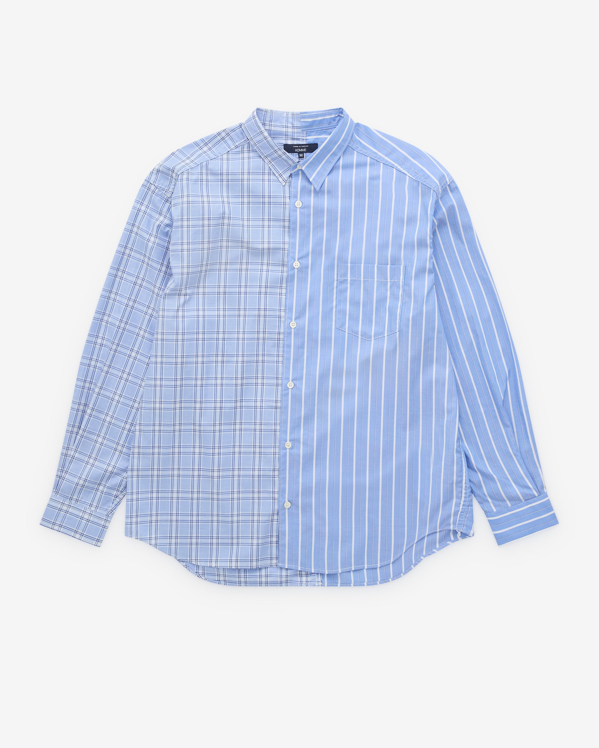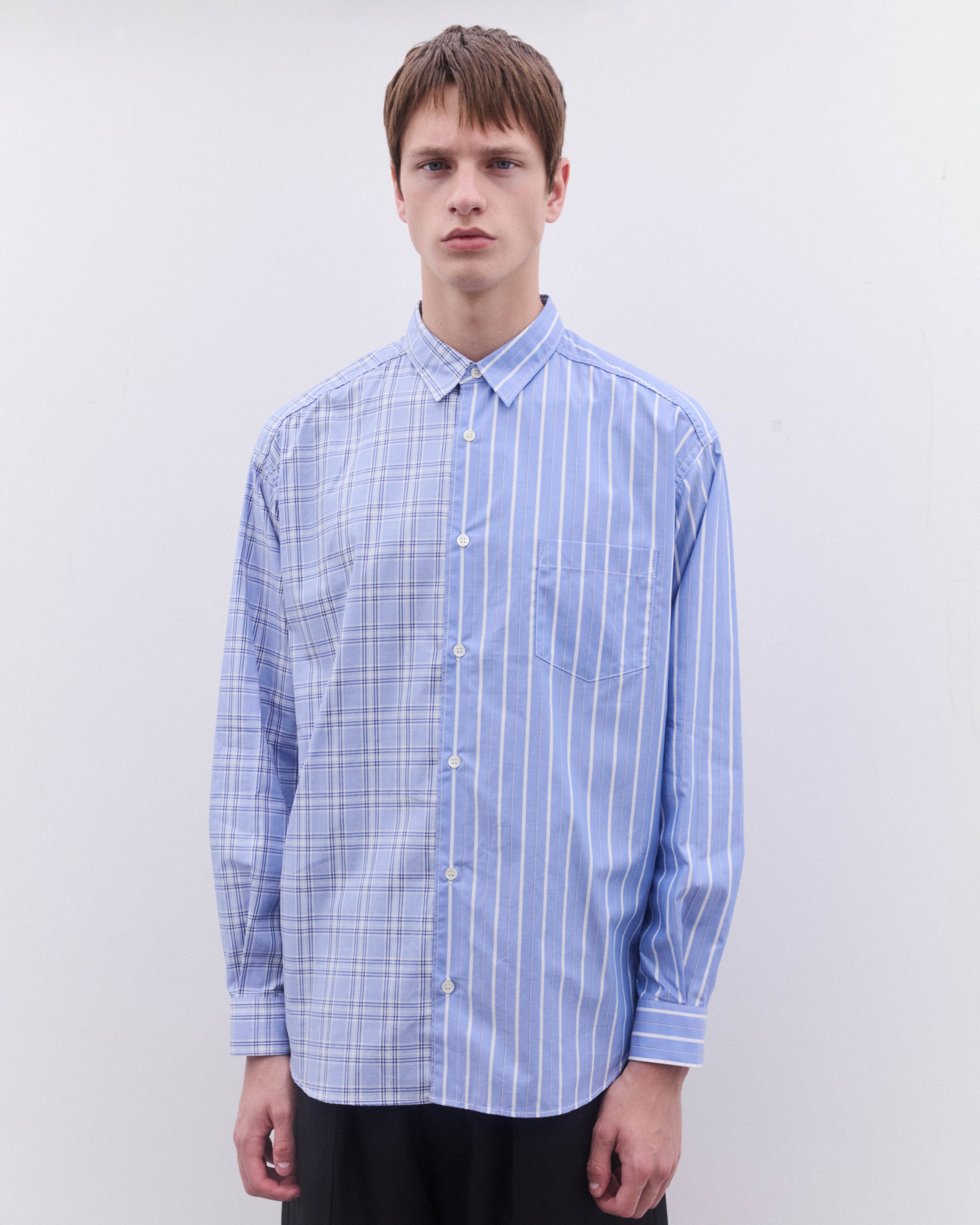 Point collarCurved hemPatch chest pocketButton placketButton cuffsHalf checked, half striped