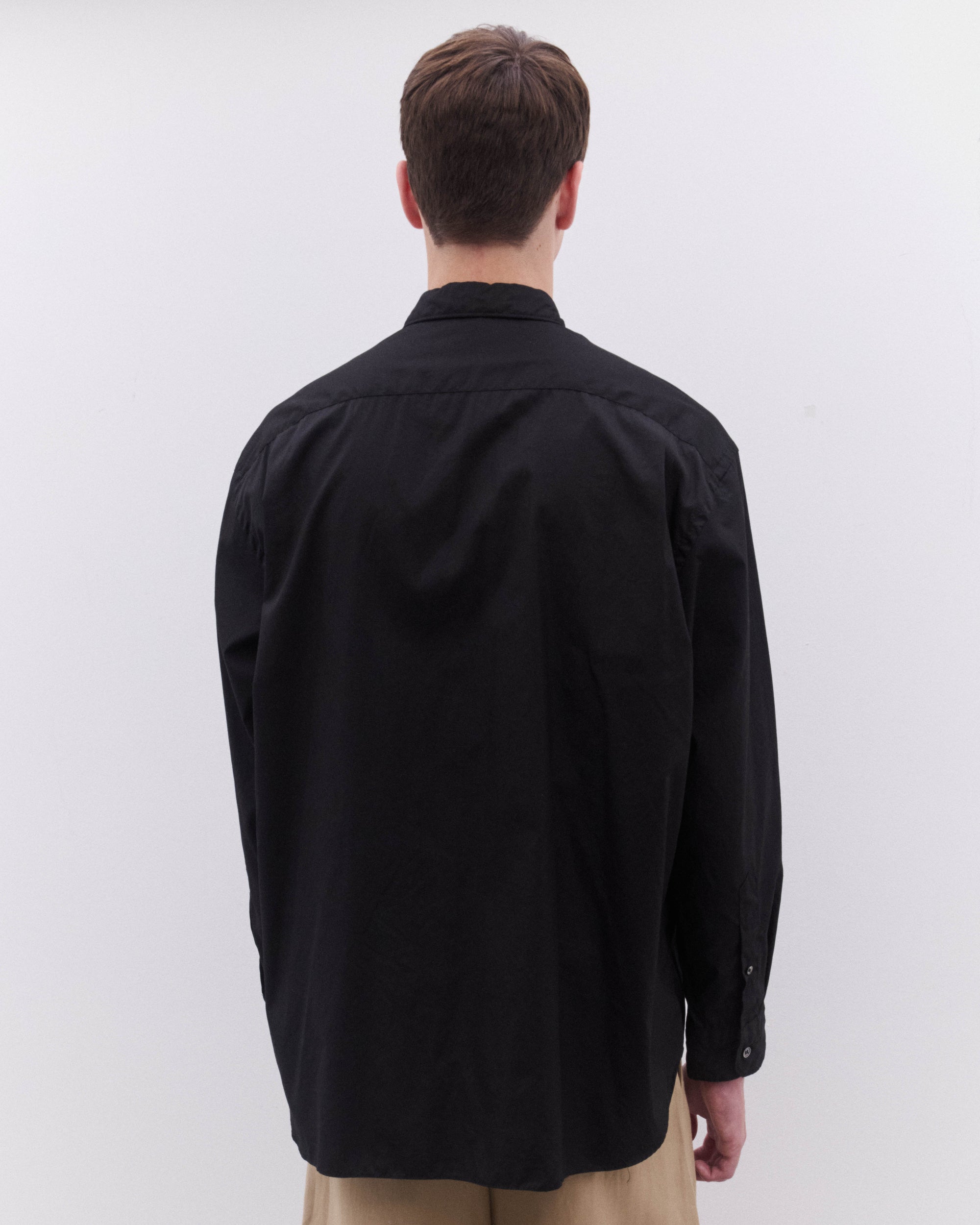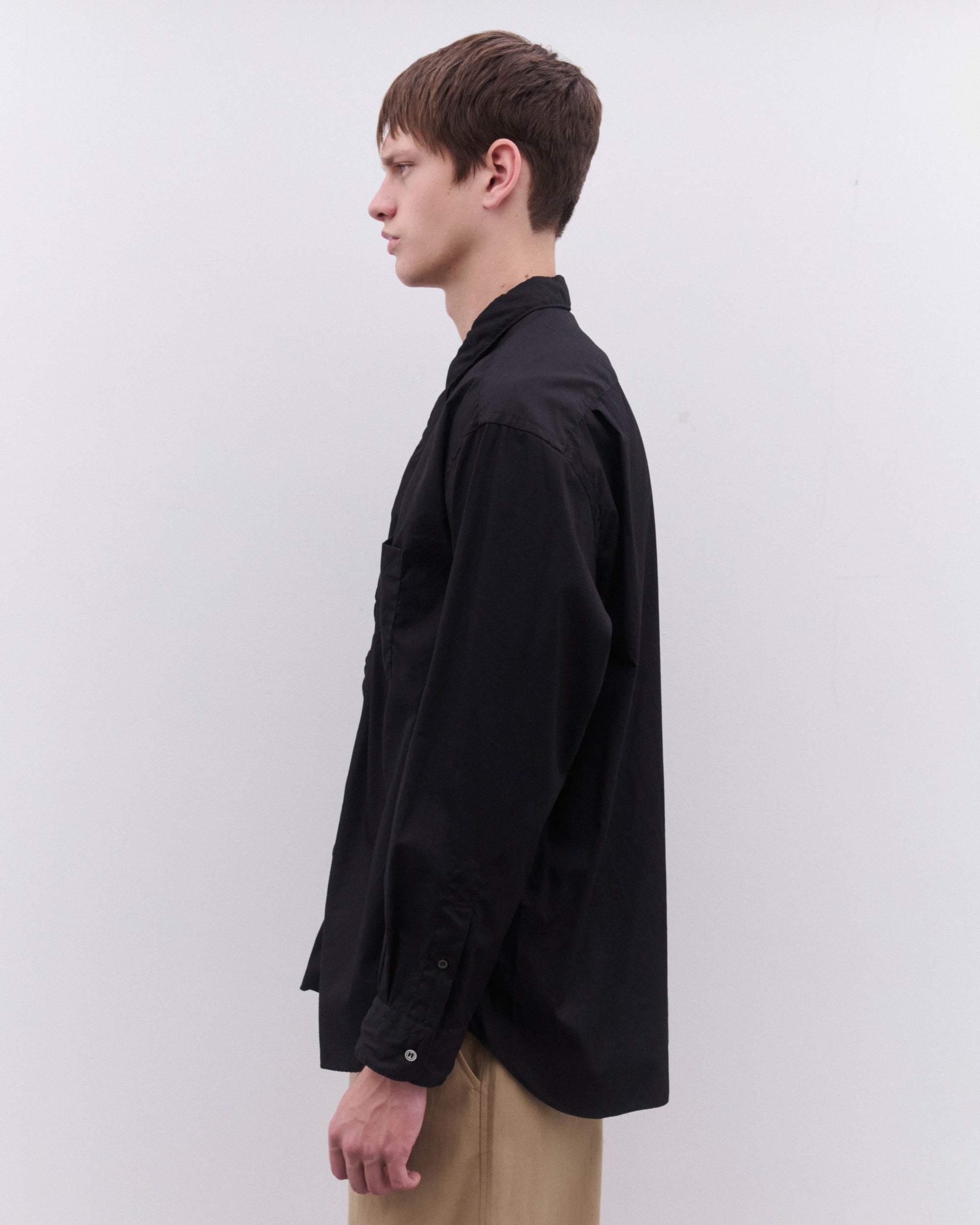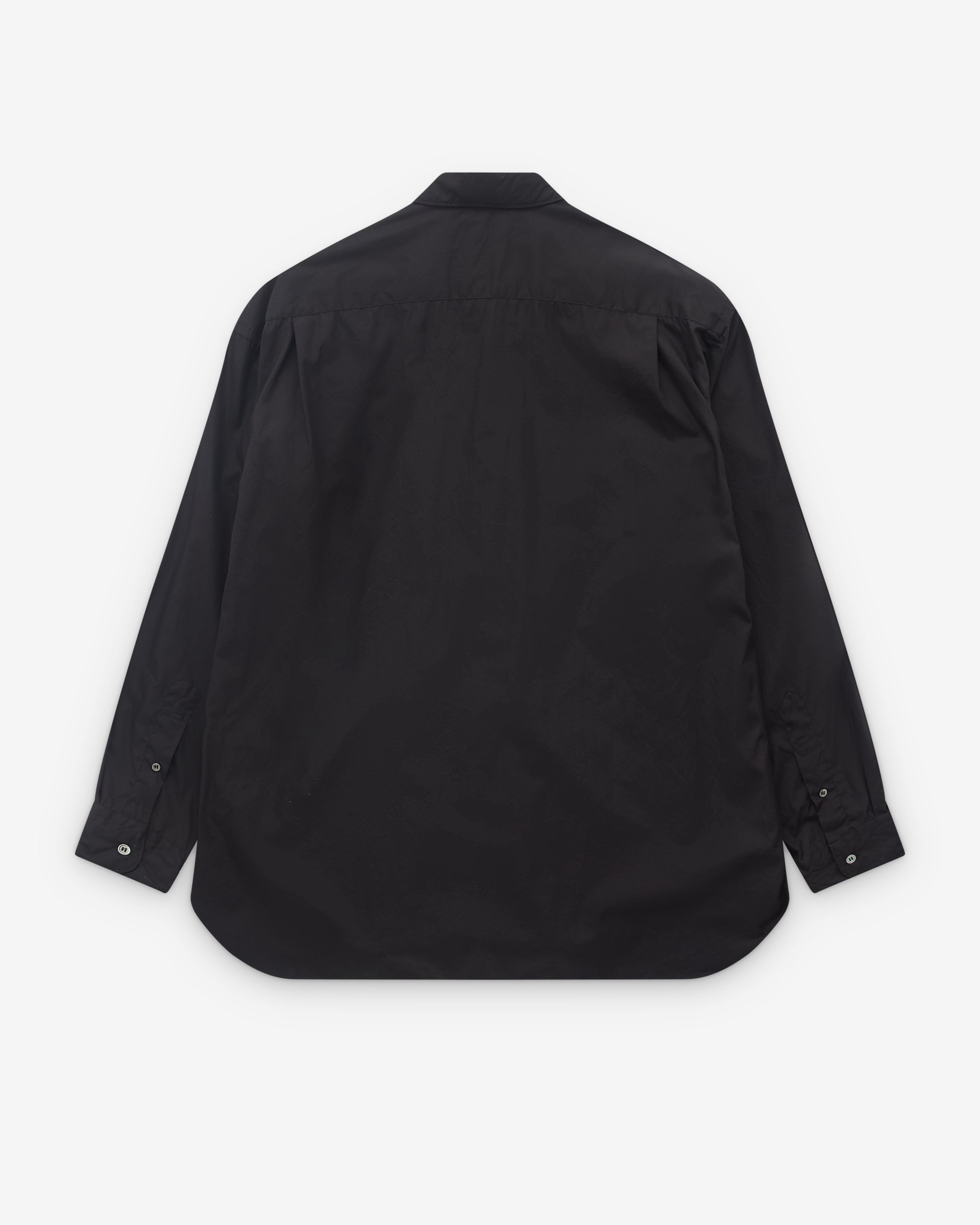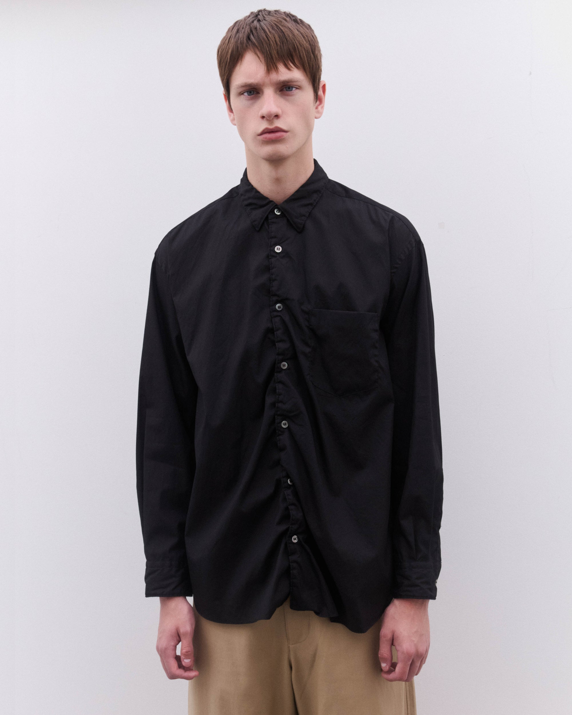 Point collarCurved hemPatch chest pocketButton placketButton cuffsDecorative puckering at placket